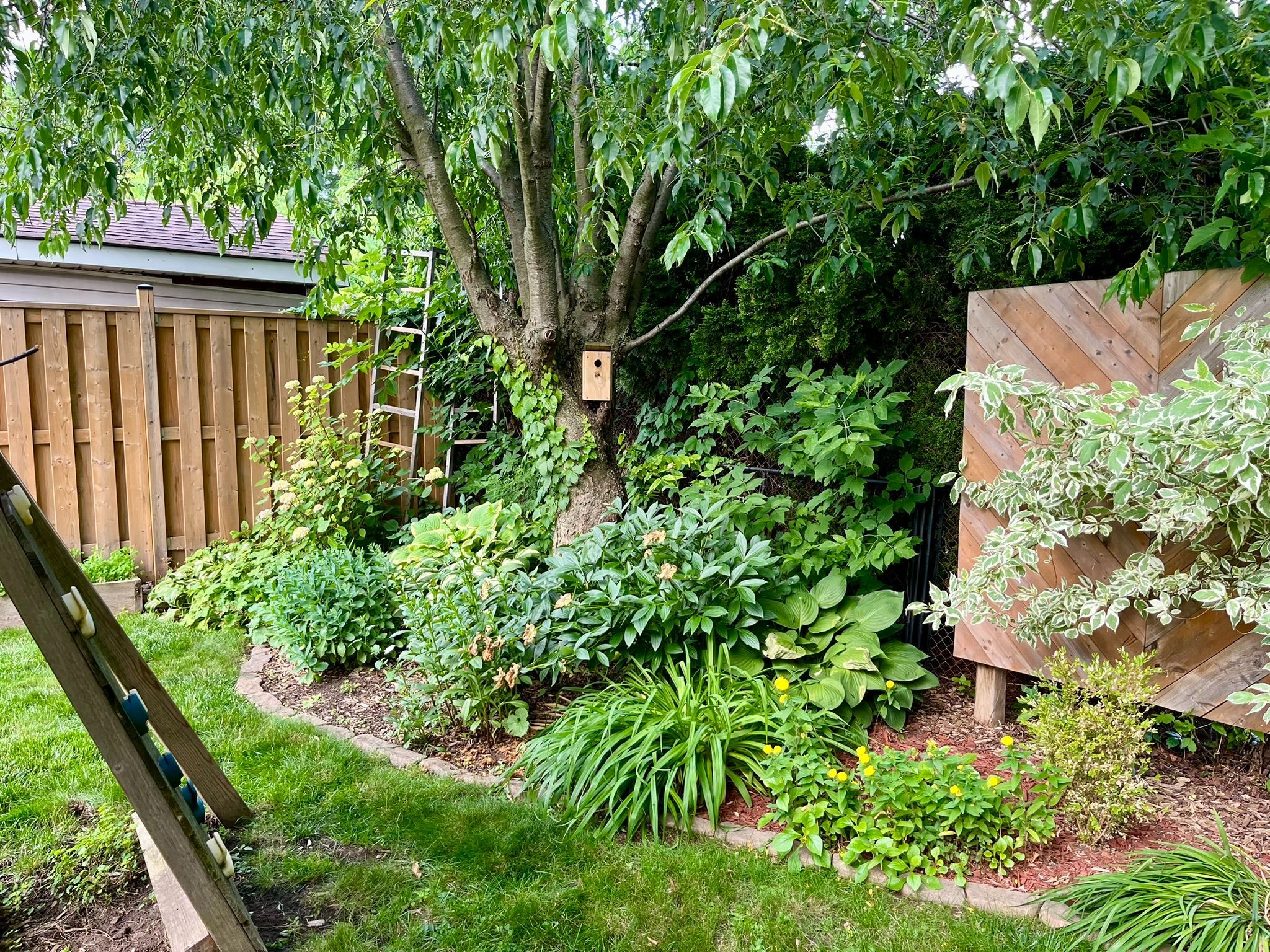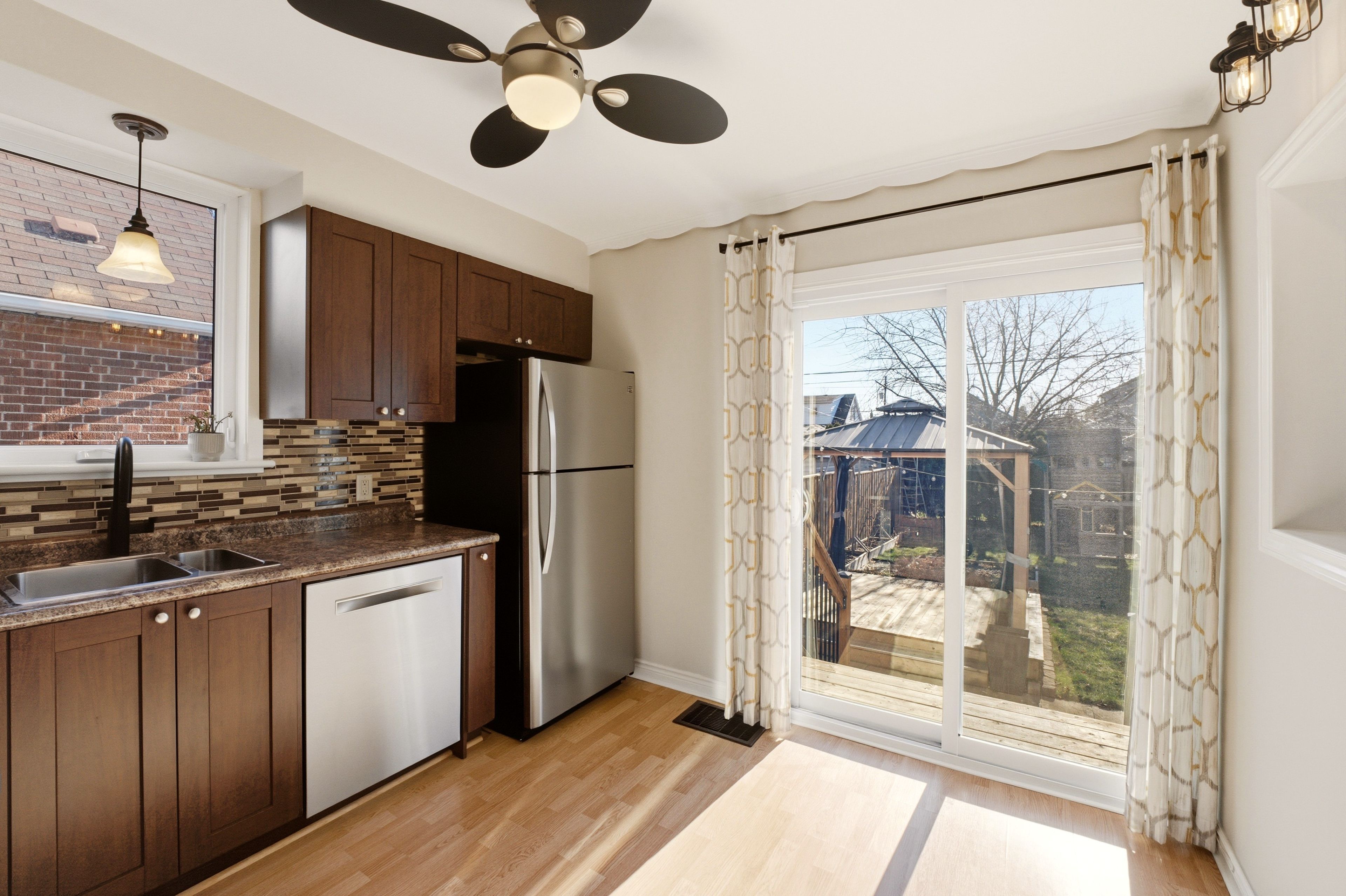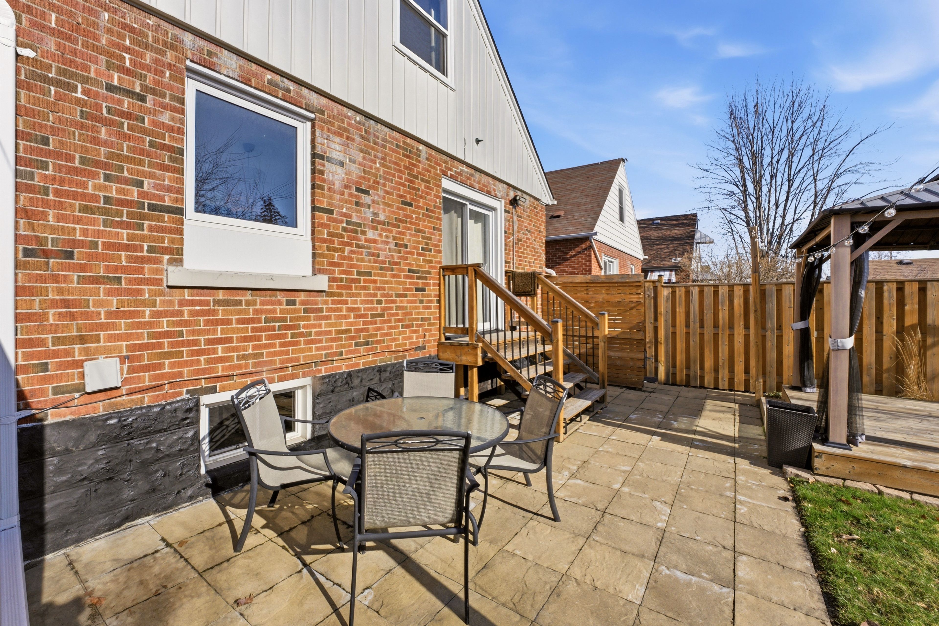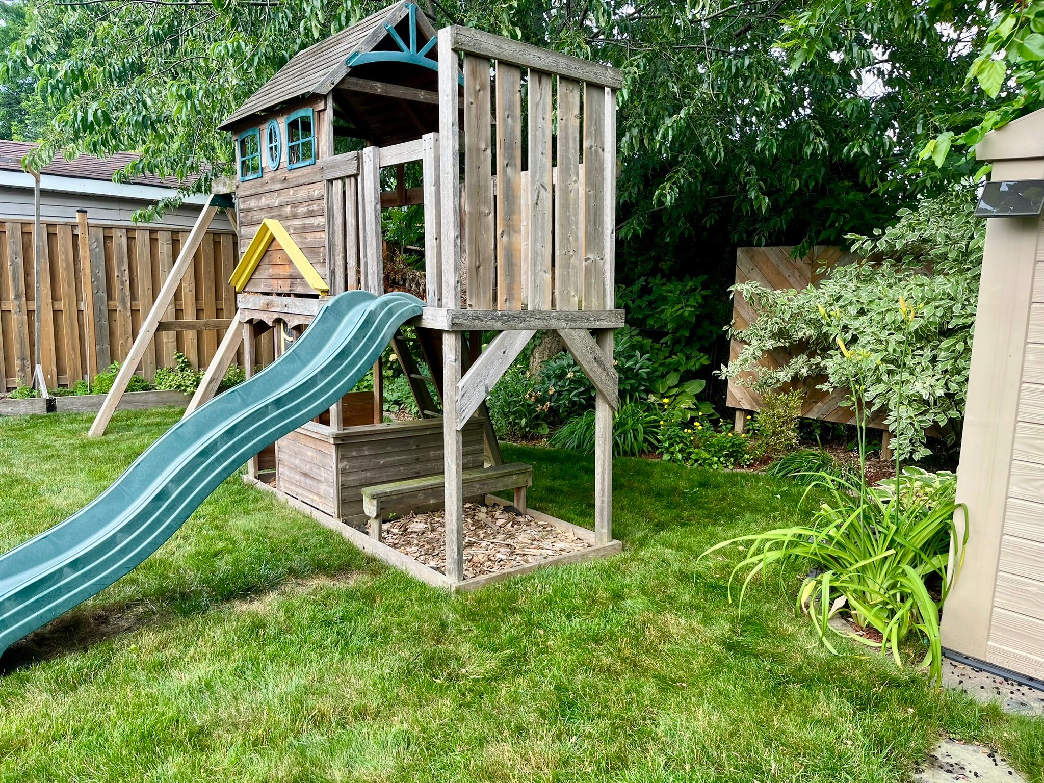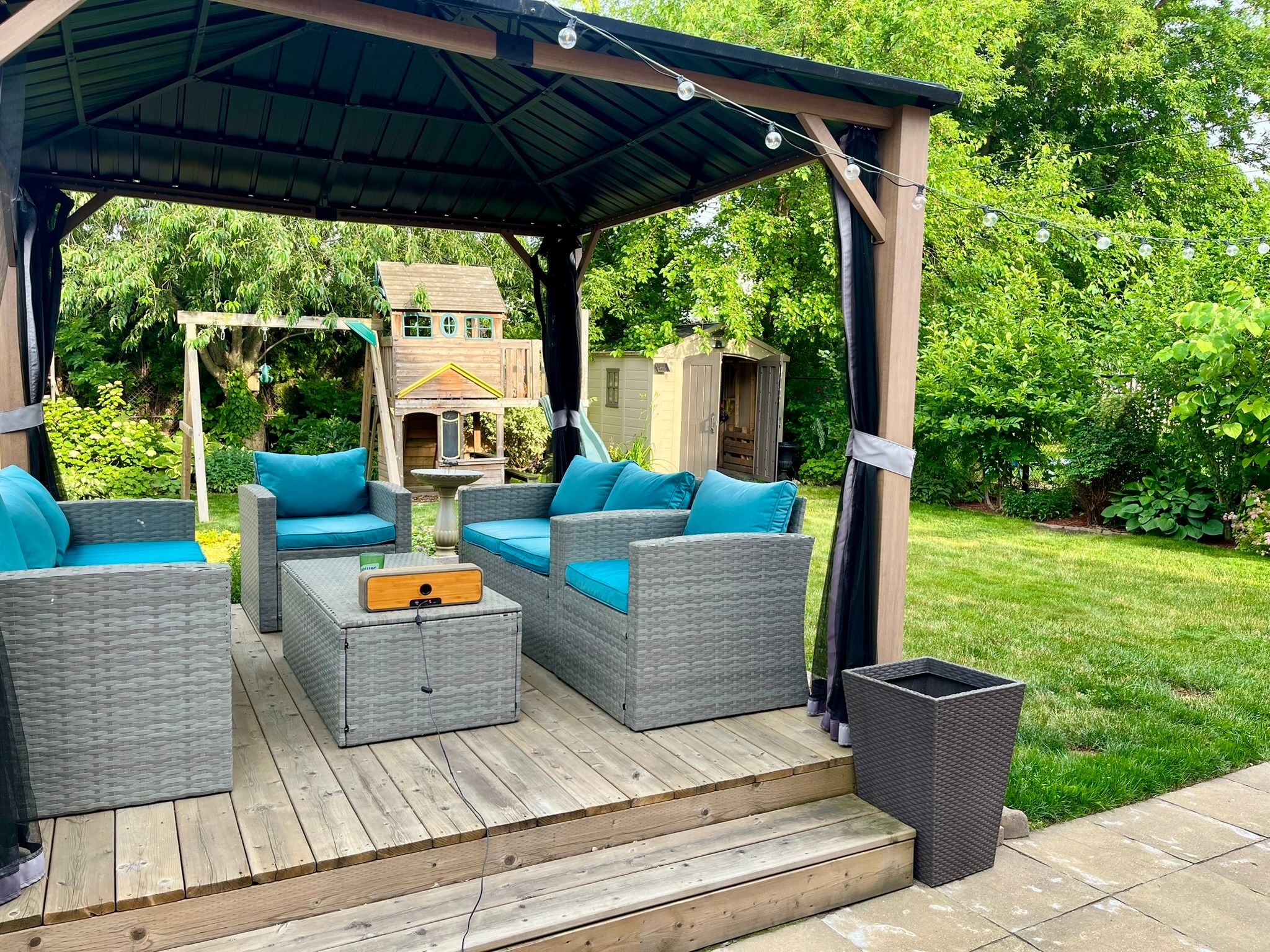 • Large, fenced backyard with gazebo, shed, and play structure.