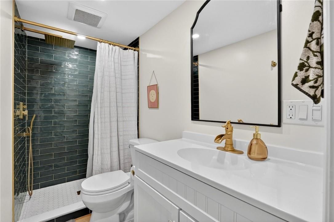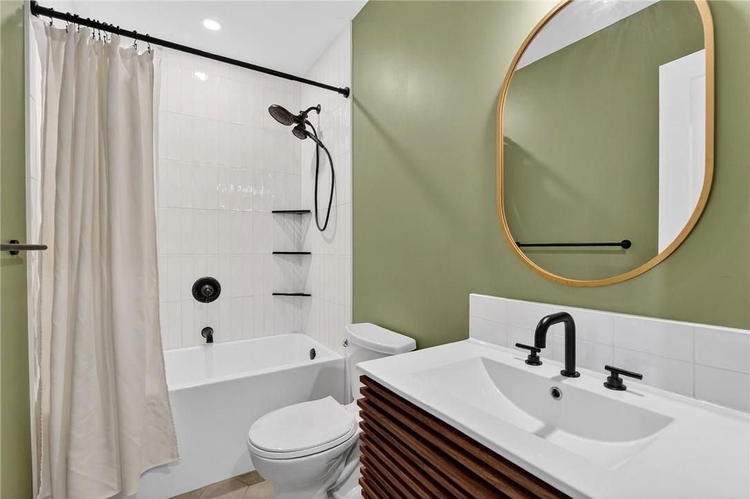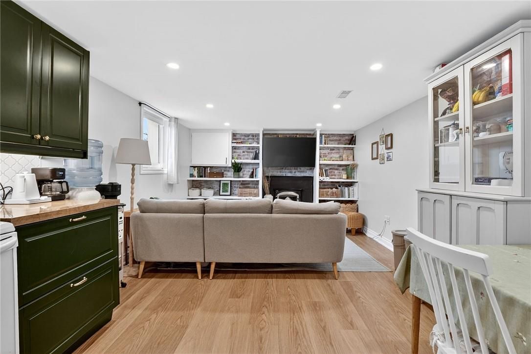 • Basement unit features modern kitchen, living area, and stylish bathroom.