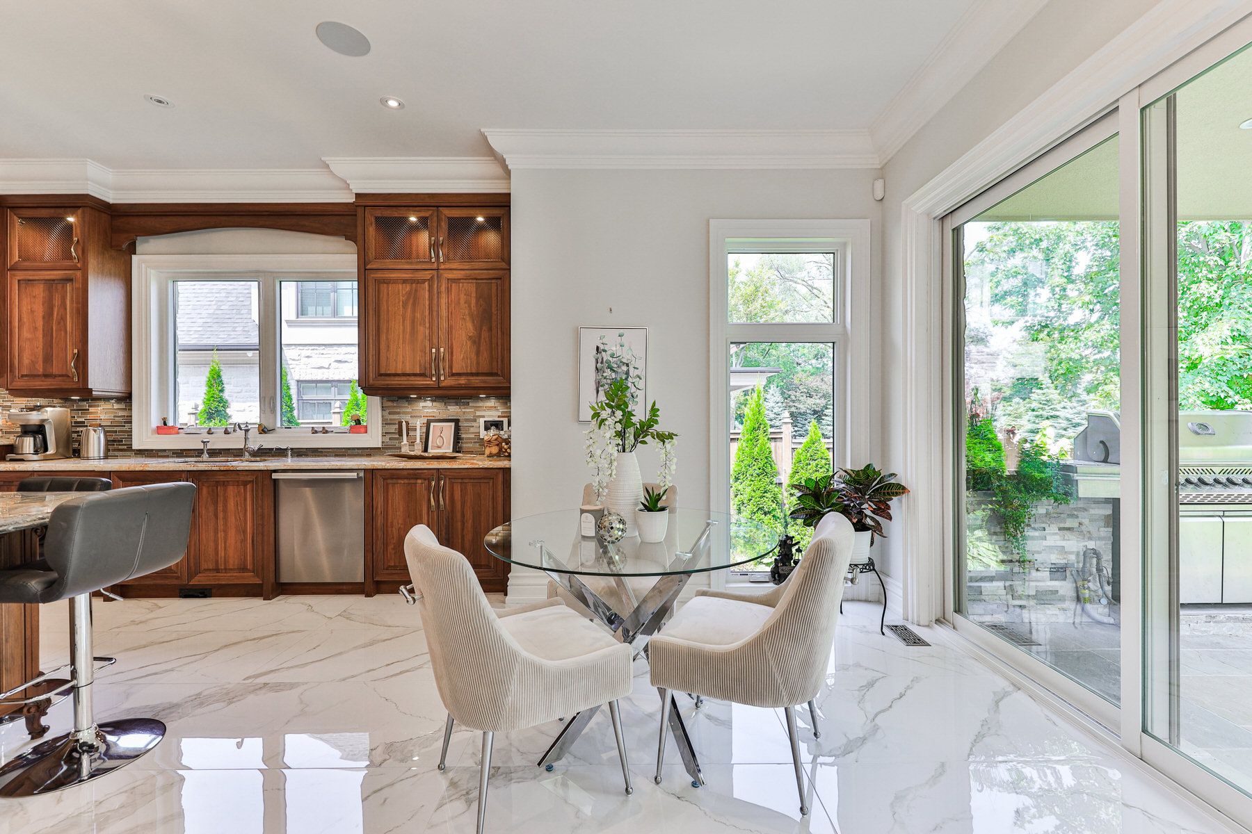 1511 broadmoor avenue unveils an extraordinary custom estate in the heart of mineola, a coveted neighbourhood celebrated for its tree-lined streets, expansive properties & distinguished residences. Designed by new age design & expertly crafted by amiri homes, this residence blends architectural sophistication w/ exceptional functionality, offering a refined lifestyle on a rare & pvt 106 x 164 ft lot surrounded by mature greenery. Offering 4+3 bdrms, 8 baths & approx 9,280 sqft of finished living space, the home is thoughtfully designed to accommodate both elegant entertaining & comfortable multigenerational living. A grand circular driveway welcomes guests & provides parking for up to 12 vehicles, leading to a discreet side-entry 2-car garage. The stately exterior is framed by a covered front porch w/ elegant sconces & soft pot lighting. Grand mahogany doors open to interiors defined by soaring ceilings, limestone archways, custom millwork, skylights & expansive windows that fill the home with natural light. Carefully layered lighting & timeless finishes create an inviting yet sophisticated atmosphere throughout the residence. Designed for both everyday living & memorable gatherings, the main lvl offers a balance of formal & casual spaces, including an exceptional main-floor primary retreat & a chef-inspired kitchen that blends timeless design w/ outstanding functionality. The upper lvl features 3 generously sized bdrms, each w/ its own ensuite, along w/ the convenience of a 2nd laundry area. The lower lvl is a destination of its own, showcasing a pvt home theatre, fitness area, expansive rec room w/ wet bar & a fully self-contained in-law suite complete w/ kitchen, bedroom, laundry & walk-up access to the bkyd. Outdoors, a tranquil bkyd retreat awaits. A covered patio w/ skylights, b/i speakers & a napoleon outdoor kitchen overlooks the landscaped grounds & a custom garden shed, creating an exceptional setting for outdoor entertaining & quiet relaxation alike.
