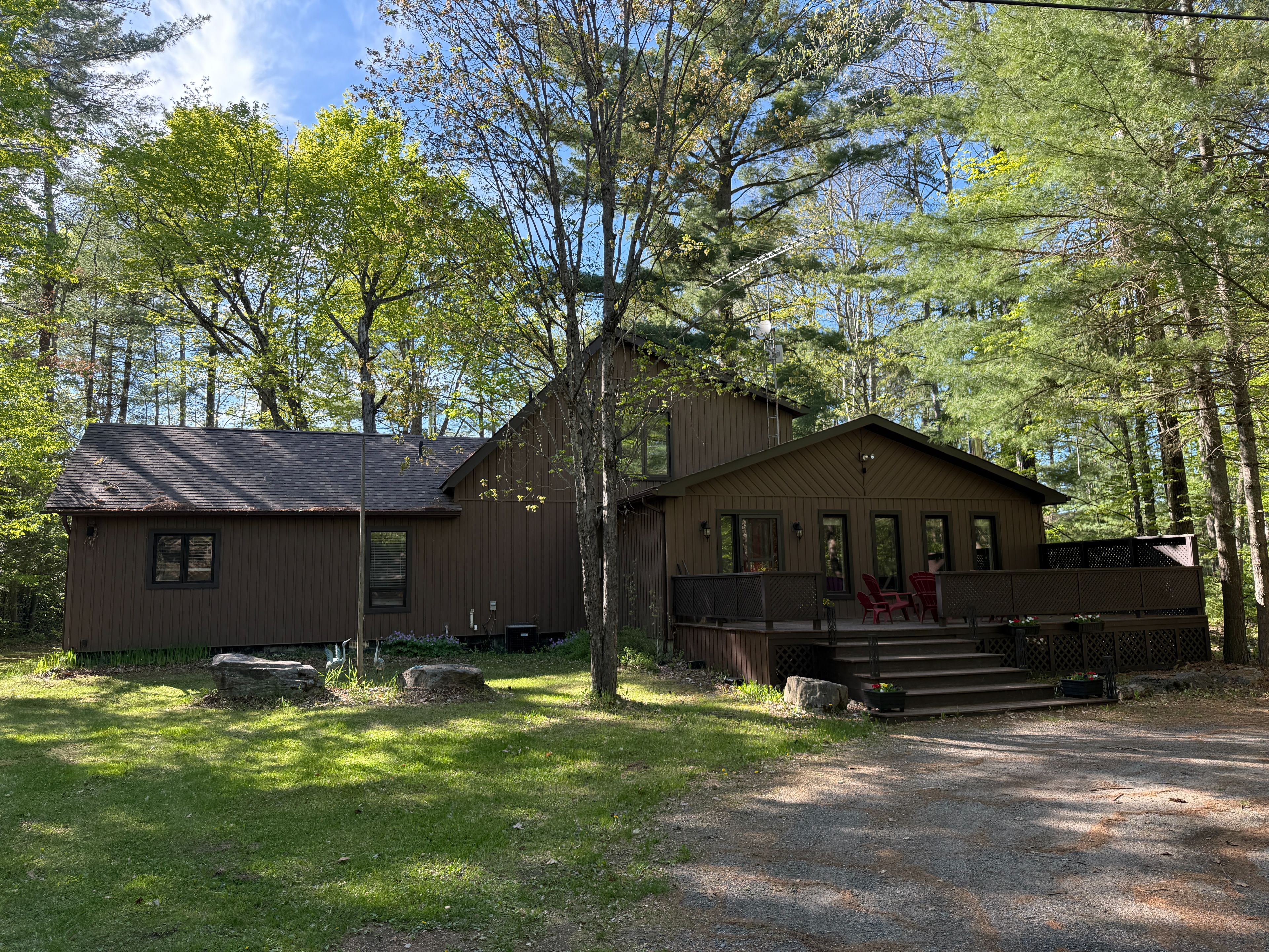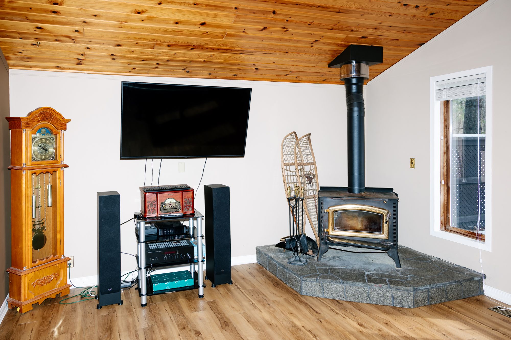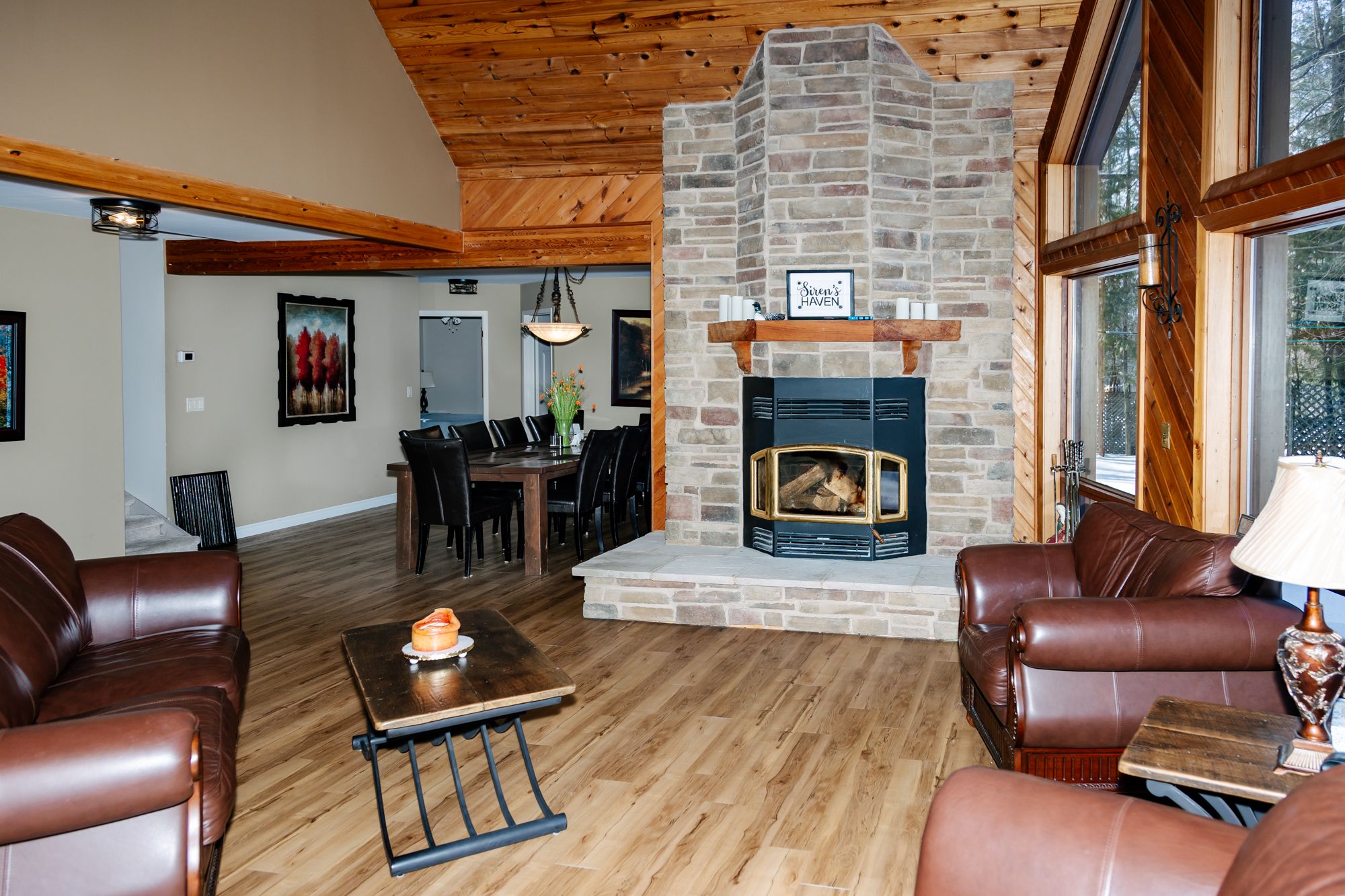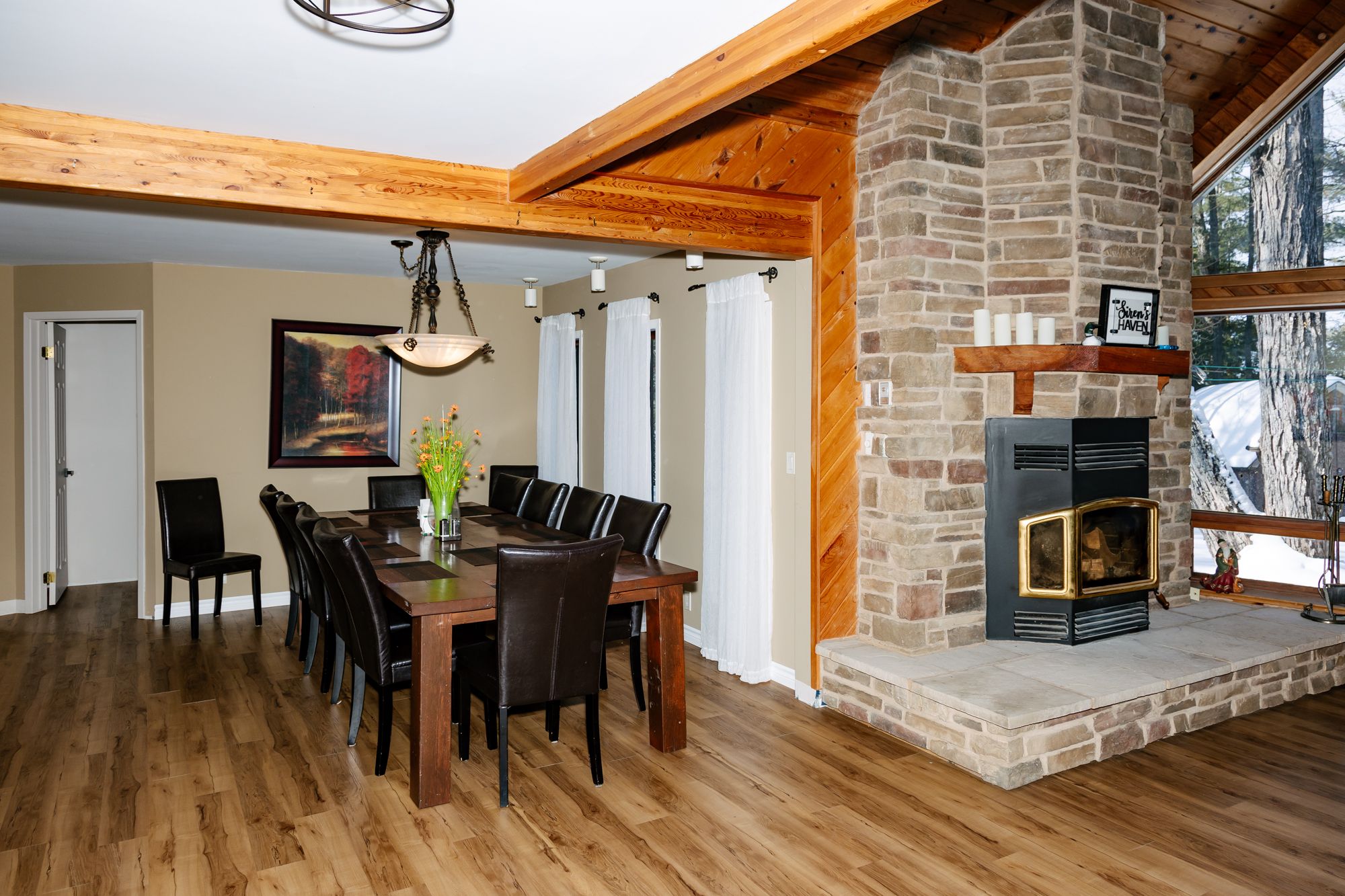 Set on a private, well-treed lot between carnarvon and minden, this spacious home offers a quiet setting just a short walk to twelve mile lake's public beach and the well-known peppermill restaurant. Positioned back from the highway for added privacy, the property also includes an 8' right of way to the lake, providing access to a beautiful shoreline and views across the desirable three-lake chain. With approximately 2,800 sq ft of living space, the home features 4 bedrooms and 3 bathrooms, with a layout that works well for both everyday living and hosting. The open-concept living room is bright and inviting, highlighted by floor-to-ceiling windows and 20' cathedral ceilings. The second-floor primary suite overlooks this space with a juliette balcony and includes its own private ensuite. Two wood stoves provide added warmth, while the generous dining area offers plenty of space to gather. A 48' x 24' garage with an attached woodshed adds practical storage and room for vehicles or hobbies. With a combination of privacy, lake access, and close proximity to local amenities, this property offers a flexible option for families or those looking to enjoy the haliburton lifestyle.