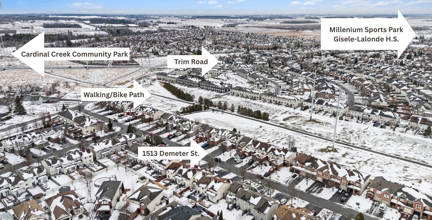 Open house sunday march 22 @ 2:00 - 4:00. Welcome to 1513 demeter street in the heart of orleans, with no rear neighbors and backing onto a bike/walking path. Lots of new upgrades: garage door 2025, roof 2024, windows/patio door/furnace/ heatpump/ hwt/ev charger all in 2023, carpet 2018. This 3 bedroom, freehold townhome is in a great location with a short walk to schools and parks and only a 5 minute drive to sobeys, starbucks, shoppers drug mart, metro, farmboy, home depot, and more. Main floor boasts a sunken foyer, 2 piece powder room, living and dining room with hardwood floors and an open kitchen with stainless steel appliances, ample counter space and loads of cabinets. Second floor with newer carpet, 3 good sized bedrooms including a huge primary, and an oversized main bath with soaker tub and seperate shower. Lower level is sun soaked thanks to the floor to ceiling windows in the staircase and is a great space for the family room, plenty of storage and the laundry area. Private backyard is fully fenced with a deck and patio area that's ideal for bbq's and relaxing. Extra long driveway with room for 3 cars, and a landscaped front entrance. Don't wait to see this home... With its recent upgrades and location it probably won't last long! Water $100/2 months, hydro $120-$200 ($40-80 of that is ev charging), gas $50/month (all utilities are rough averages). 48 hours irrevocable on all offers as per form 244.
