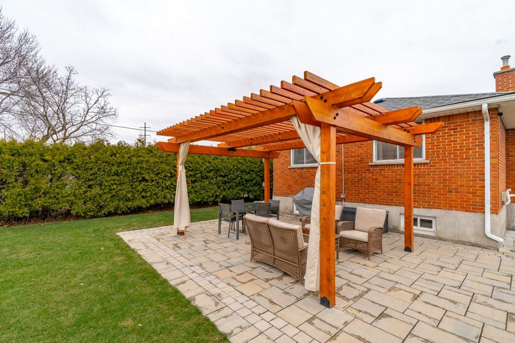 • Large pie-shaped backyard offers privacy, a pergola, and room for relaxation.