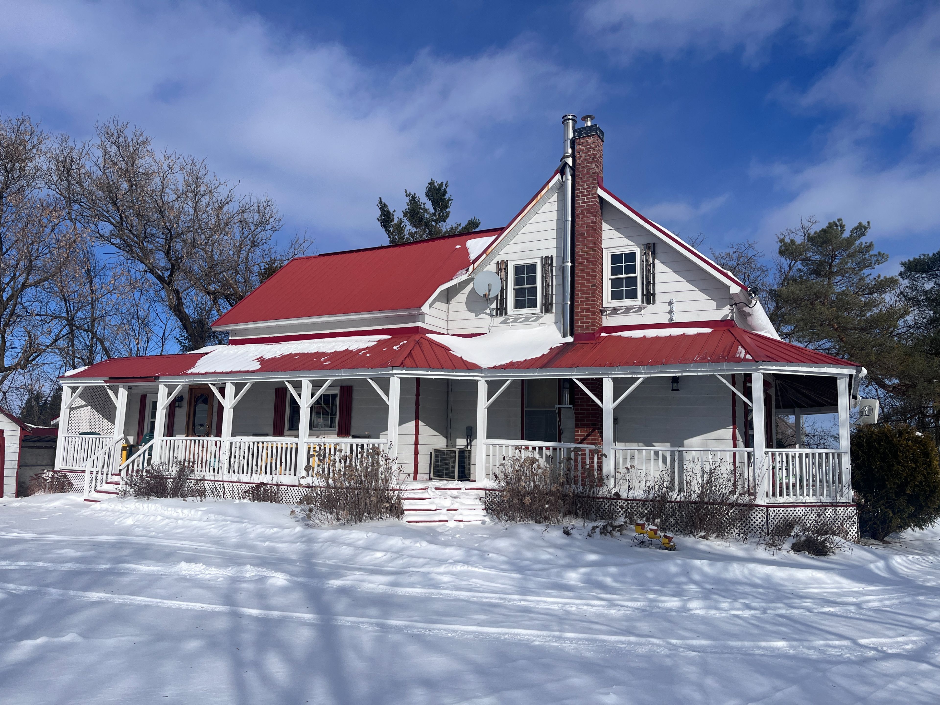 • Rustic farmhouse with wrap-around porch and spacious living areas.