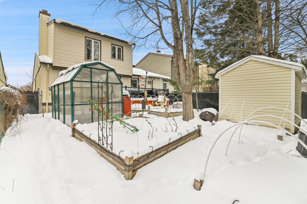 • Fenced rear yard features a deck, greenhouse, and garden beds.