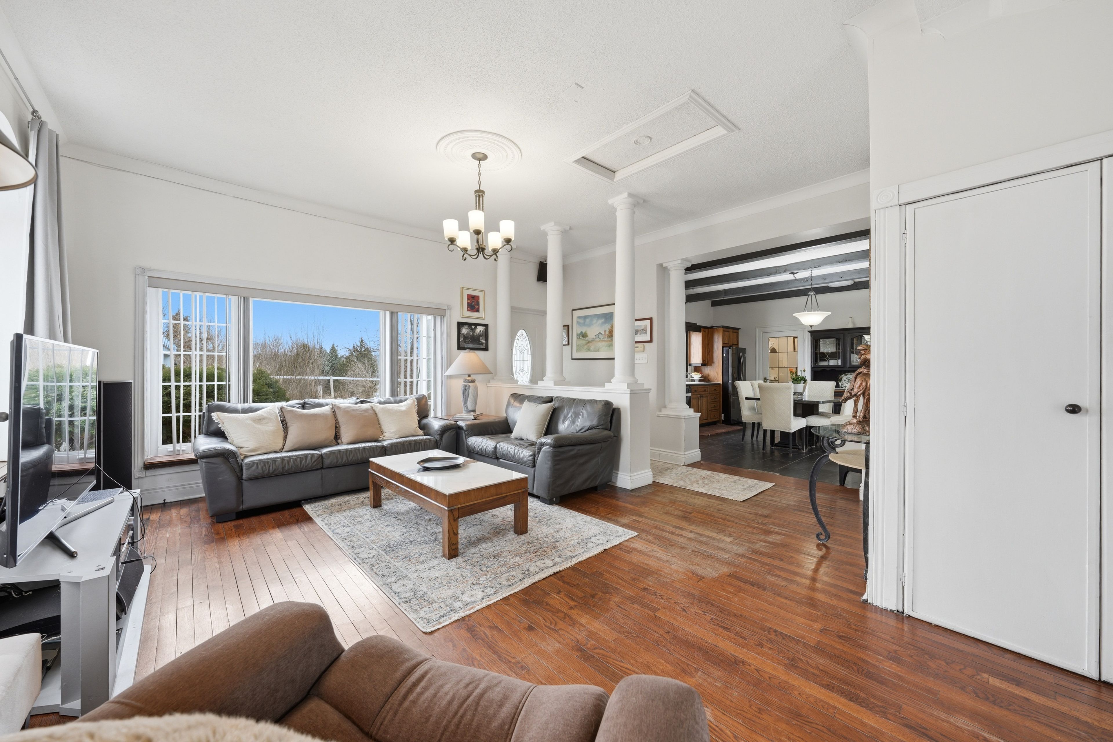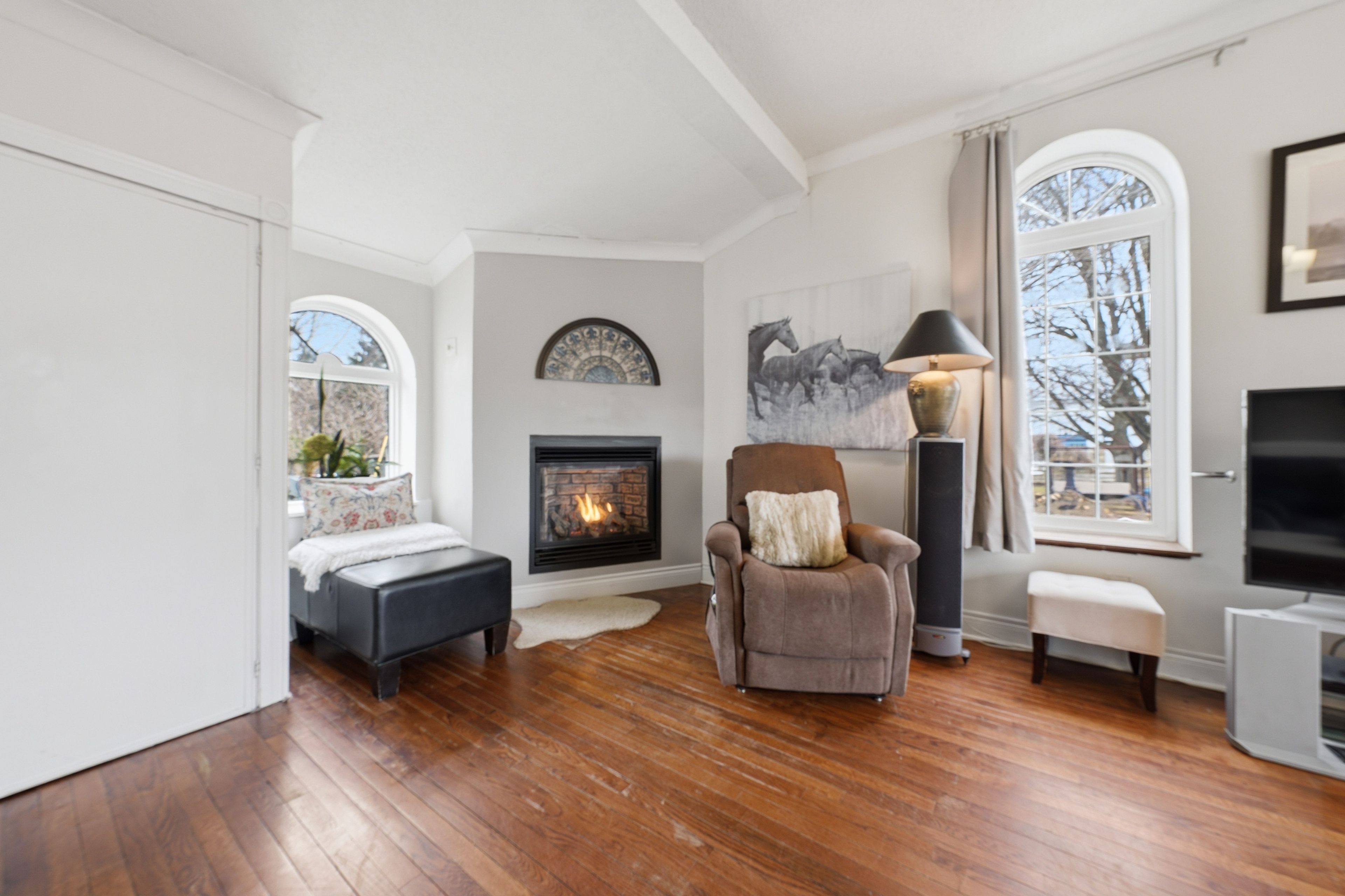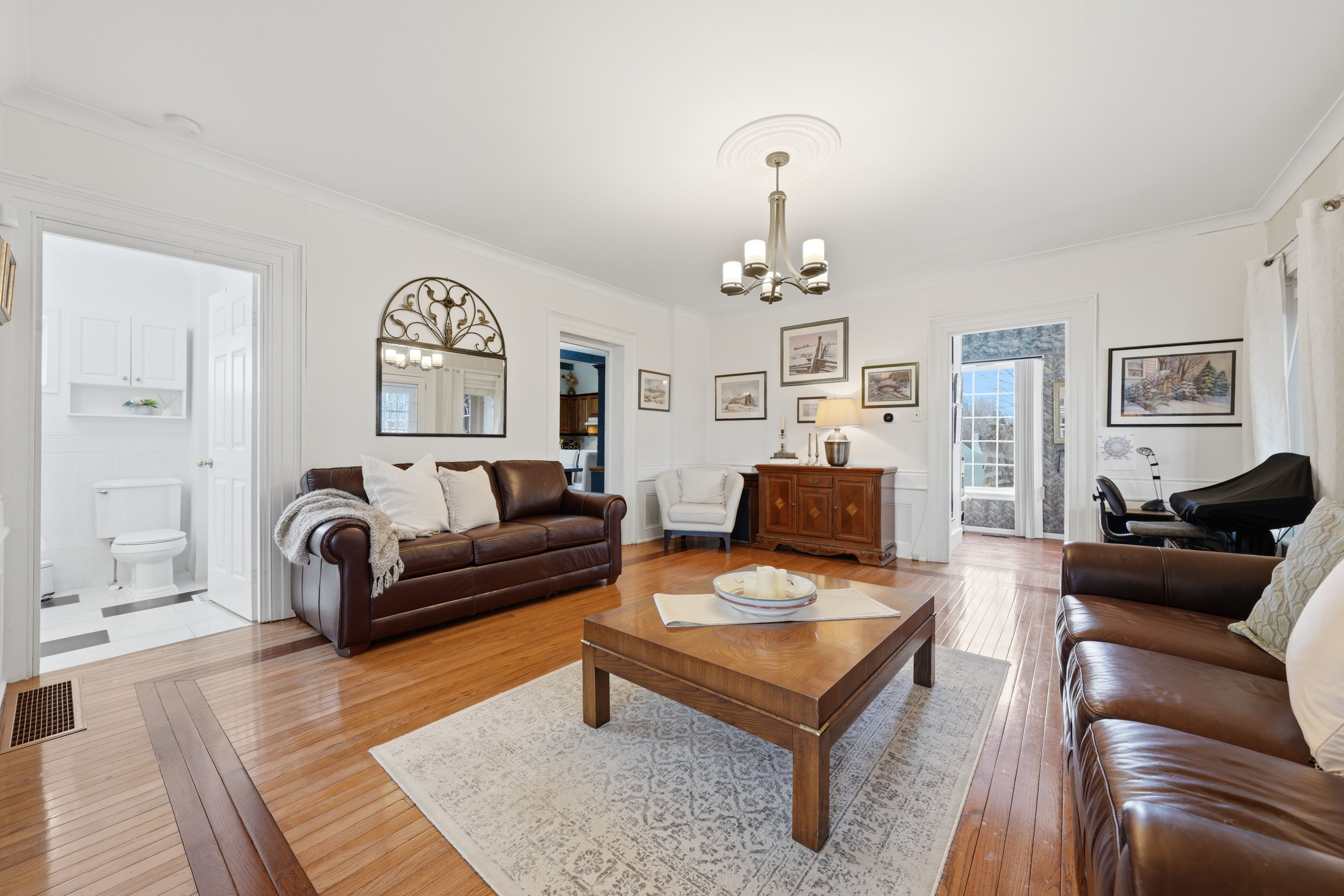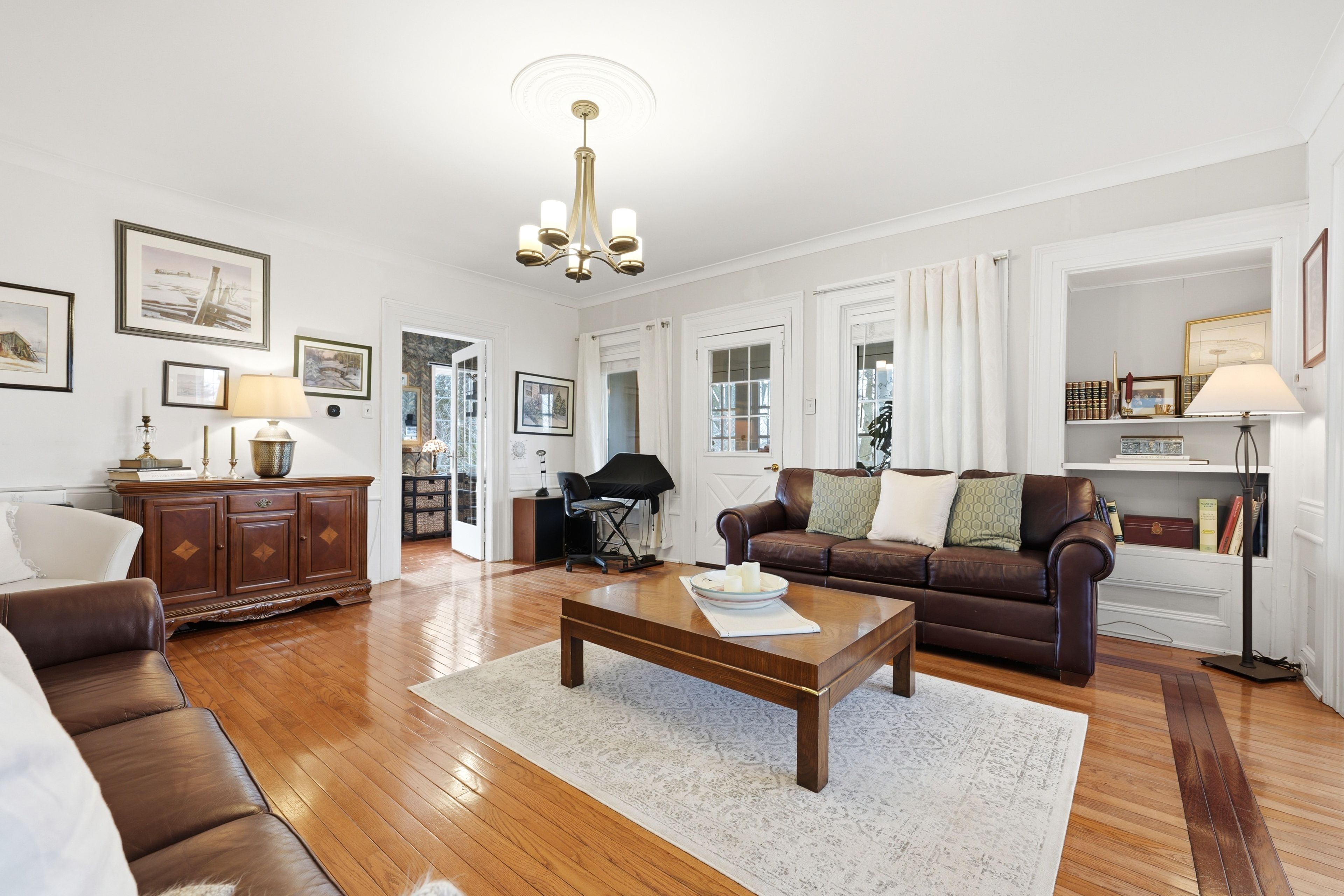 • Bright family room with hardwood flooring and open layout.