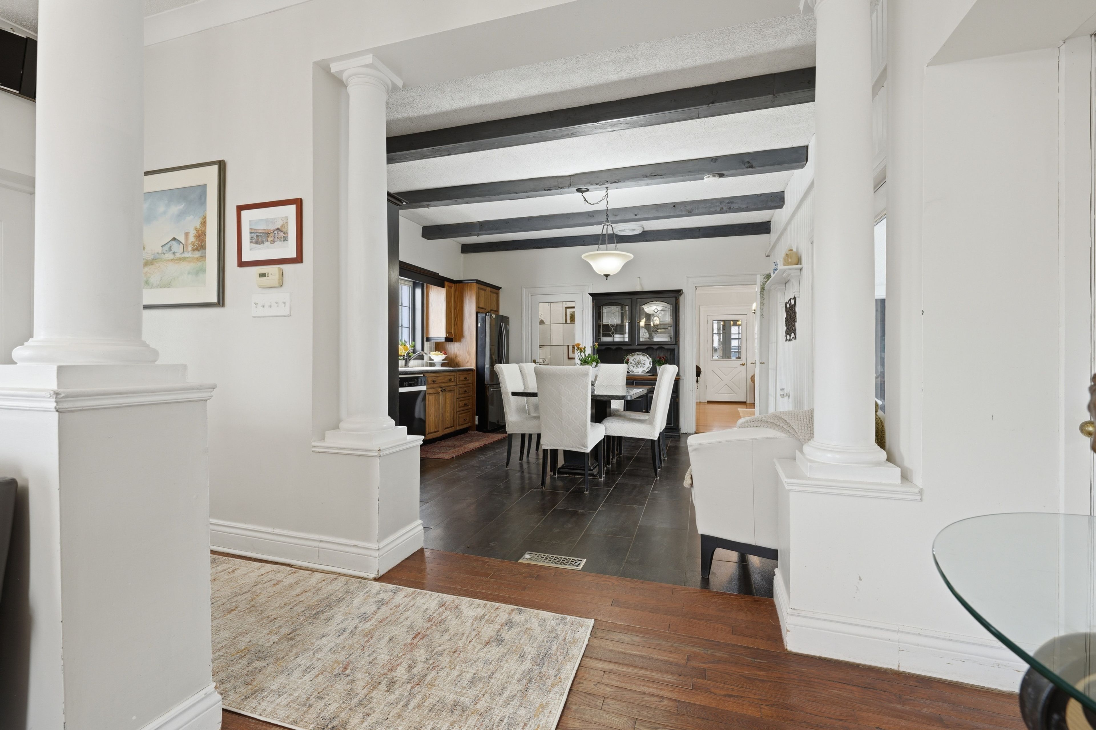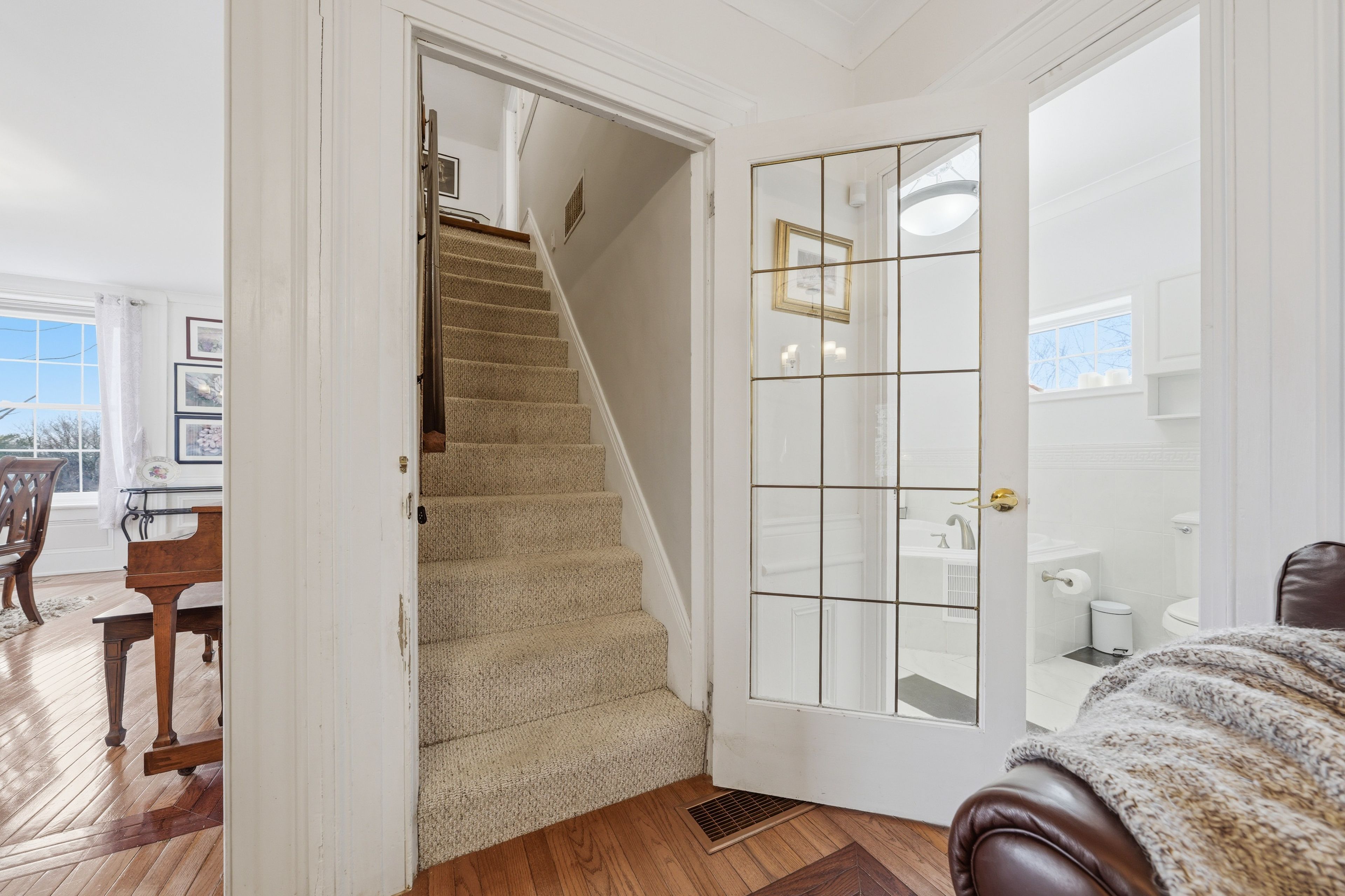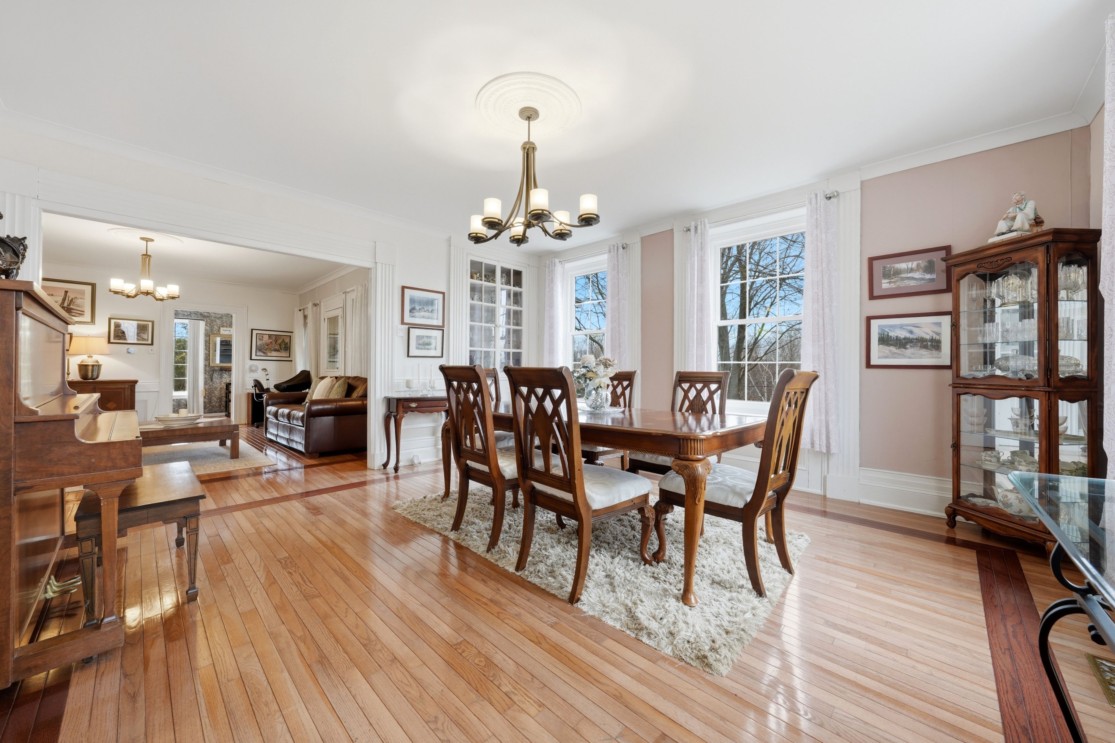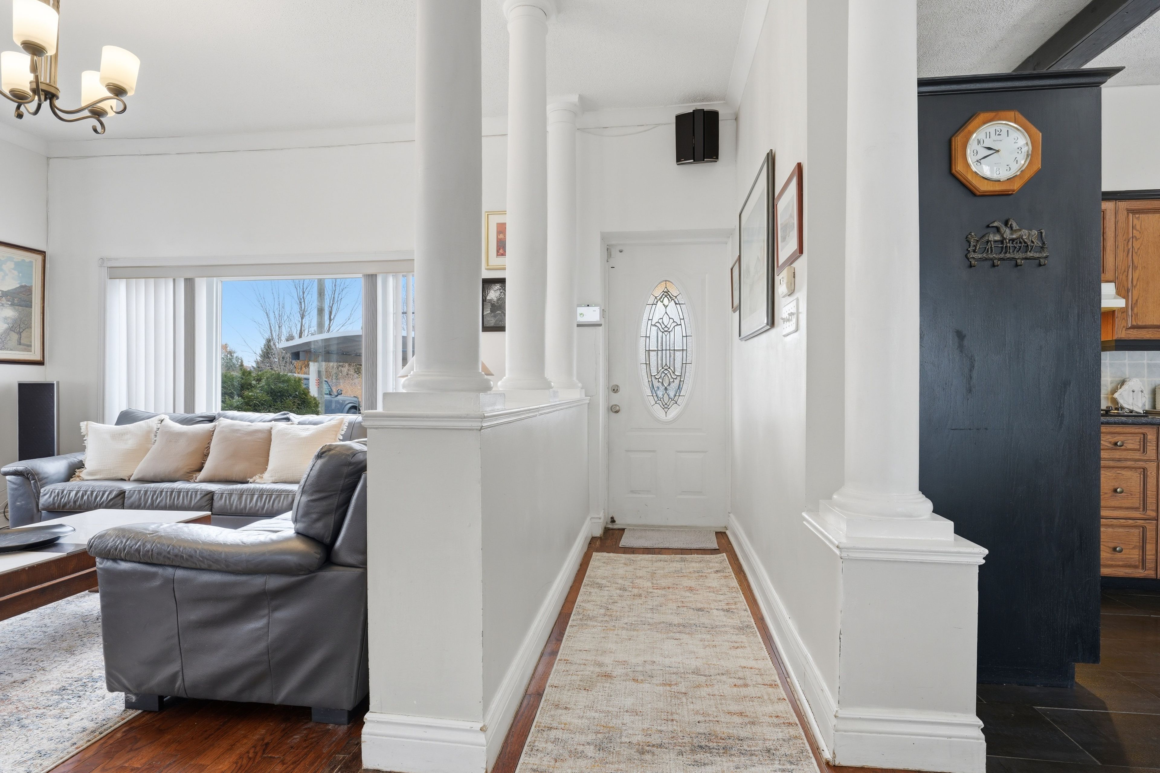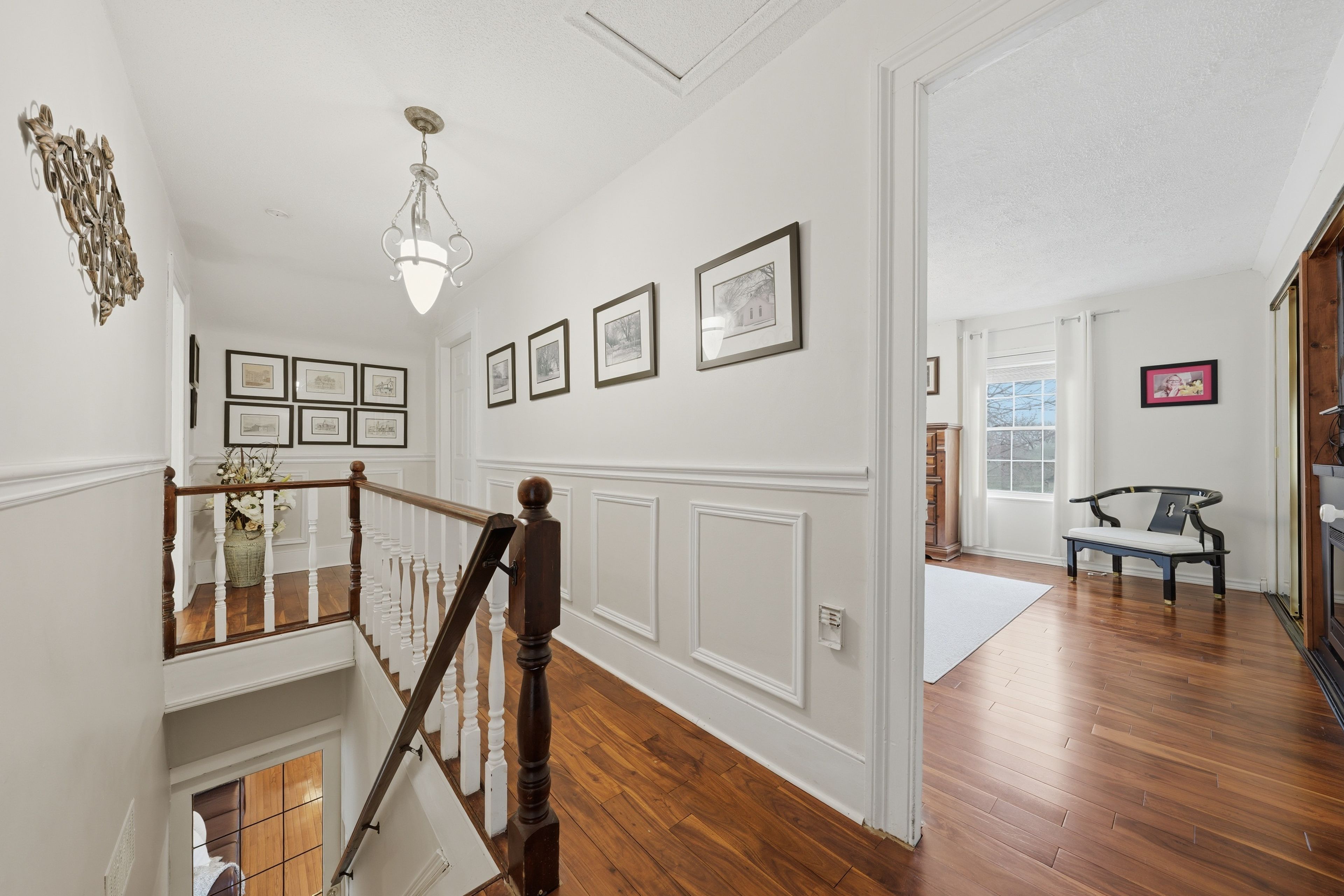 • Bright family room with hardwood flooring and open layout.