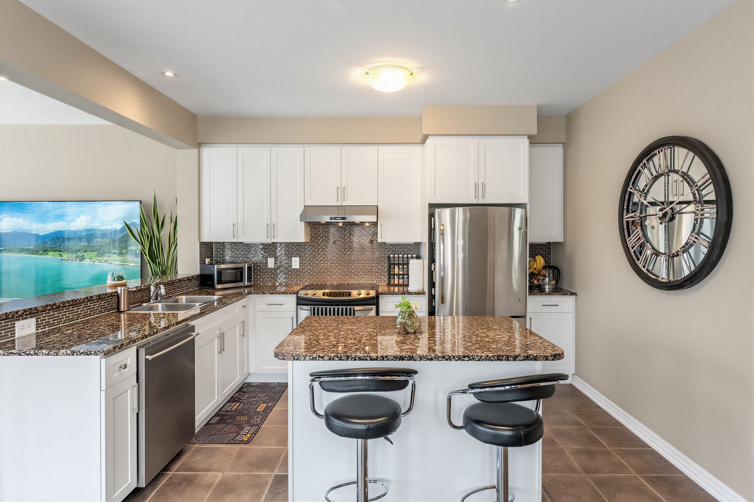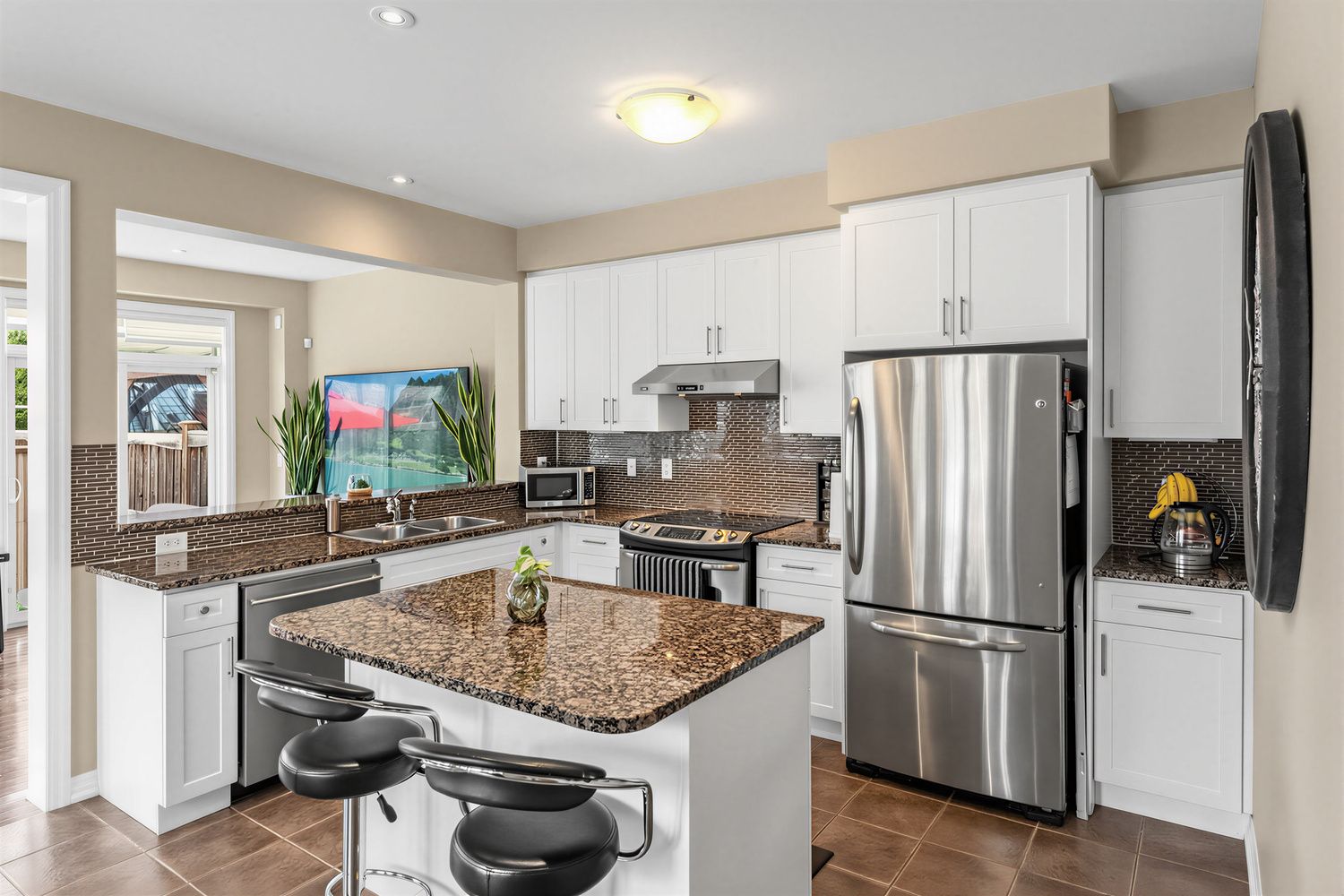• Modern chef's kitchen with granite countertops and stainless steel appliances.