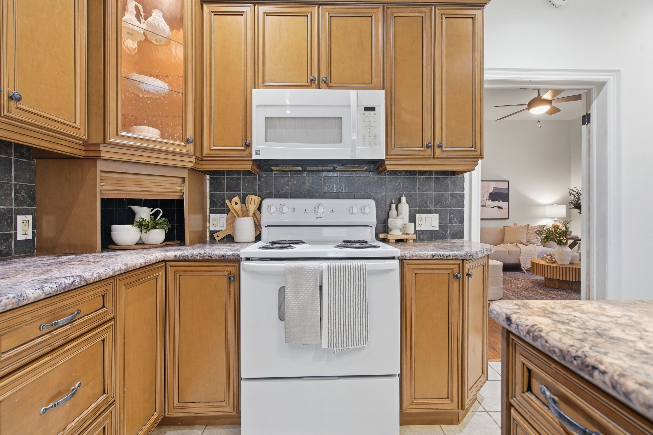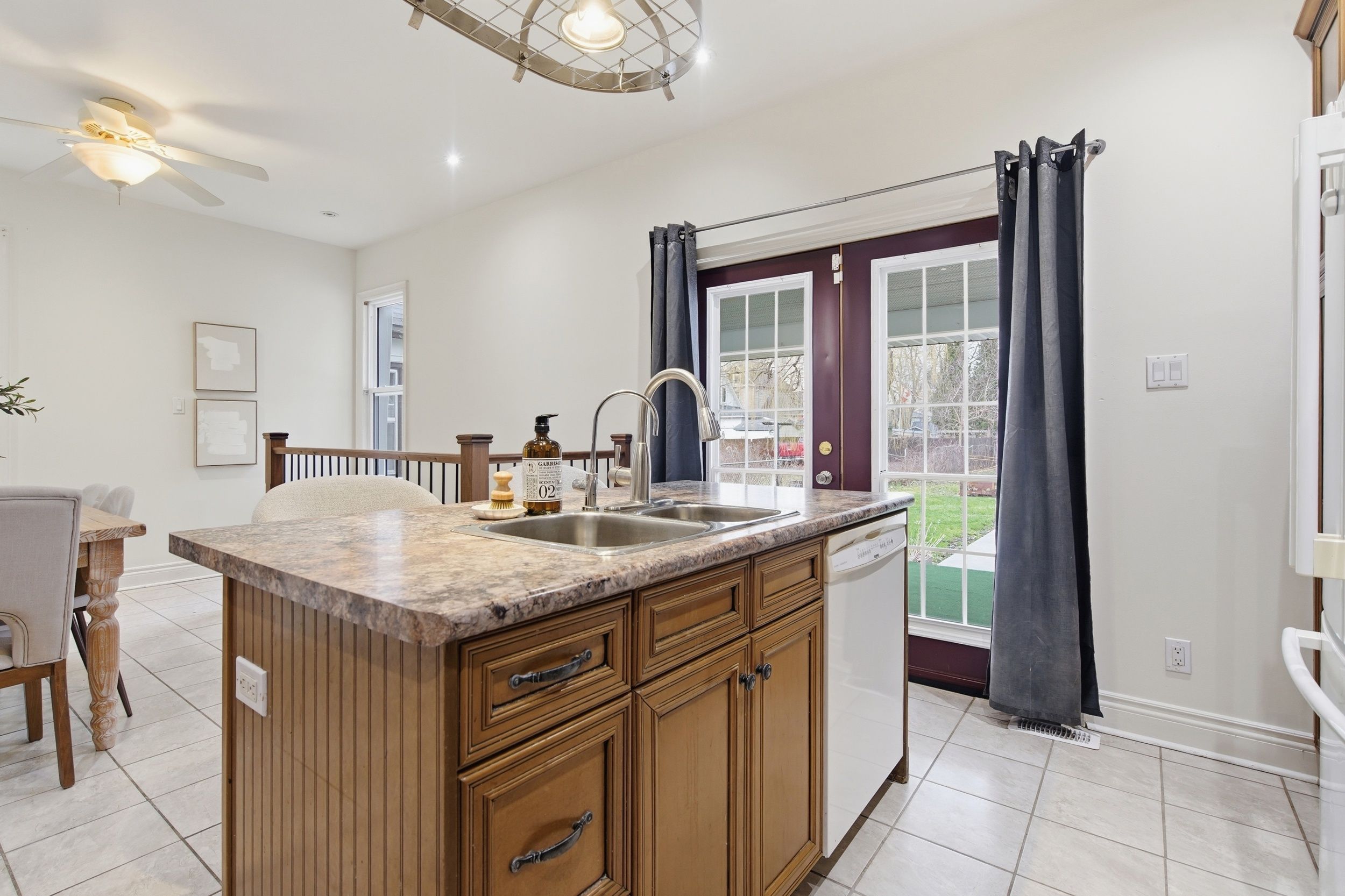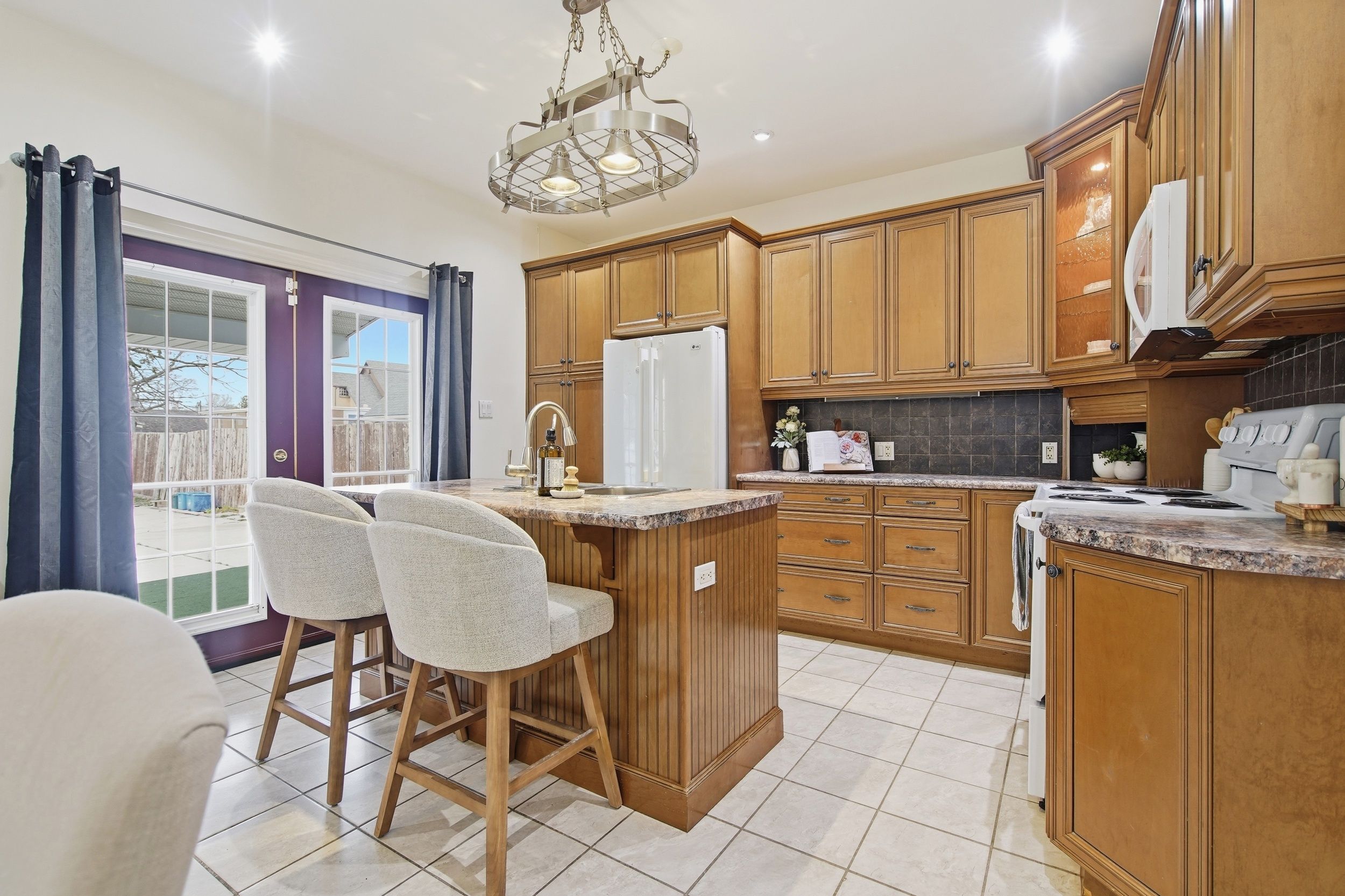 • Spacious eat-in kitchen features a center island and opens to the backyard.