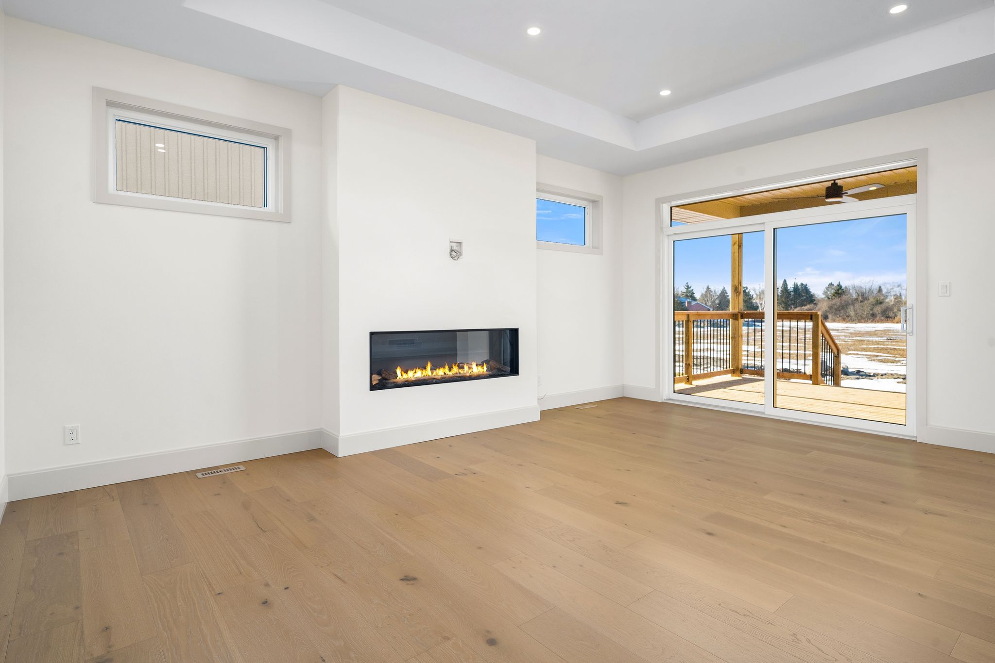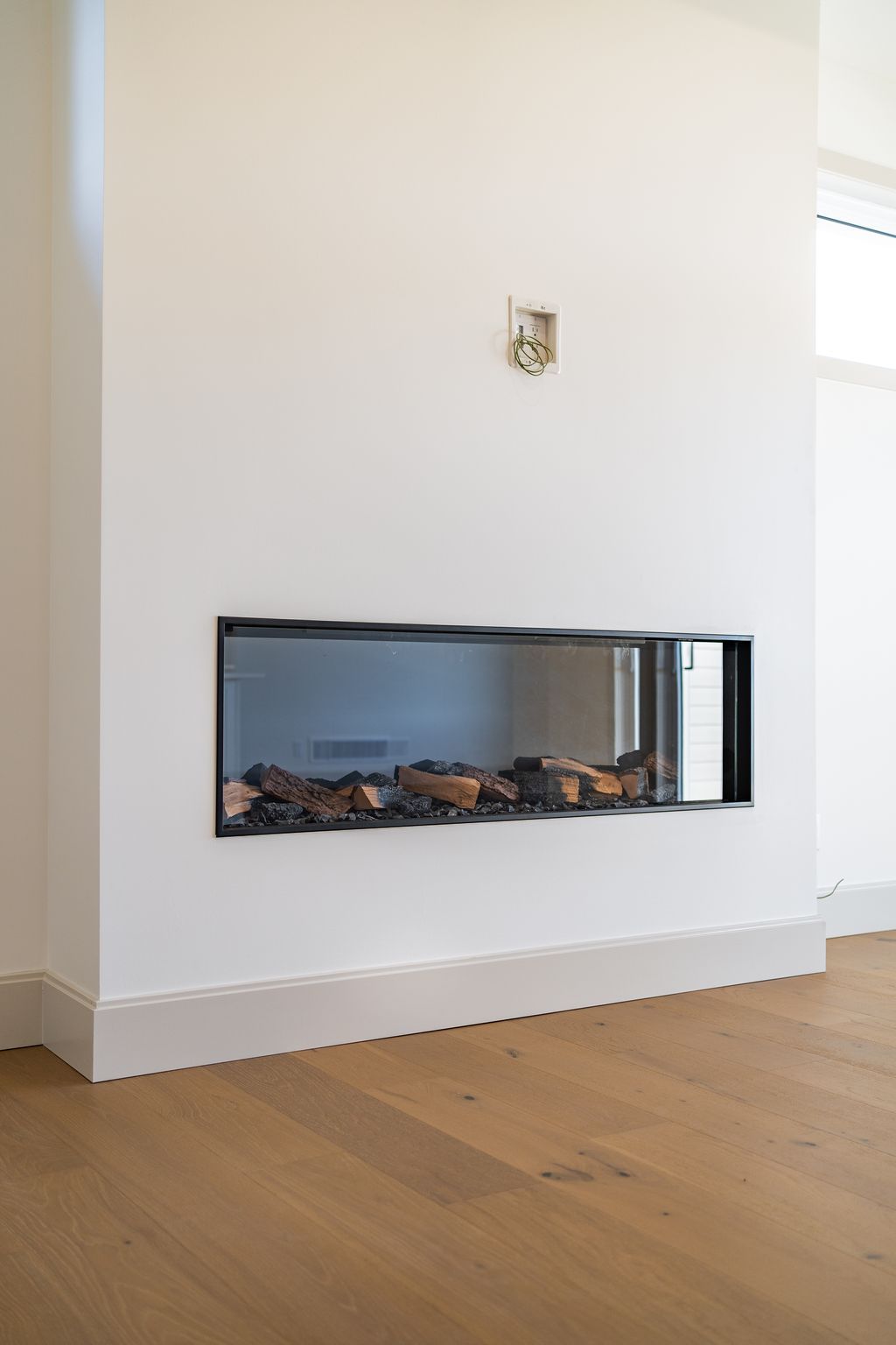 • Open-concept living area with a stylish electric fireplace for entertaining.