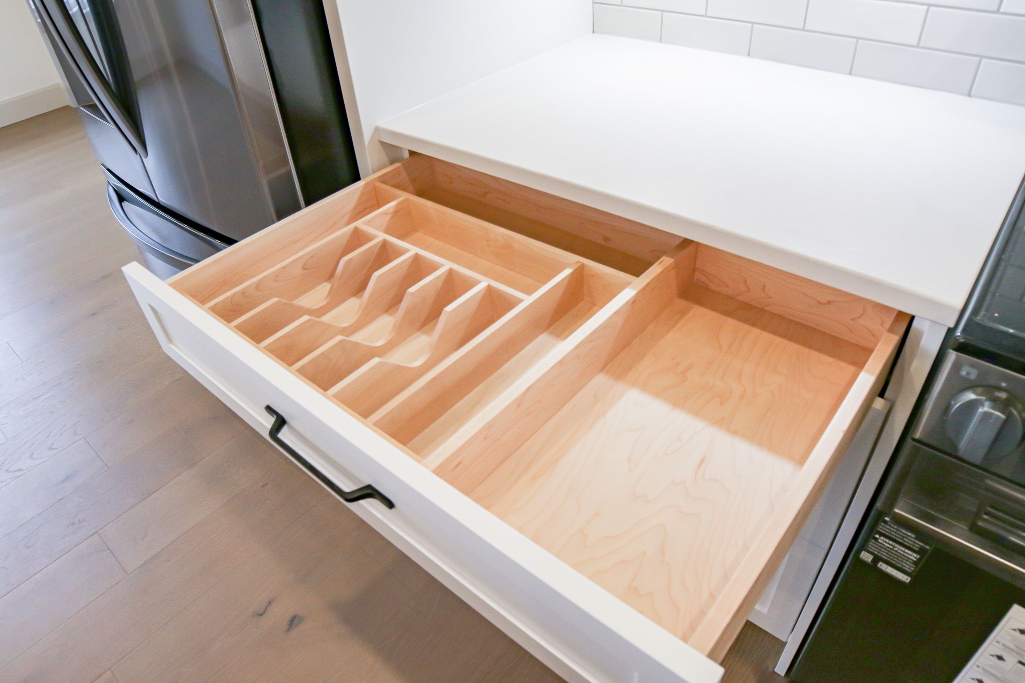 • Gourmet kitchen featuring solid wood cabinets and quartz countertops.
