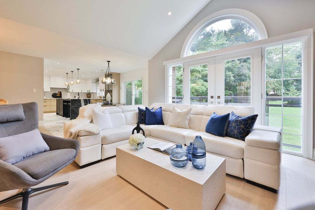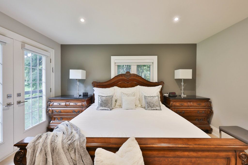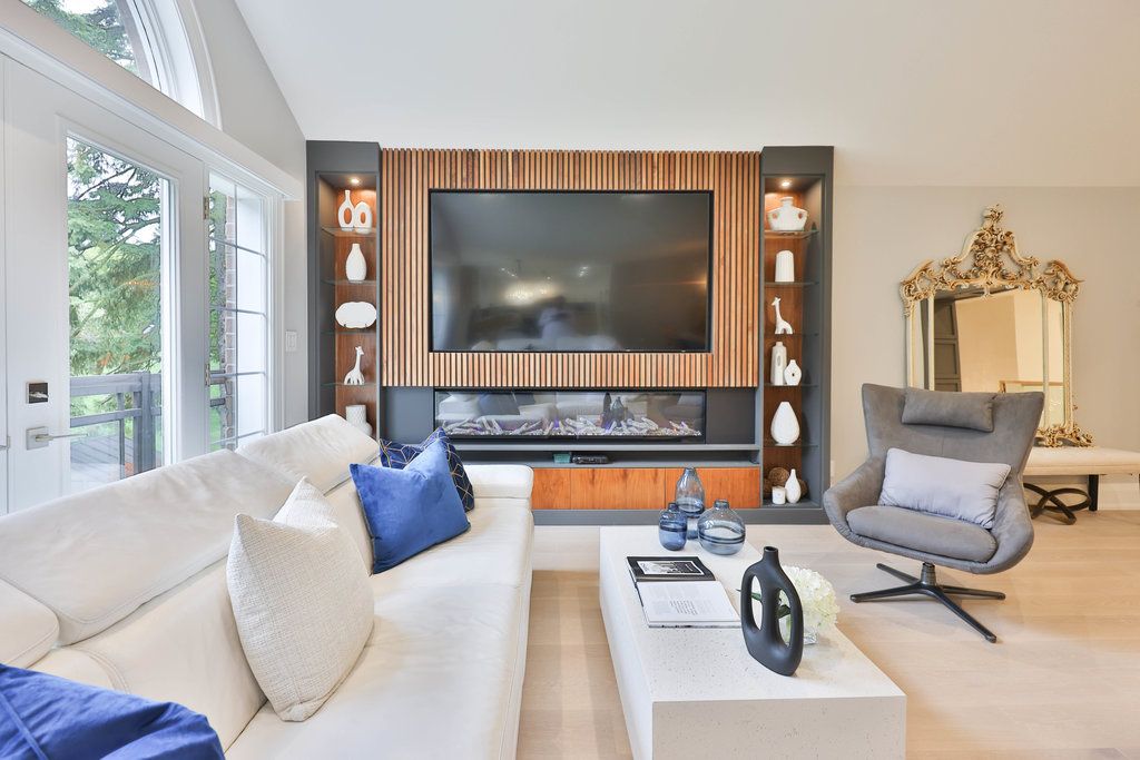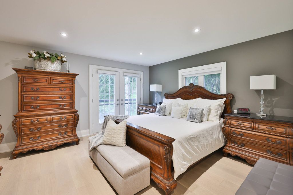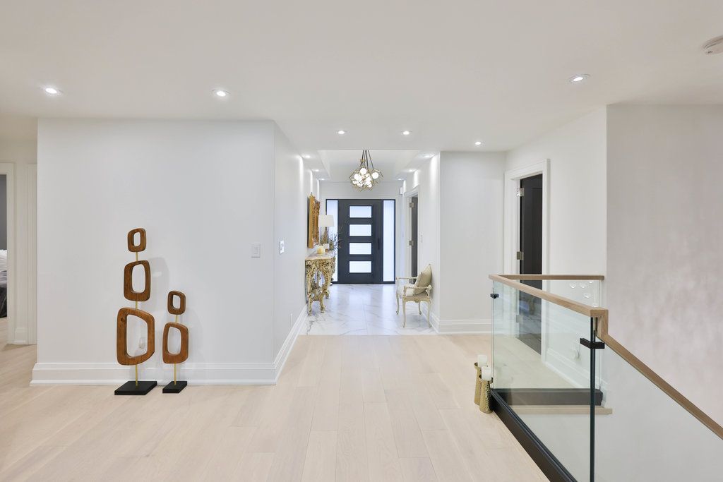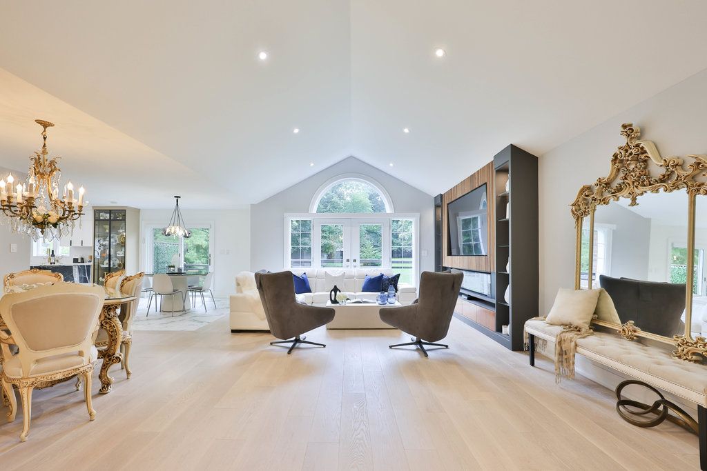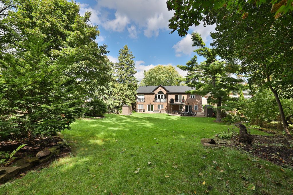 This distinguished residence prestigious mineola offers an extraordinary 65 x 251 ft lot, spanning nearly half an acre of lush, tree-lined privacy. Encompassing approx 4,716 sqft of total living space, this reno'd home marries timeless architectural character w/ contemporary sophistication. Intricate millwork sets an elegant tone upon entry, guiding you toward the grand family room where vaulted ceilings create a dramatic sense of scale. A custom media feature w/ electric f/p serves as a stunning focal point, while an expansive french door ensemble w/ sidelights & a palladian transom invites an abundance of natural light indoors. The chef's kitchen showcases a granite waterfall island, premium wolf & miele appls, & a dedicated servery complete w/ pantry. Seamless transitions between the dining & bfast areas provide a perfect balance of o/c flow & intimate gathering spaces. Elegance continues in the formal living room, where refined finishes, a statement chandelier, expansive window & soft pot lighting create a warm ambiance. A serene primary retreat awaits, featuring dbl french doors that open to a charming juliet balcony, automated blinds & a spa-inspired 4-pc ensuite designed for ultimate relaxation. 2 addn'l bdrms, appointed w/ rich hdwd flooring & fine detailing, share a beautifully finished 4-pc bath, while a custom powder room adds a layer of distinct character. The lower lvl expands the home's versatility w/ a spacious rec area, granite-appointed wet bar & dual w/o that blend indoor & outdoor living. A pvt nanny or in-law suite, accompanied by a 3-pc bath & secondary laundry, offers exceptional flexibility for multi-generational living or guests. Outdoors, a true muskoka-in-the-city experience unfolds w/ no rear neighbours, delivering unparalleled privacy & tranquil natural views. An interlock stone patio, elevated deck w/ glass railings, pvt hot tub & mature landscaping combine to create a resort-inspired setting perfect for both relaxation & entertaining.