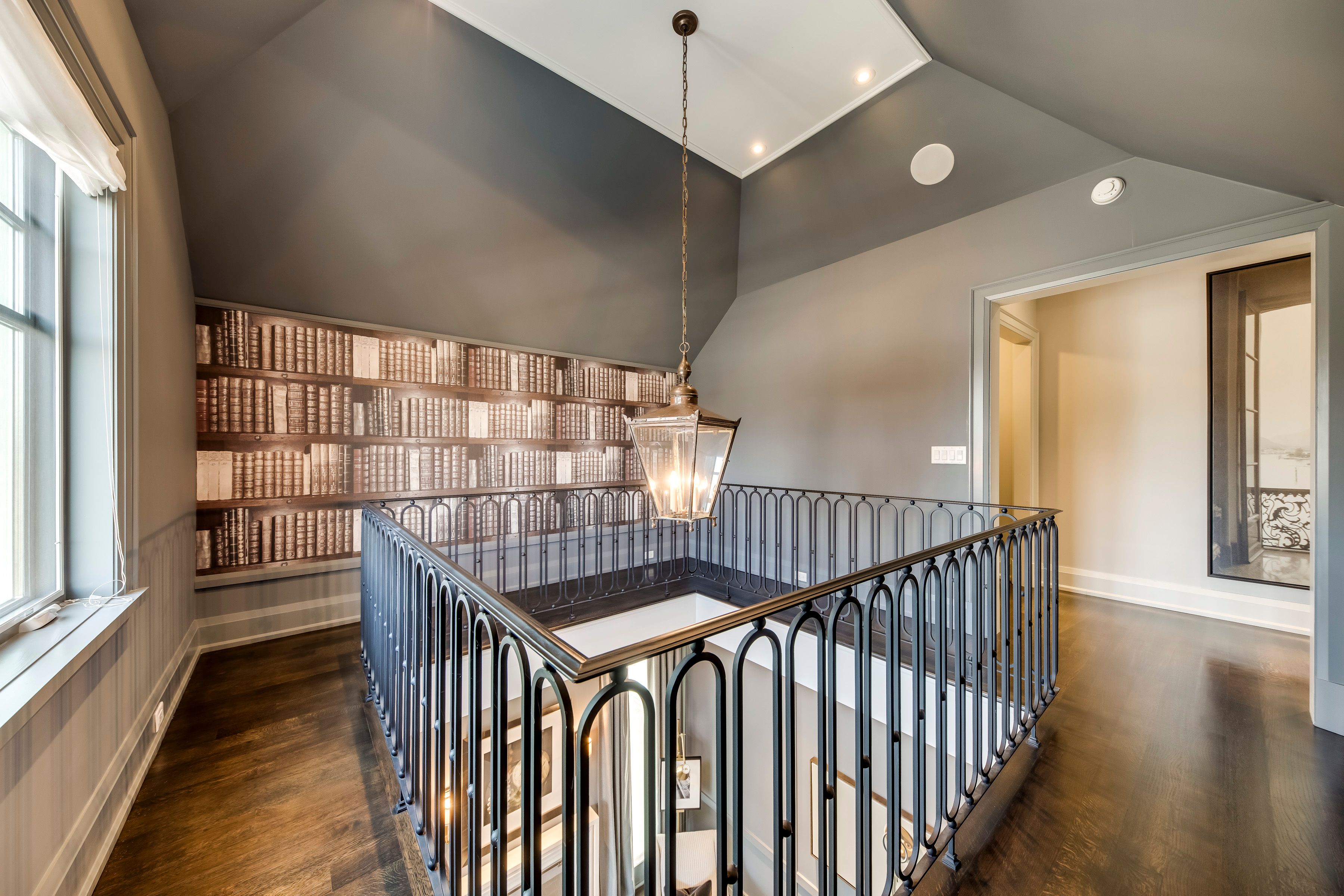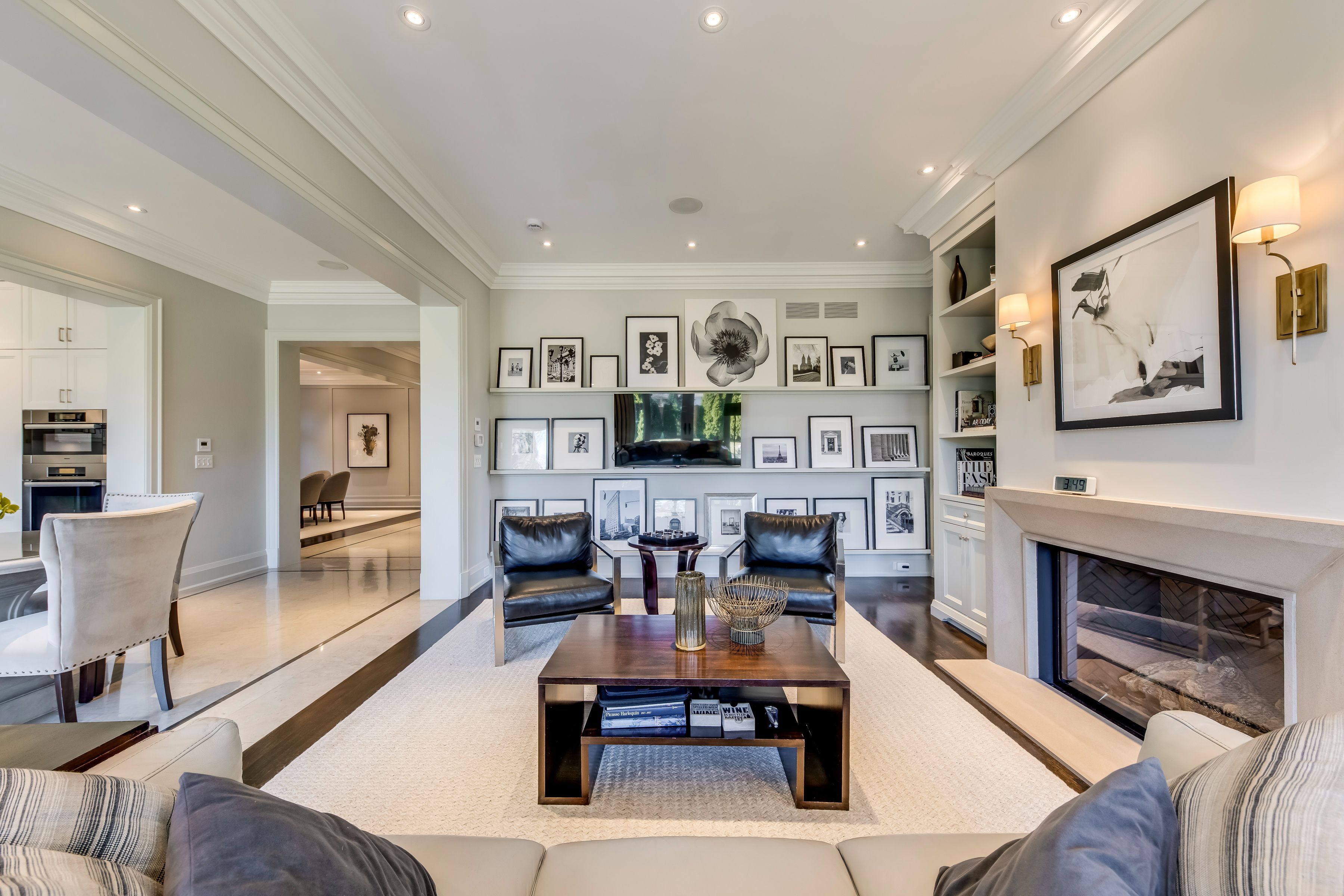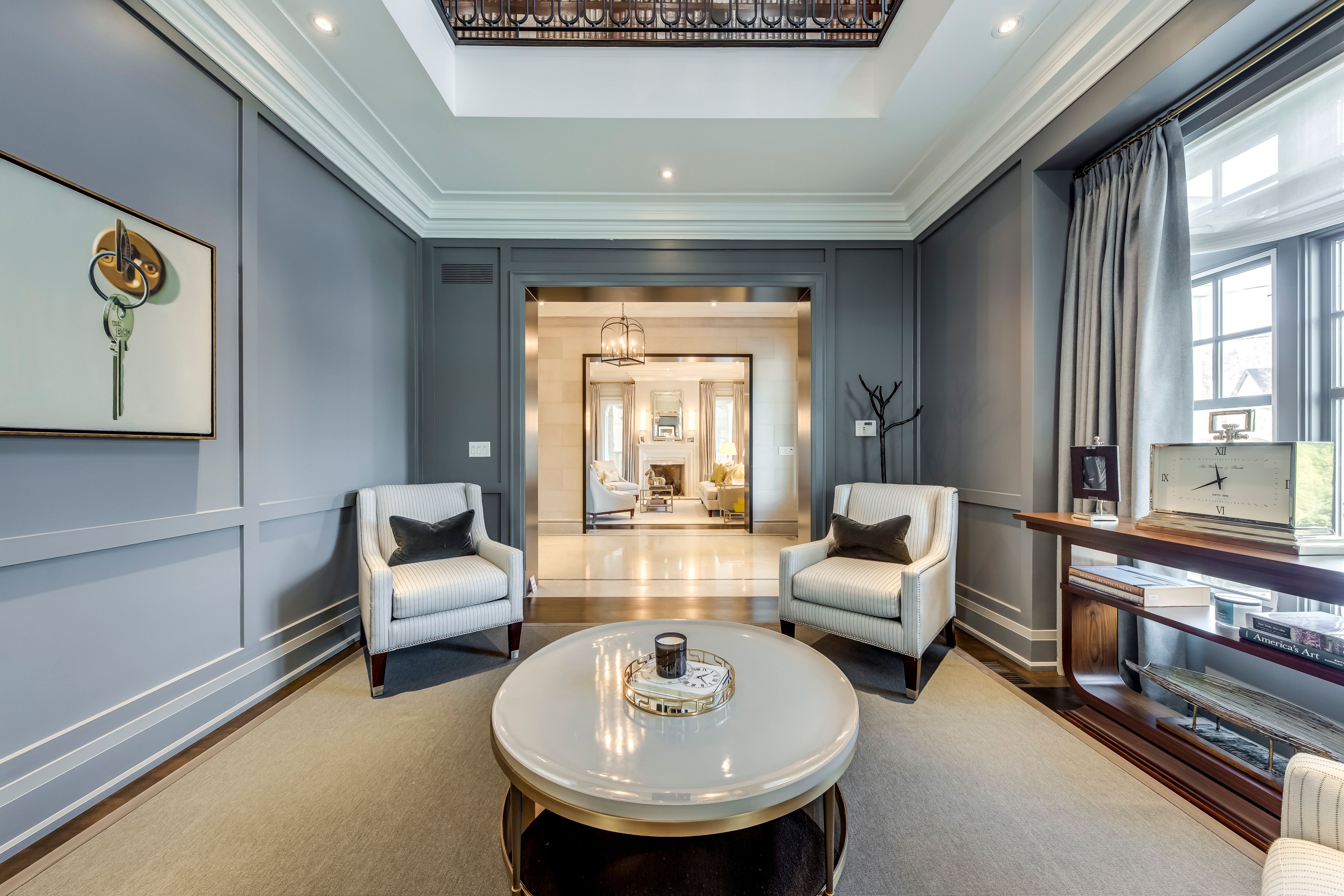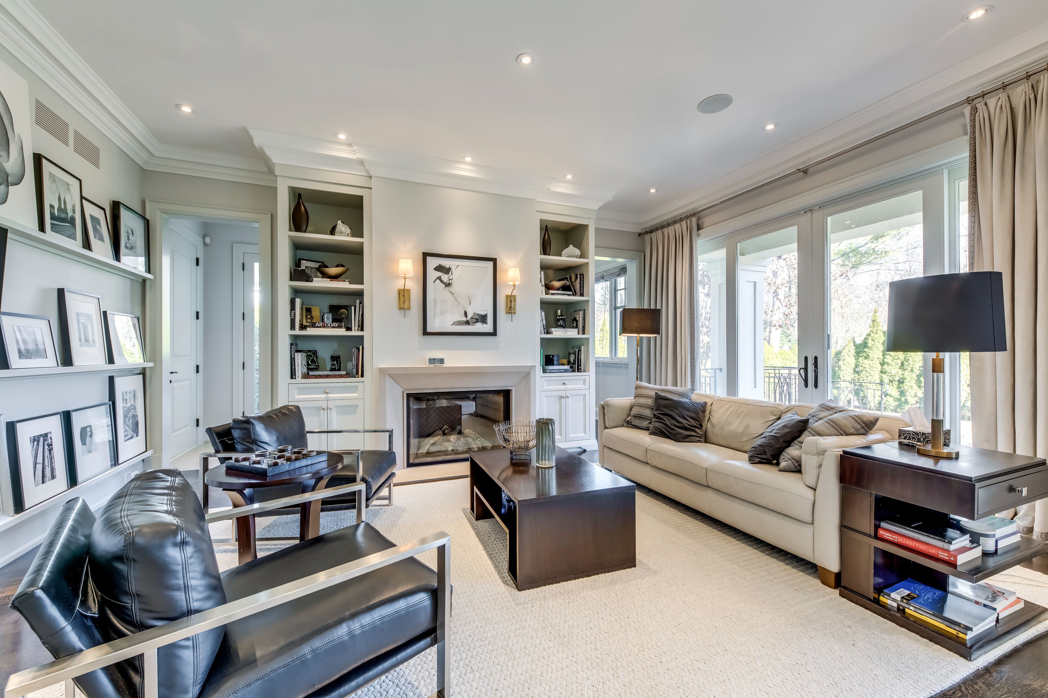 • Main level features a library with a gas fireplace and impressive ceilings.