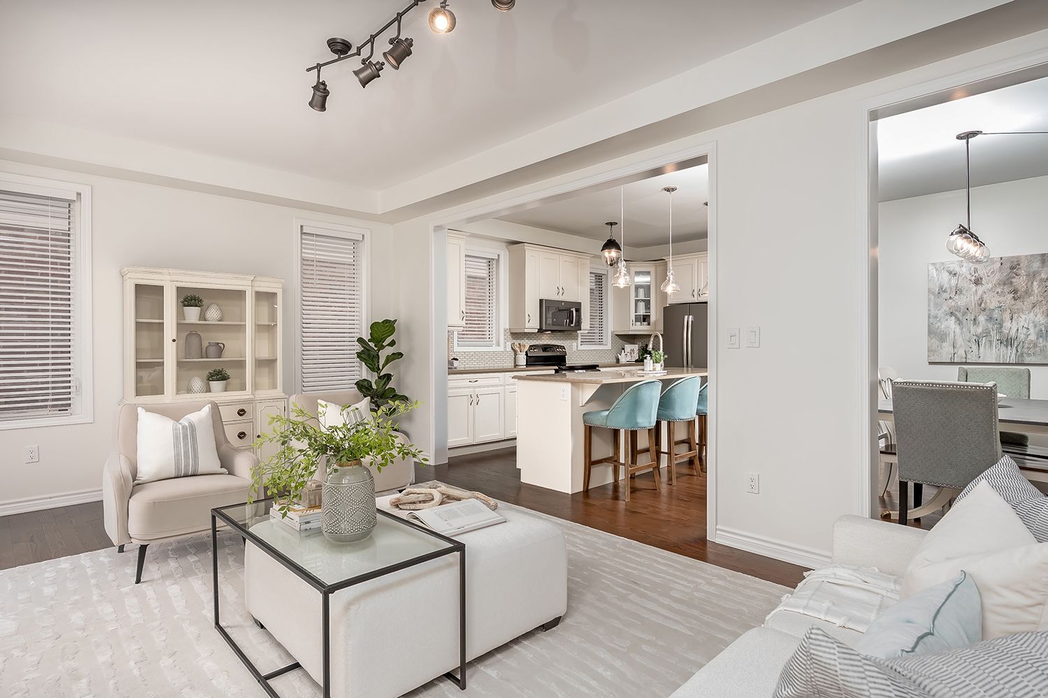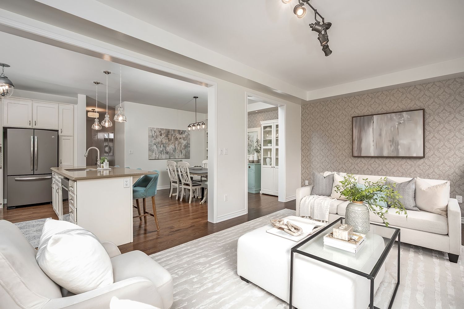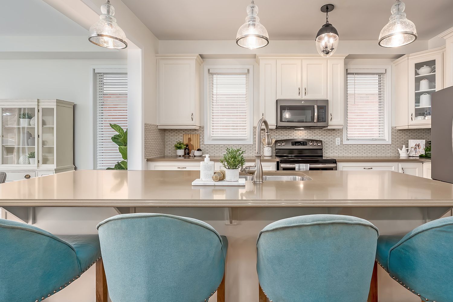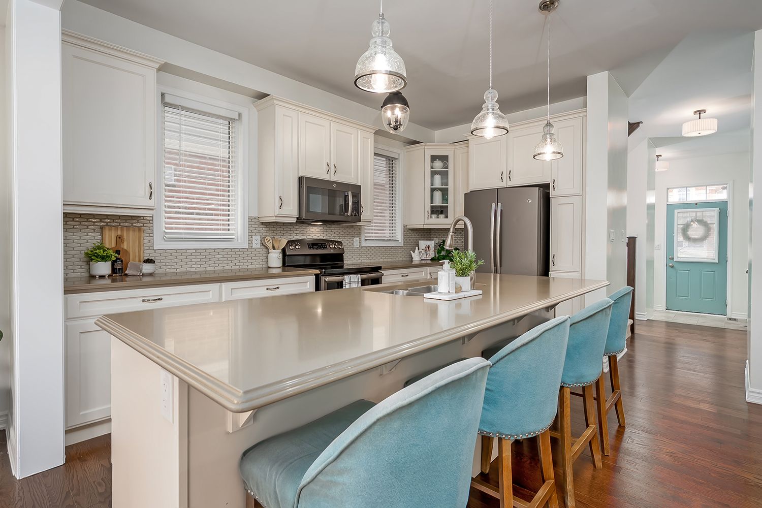 • Open concept kitchen with stainless steel appliances and quartz counters.