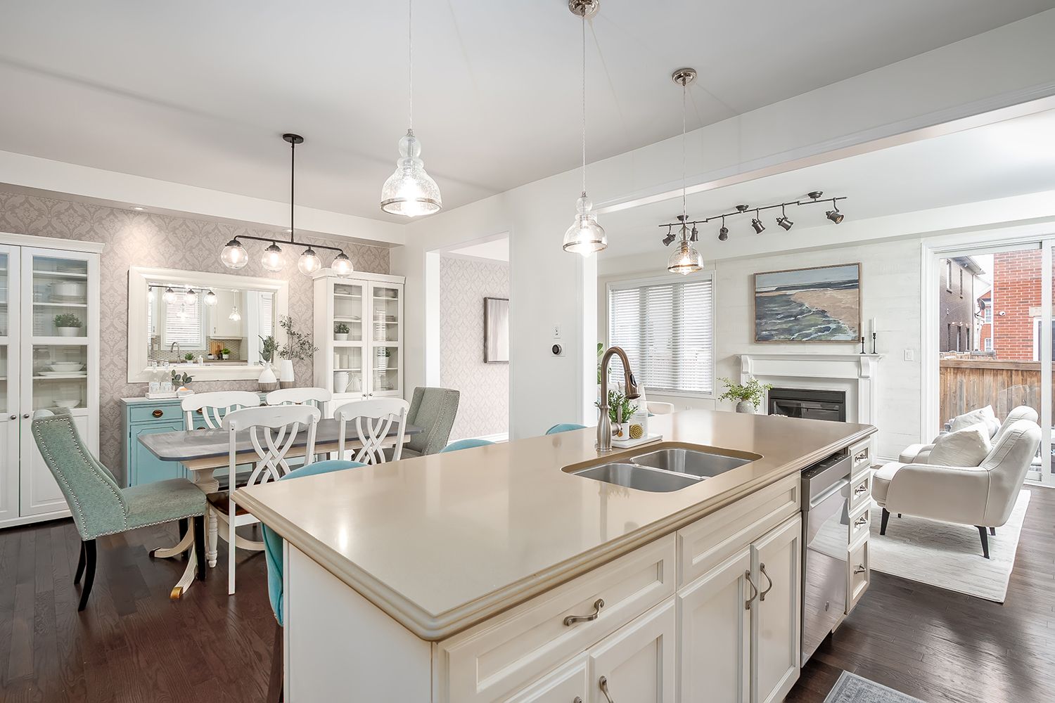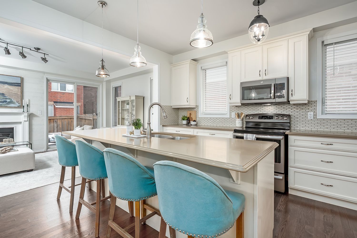• Open concept kitchen with stainless steel appliances and quartz counters.