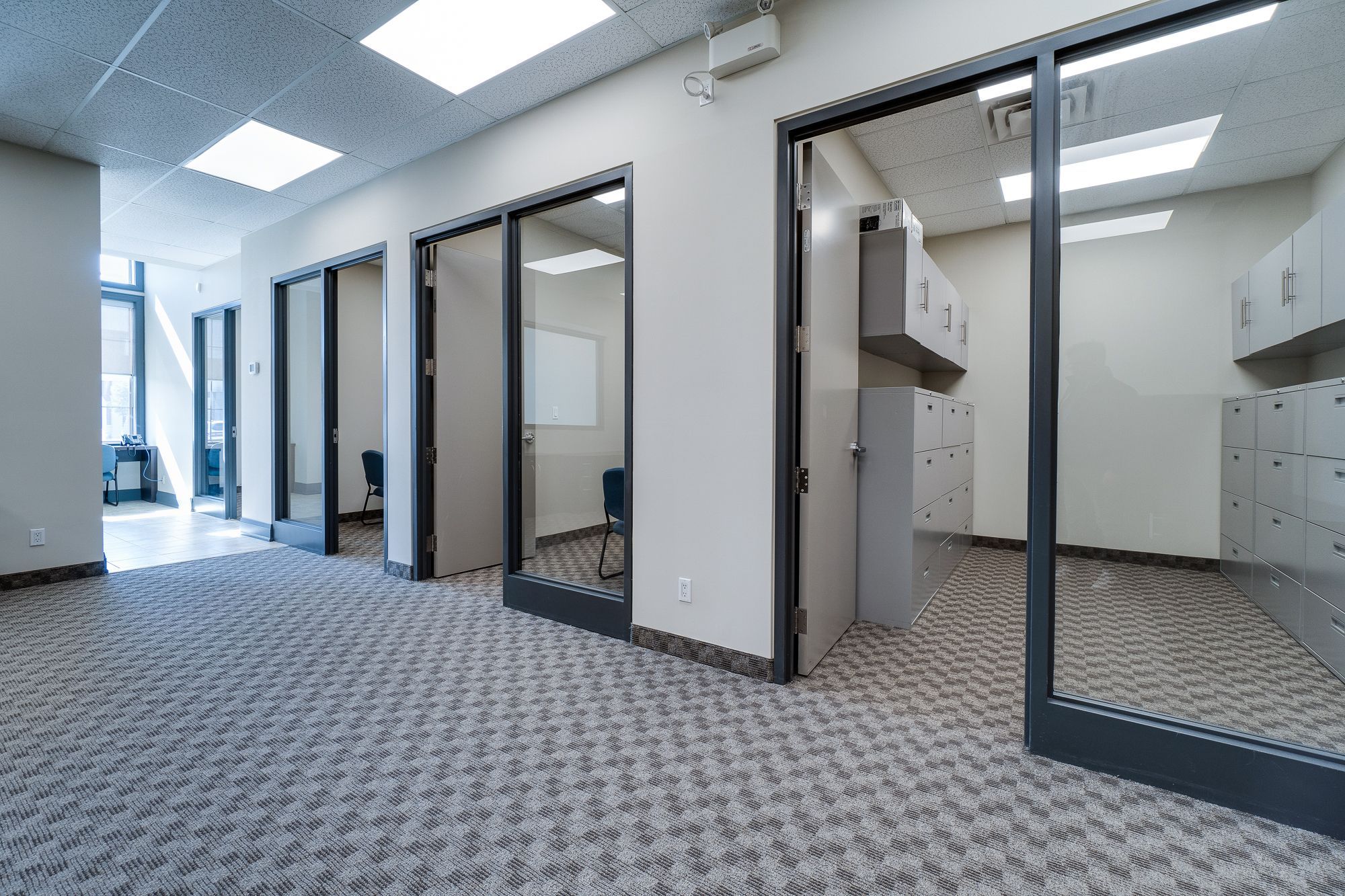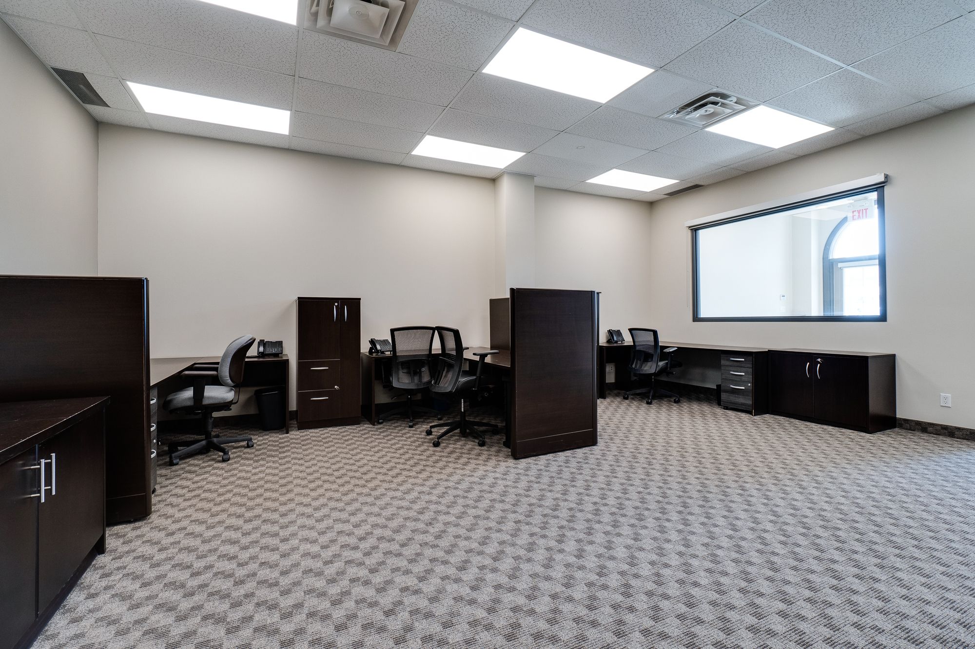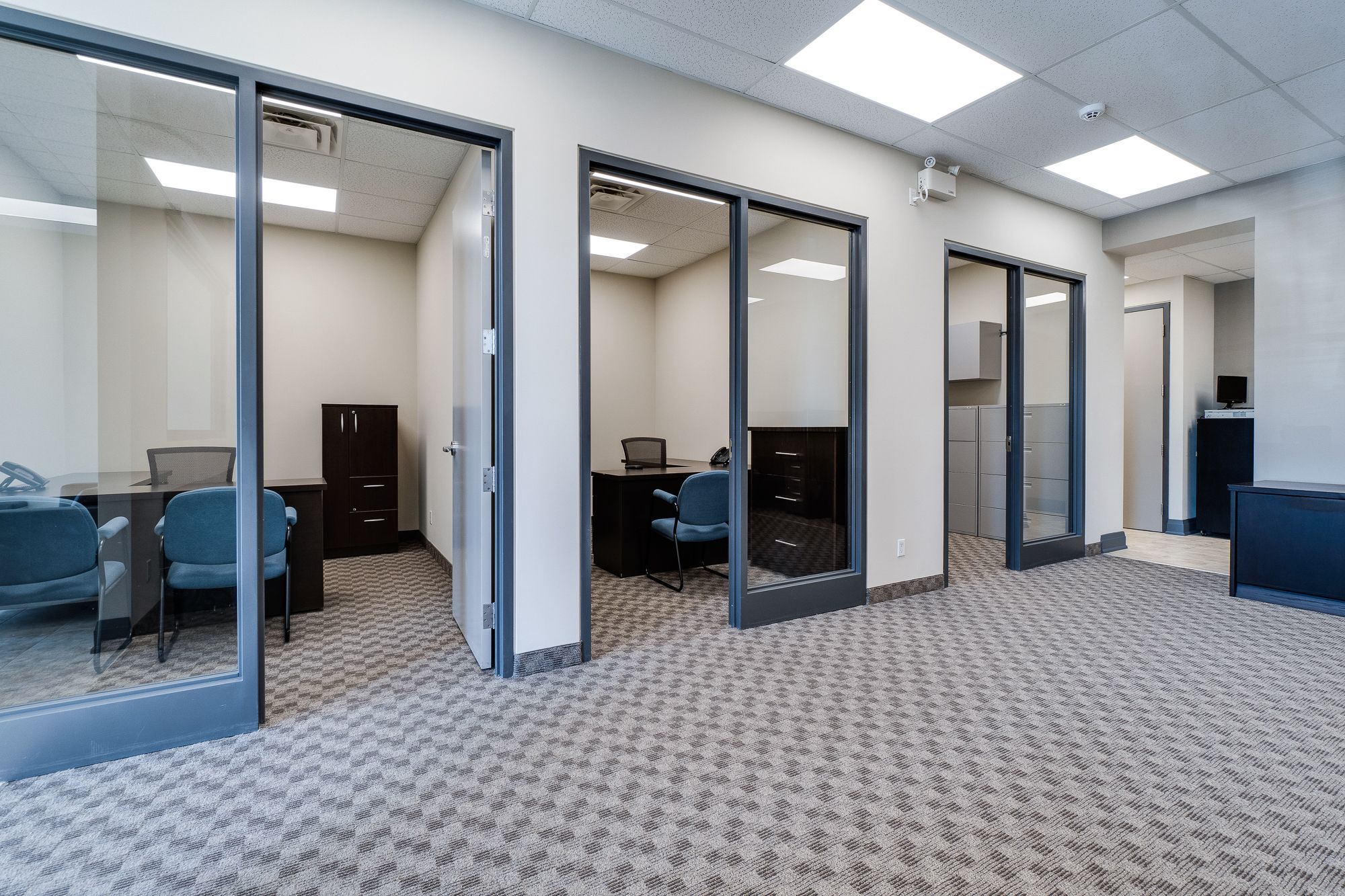 • Open floor plan includes meeting rooms, offices, kitchen, and washroom.