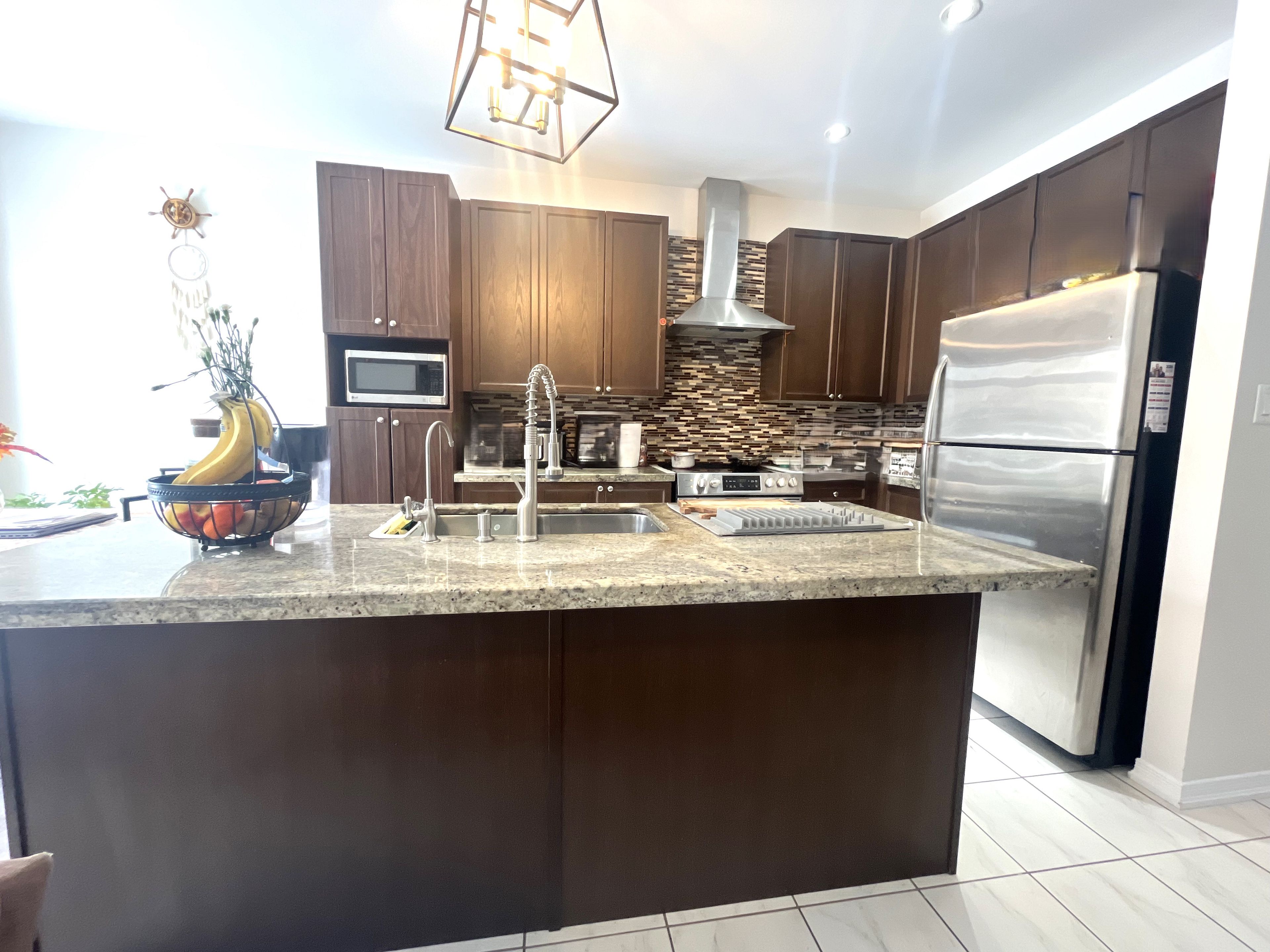 • Modern kitchen with stainless steel appliances and granite countertops.