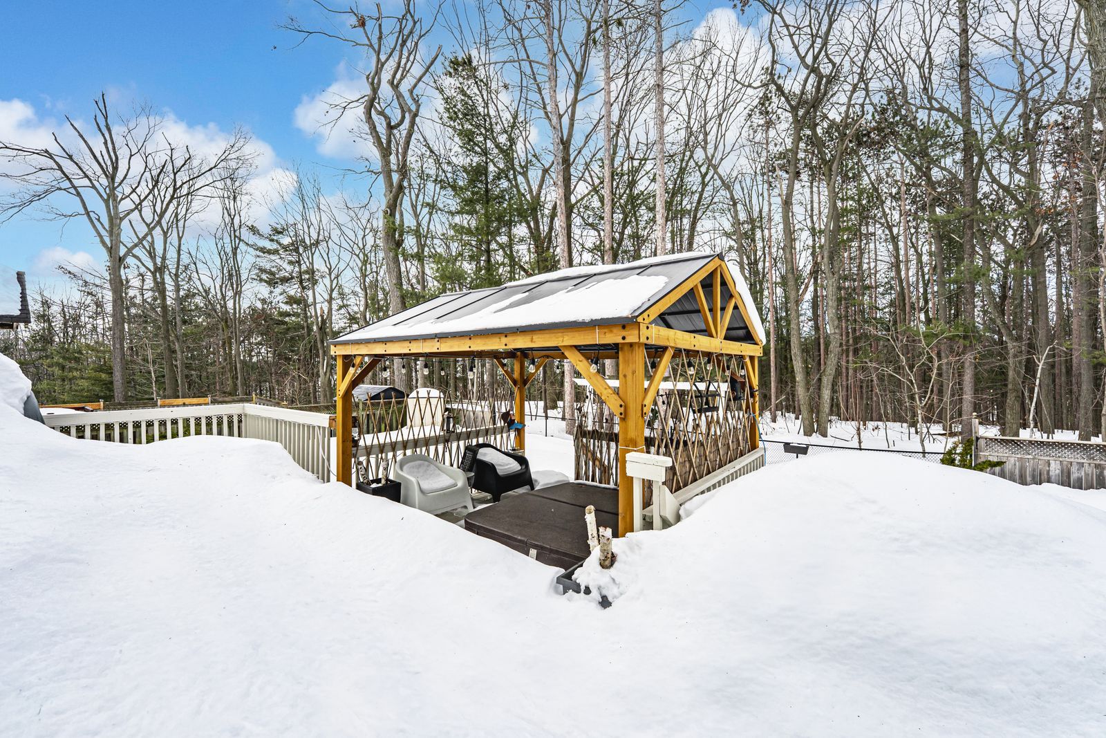 • Backyard features an oversized deck, hot tub, and hard-top gazebo for relaxation.