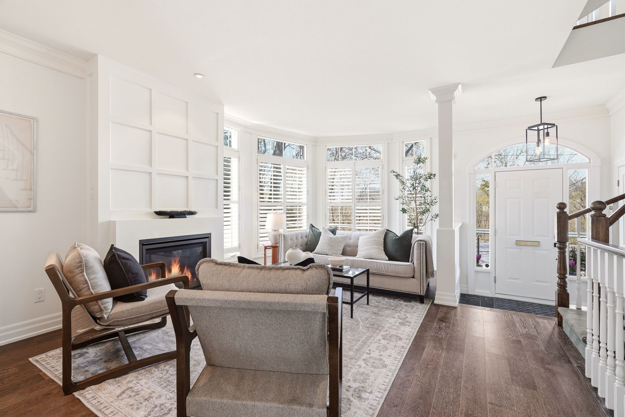 • Bright open-concept living area with hardwood floors and gas fireplace.