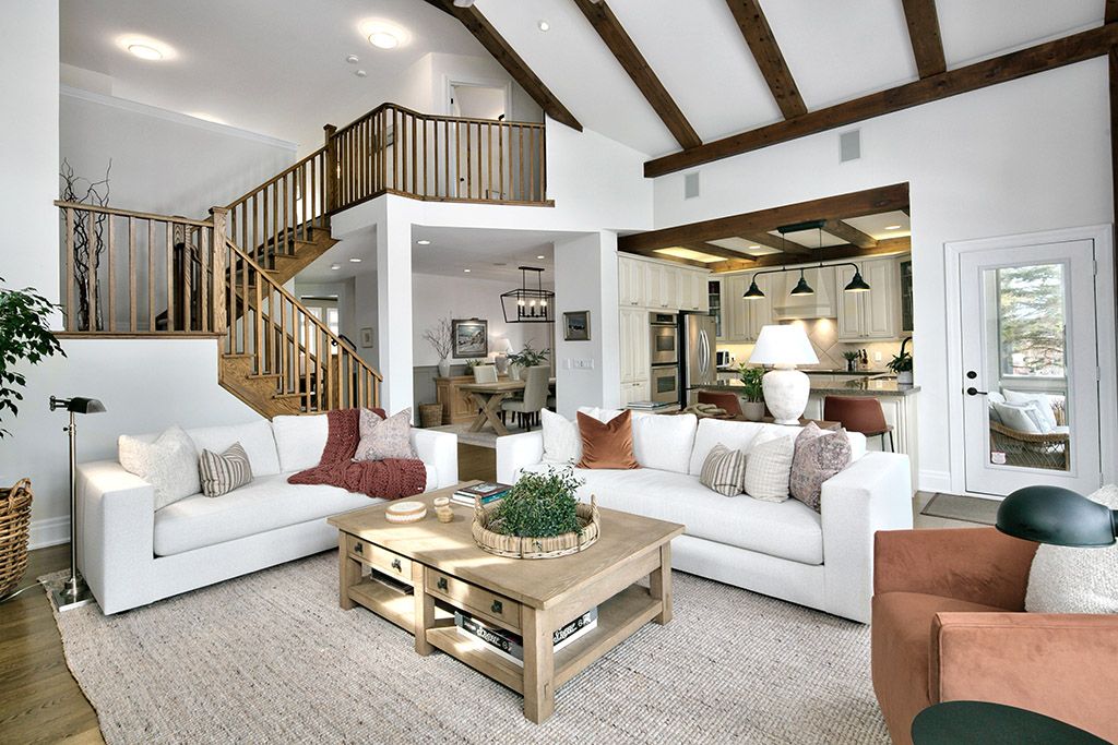 • Stunning great room with wood beams and a floor-to-ceiling stone fireplace.