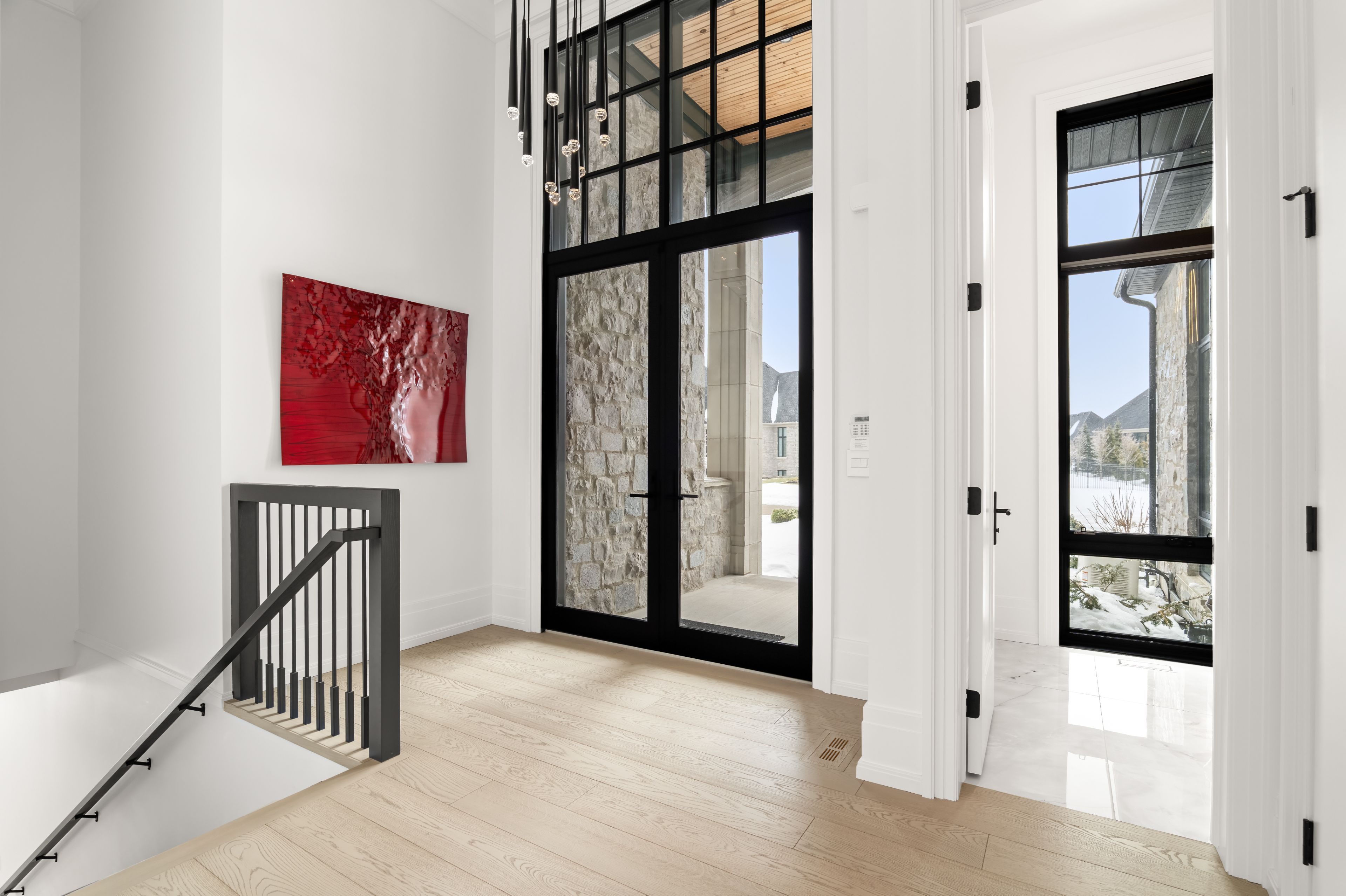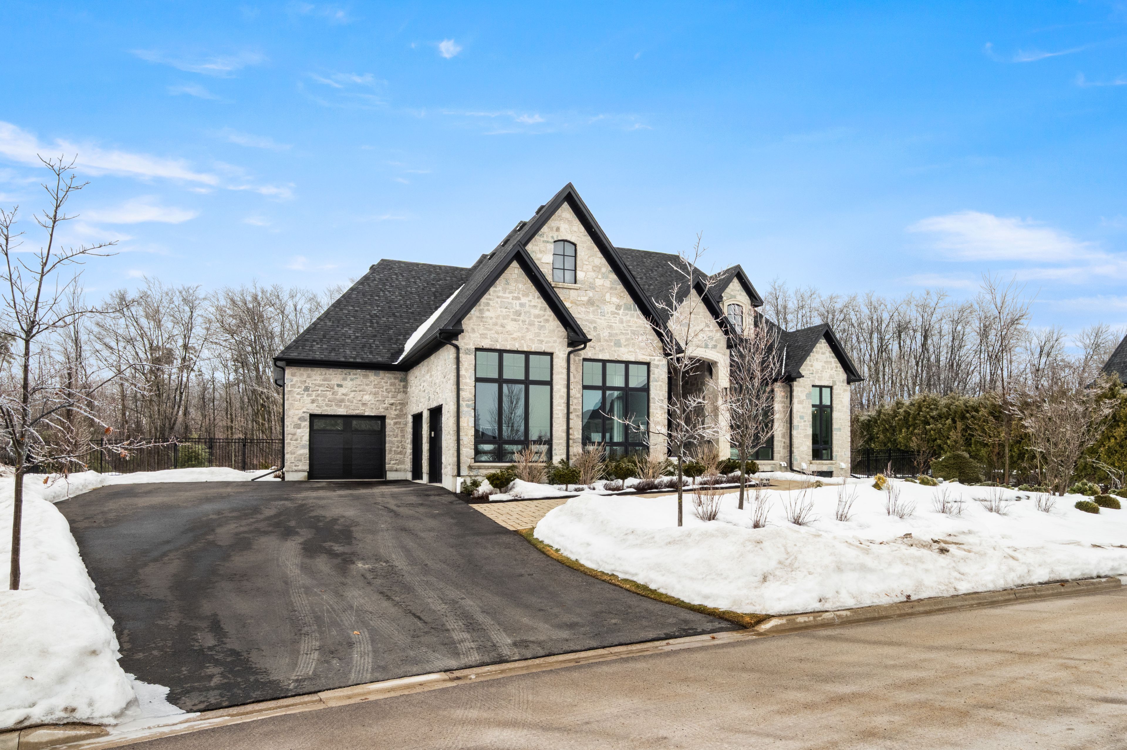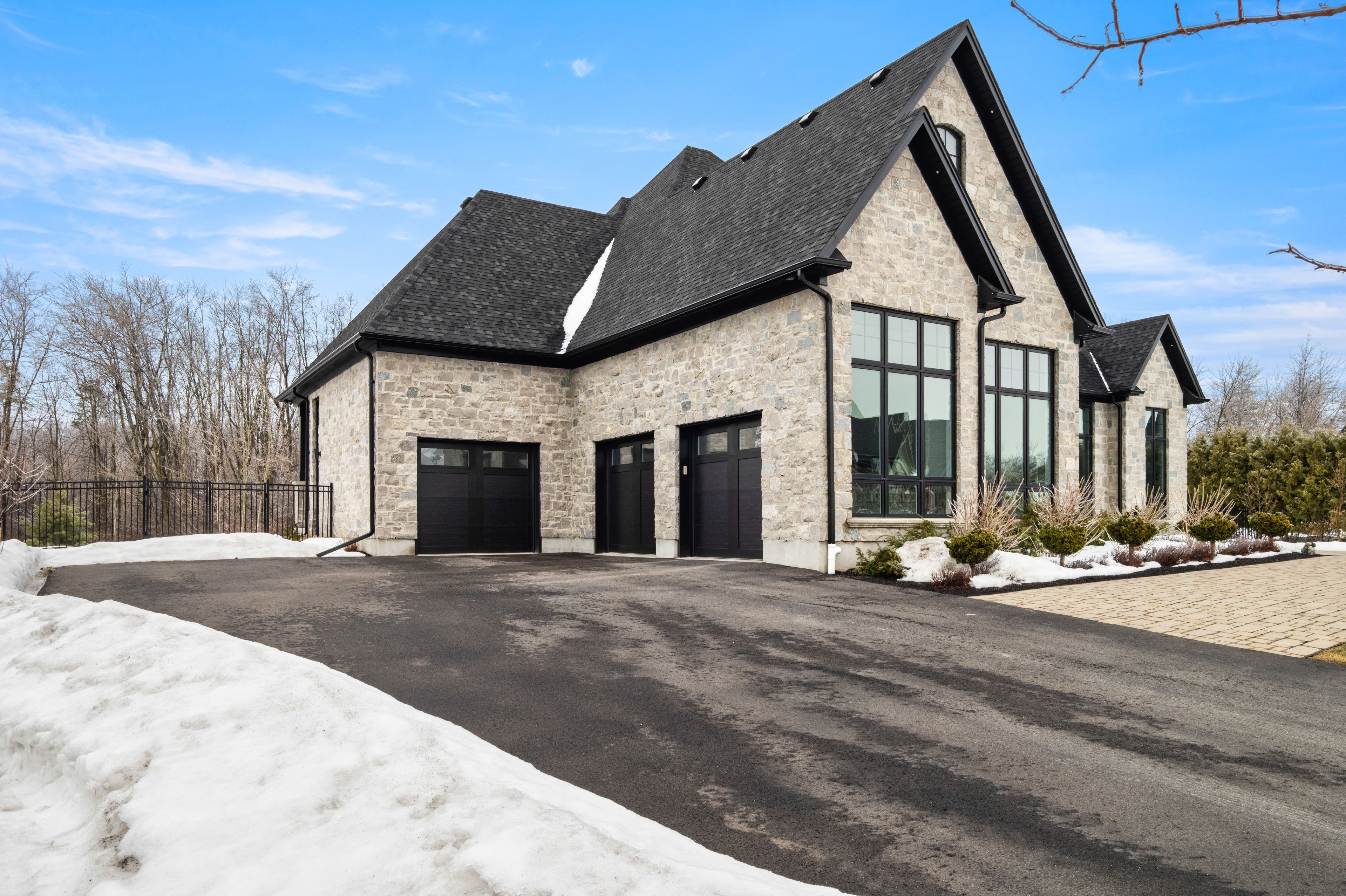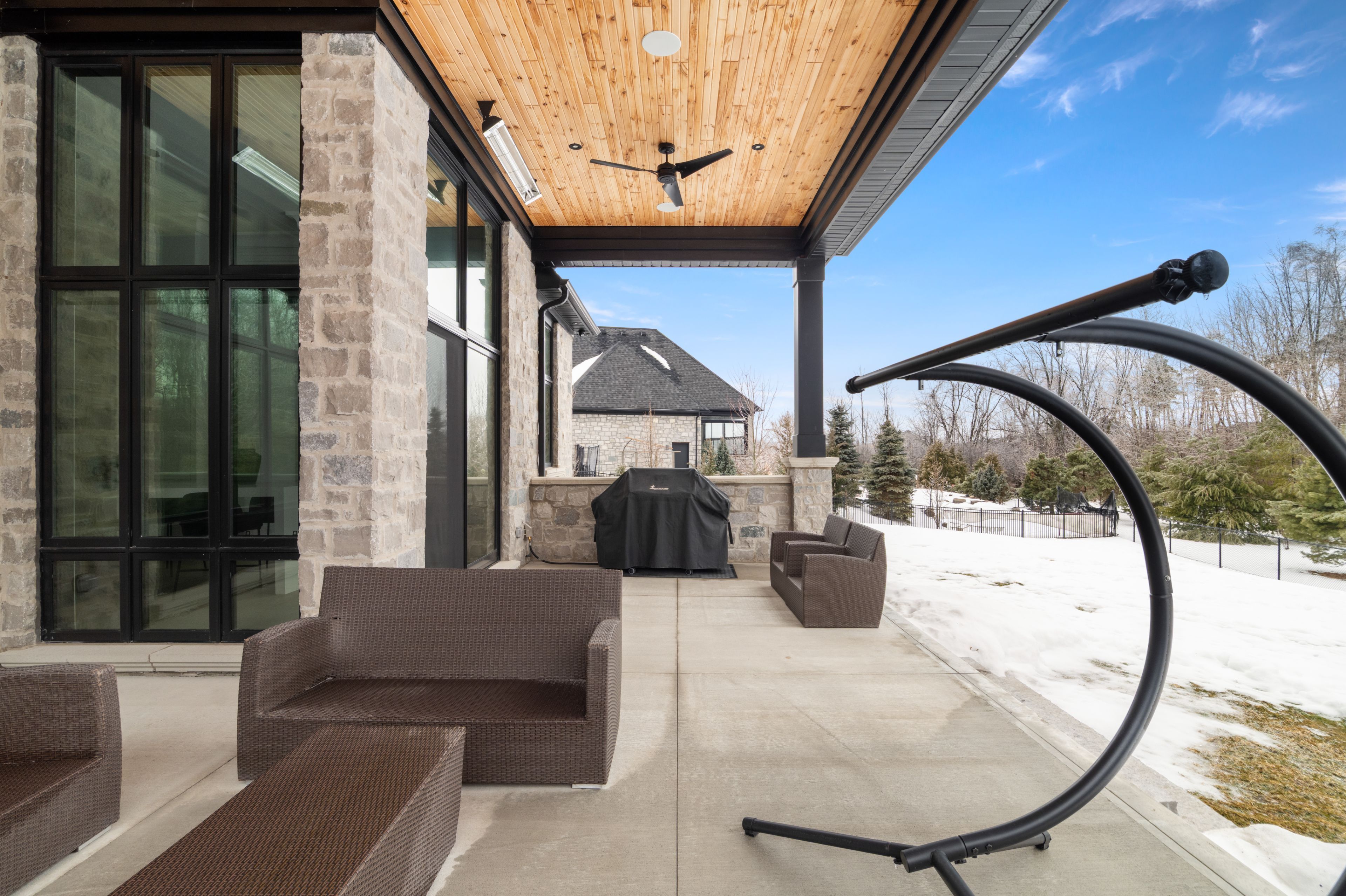 Welcome to life inside heritage lake estates - a private, gated enclave in puslinch known for its mature surroundings and beautiful custom homes. Set on a premium half-acre pie-shaped lot backing onto mature treelines, this custom stone bungalow offers privacy without compromise. With 2,252 square feet on the main floor and soaring 14-foot ceilings, the principal living space is defined by symmetry, scale, and natural light. A custom fireplace anchors the living room, while upgraded crown moulding and floor-to-ceiling windows create a refined yet inviting atmosphere. The kitchen and dining area are gallery-inspired in design, centred around a striking 21-foot stone waterfall island with seating for eight. Integrated cabinetry conceals premium wolf appliances for a seamless aesthetic. Heated floors, custom lighting, and electric blinds reflect the many thoughtful upgrades woven throughout the home. Step outside to a covered back patio complete with built-in heaters and an impressive 350 sq ft gas fire feature, overlooking the fenced yard and tranquil forest backdrop - ideal for elevated, year-round outdoor living. The primary suite is a private retreat, offering 12ft ceilings, floor to ceiling windows, a generous walk-in closet and spa-inspired five-piece ensuite with jet spa shower system. Across from this, the well-appointed laundry room and additional main-floor bedroom, featuring with its own ensuite bath and walk-in closet, complete the main level. The fully finished lower level adds two bedrooms, each accompanied by an ensuite bathroom, a spacious recreation room with custom fireplace, dedicated office space, and a home gym - perfectly suited for growing families or multi-generational living. A functional mudroom with built-in cabinetry offers direct access to the heated three-car garage and walk-down access to the basement. 153 heritage lake drive invites you to embrace a quiet kind of luxury, framed by the serenity of puslinch lake.