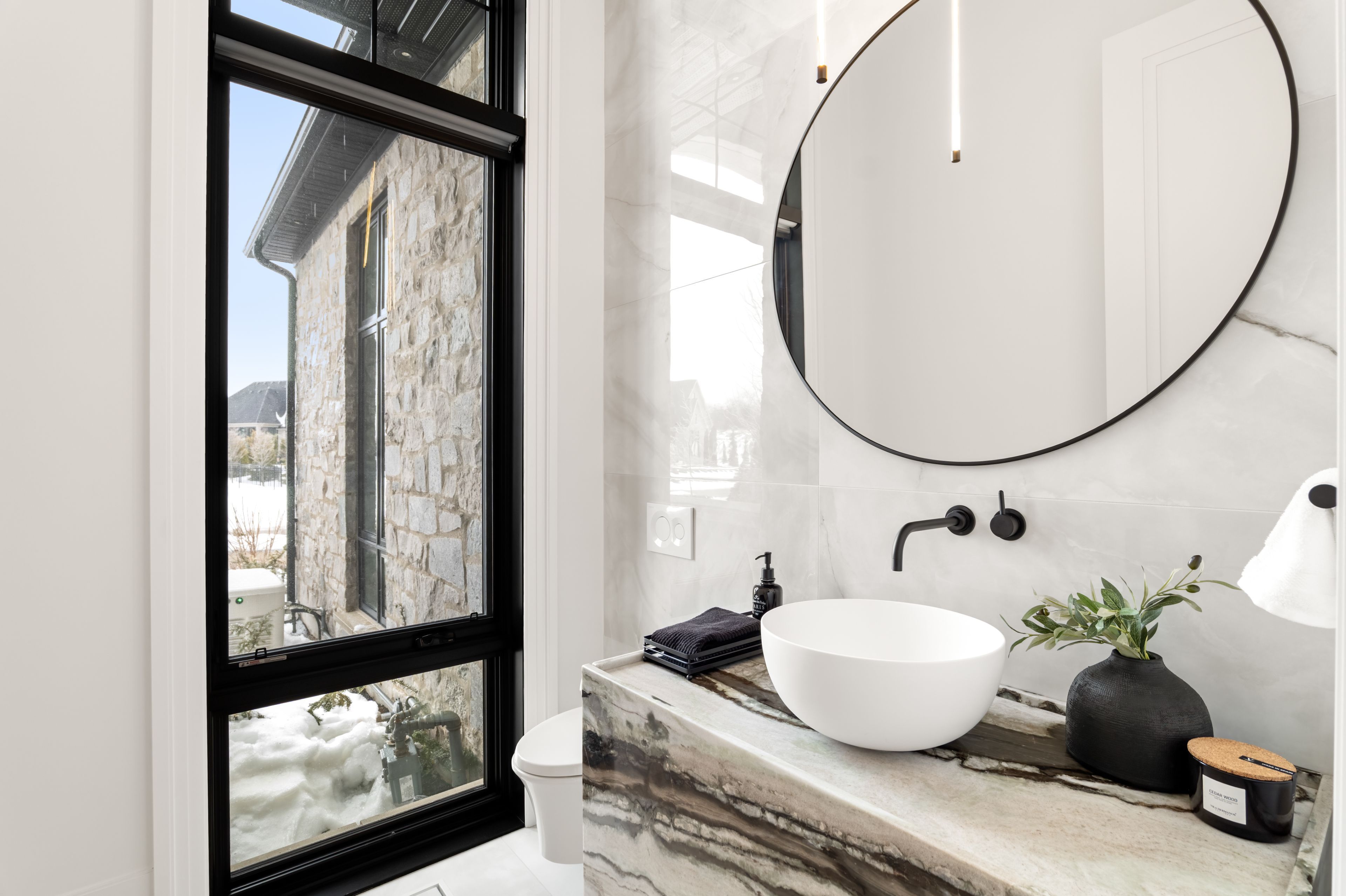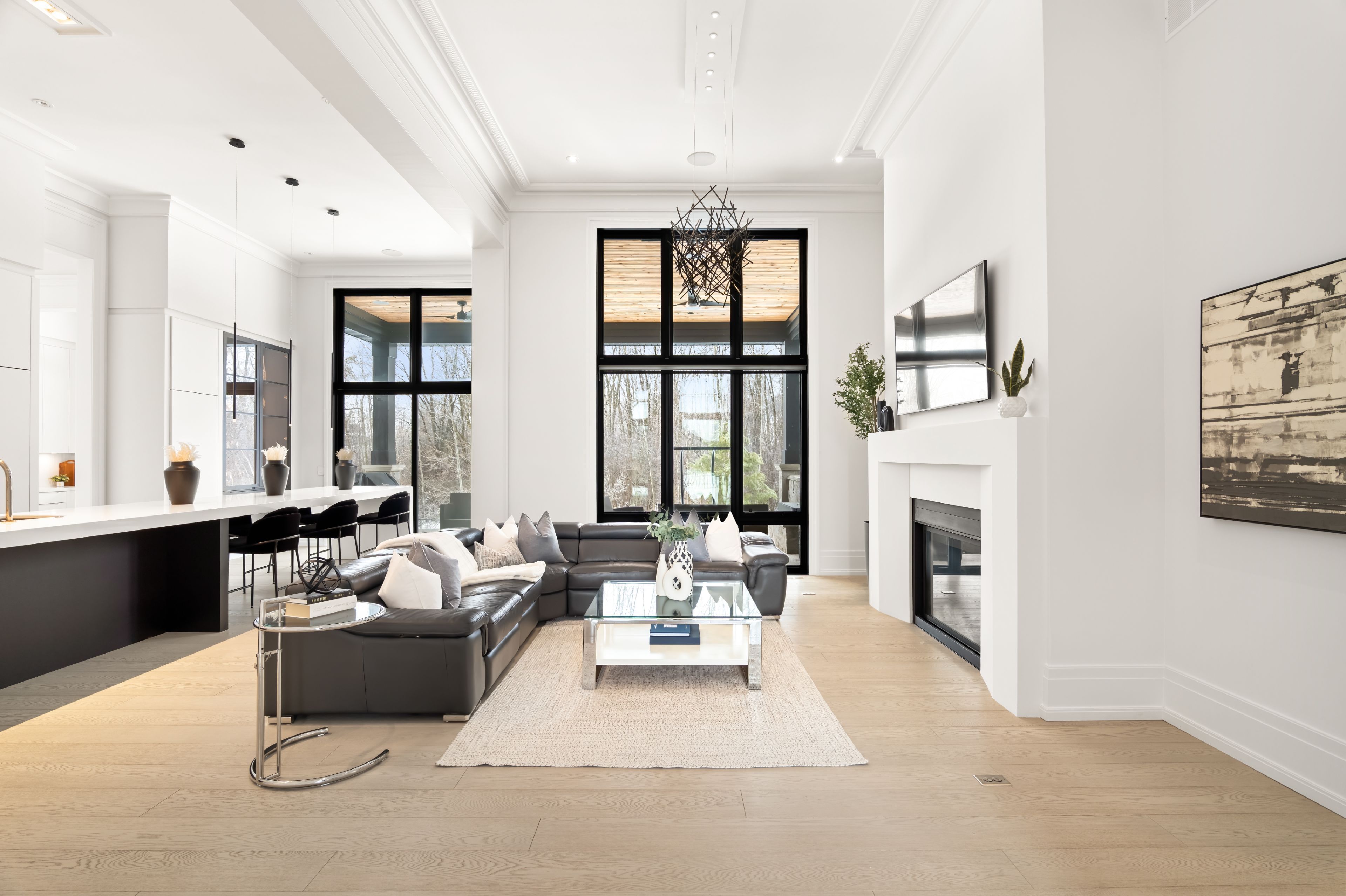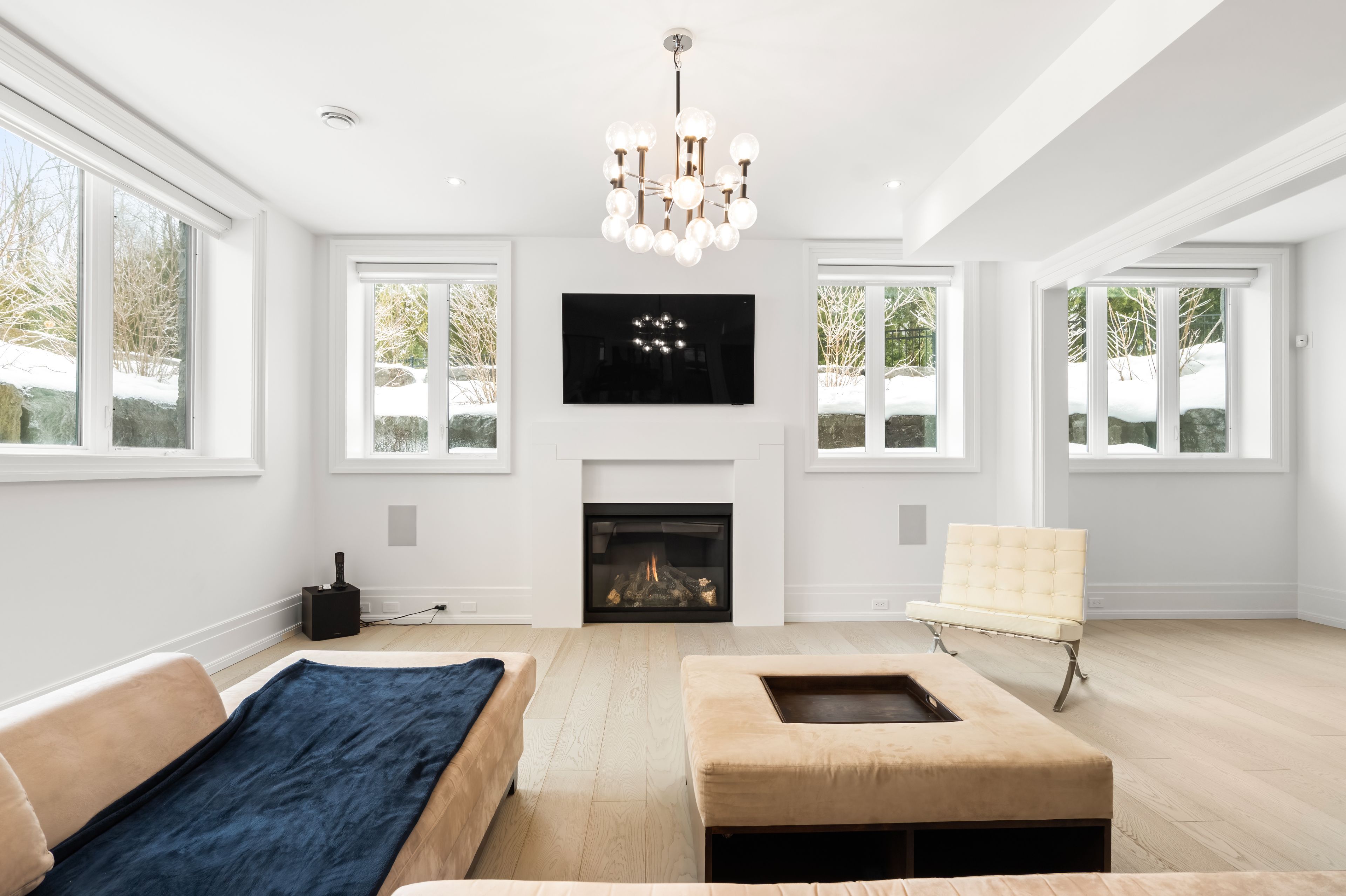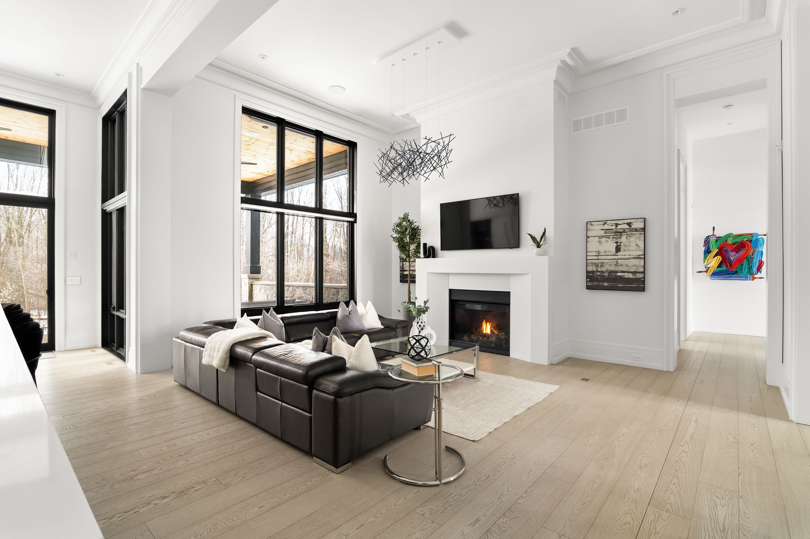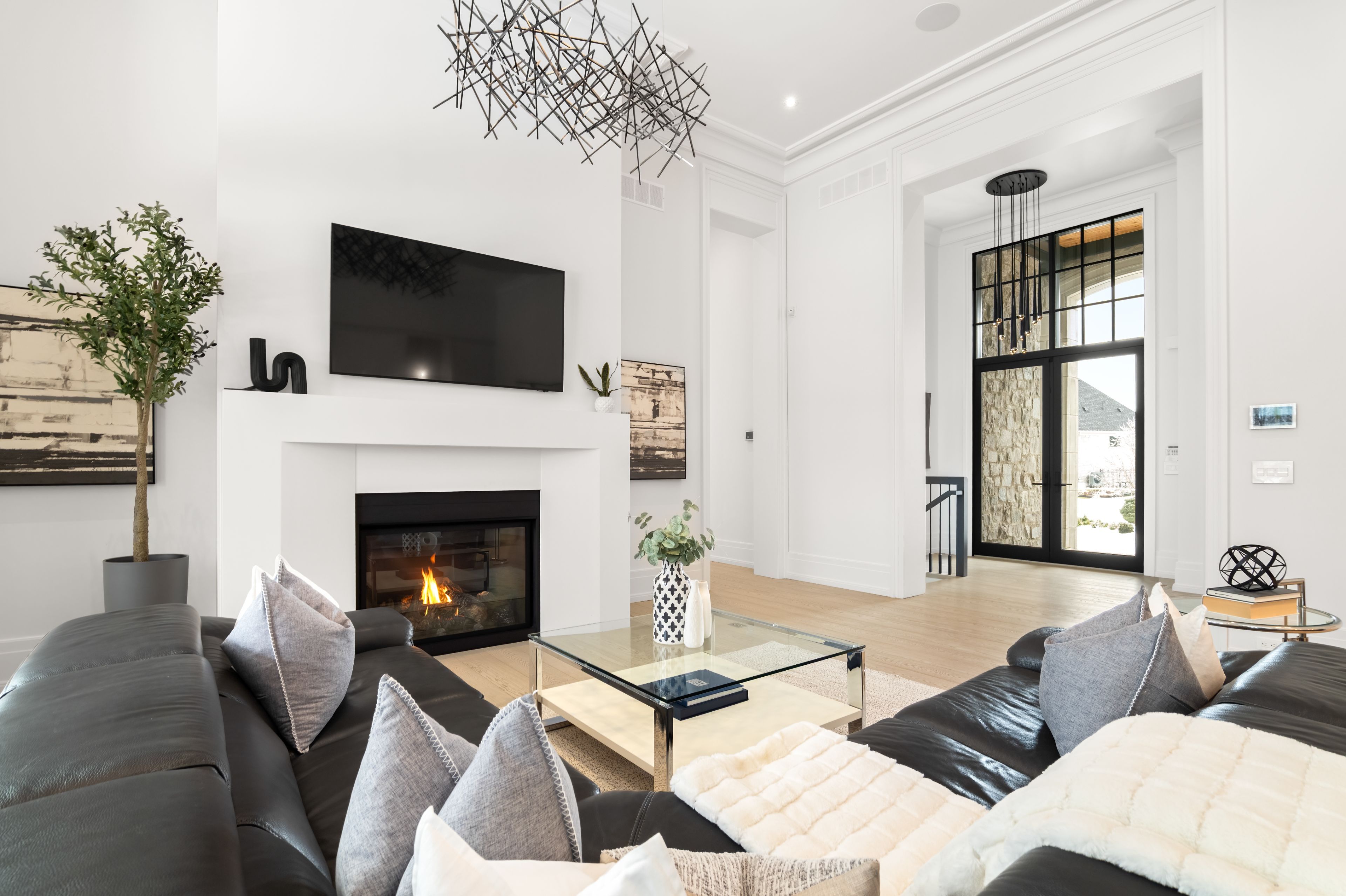 Welcome to life inside heritage lake estates - a private, gated enclave in puslinch known for its mature surroundings and beautiful custom homes. Set on a premium half-acre pie-shaped lot backing onto mature treelines, this custom stone bungalow offers privacy without compromise. With 2,252 square feet on the main floor and soaring 14-foot ceilings, the principal living space is defined by symmetry, scale, and natural light. A custom fireplace anchors the living room, while upgraded crown moulding and floor-to-ceiling windows create a refined yet inviting atmosphere. The kitchen and dining area are gallery-inspired in design, centred around a striking 21-foot stone waterfall island with seating for eight. Integrated cabinetry conceals premium wolf appliances for a seamless aesthetic. Heated floors, custom lighting, and electric blinds reflect the many thoughtful upgrades woven throughout the home. Step outside to a covered back patio complete with built-in heaters and an impressive 350 sq ft gas fire feature, overlooking the fenced yard and tranquil forest backdrop - ideal for elevated, year-round outdoor living. The primary suite is a private retreat, offering 12ft ceilings, floor to ceiling windows, a generous walk-in closet and spa-inspired five-piece ensuite with jet spa shower system. Across from this, the well-appointed laundry room and additional main-floor bedroom, featuring with its own ensuite bath and walk-in closet, complete the main level. The fully finished lower level adds two bedrooms, each accompanied by an ensuite bathroom, a spacious recreation room with custom fireplace, dedicated office space, and a home gym - perfectly suited for growing families or multi-generational living. A functional mudroom with built-in cabinetry offers direct access to the heated three-car garage and walk-down access to the basement. 153 heritage lake drive invites you to embrace a quiet kind of luxury, framed by the serenity of puslinch lake.