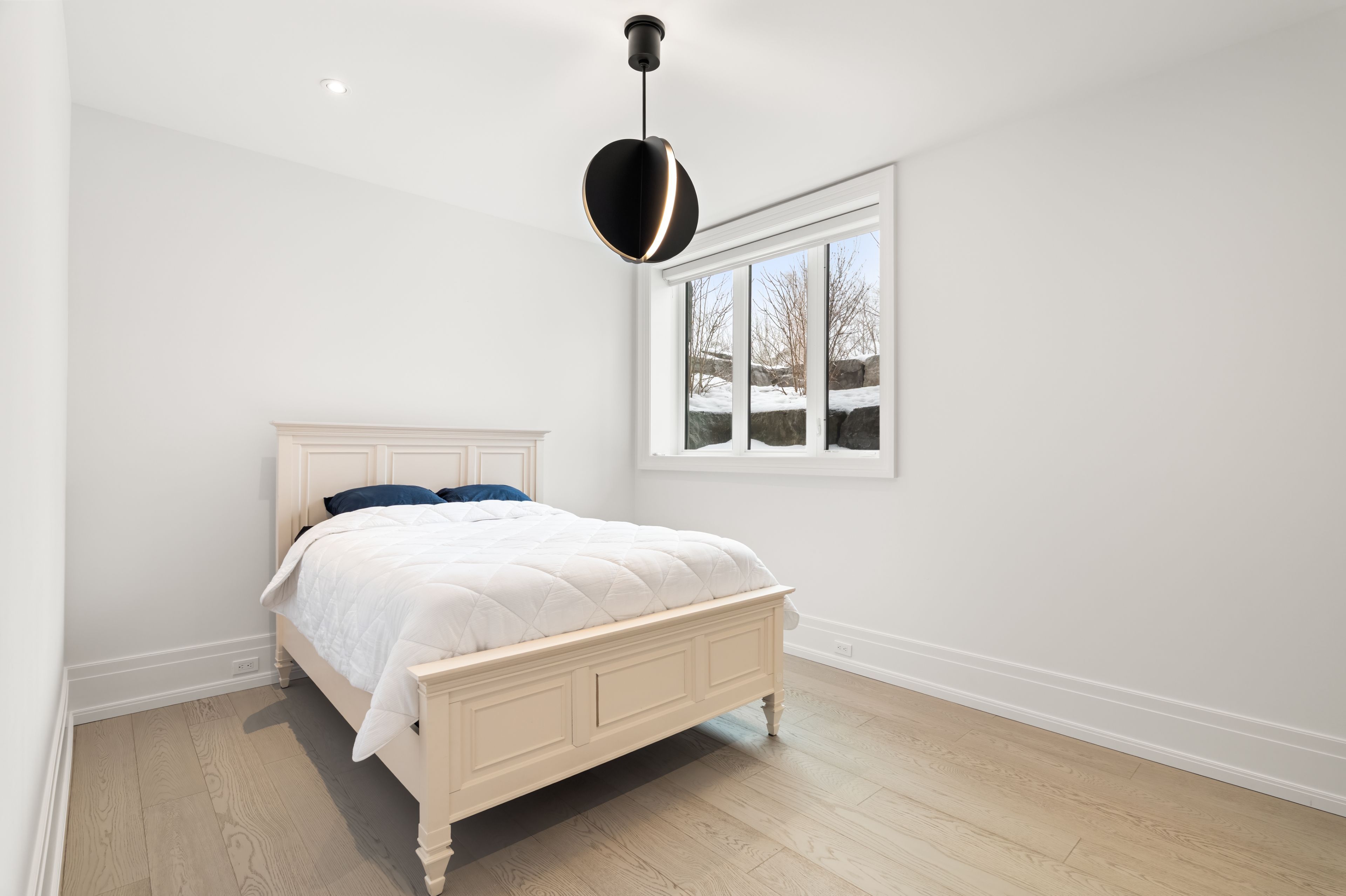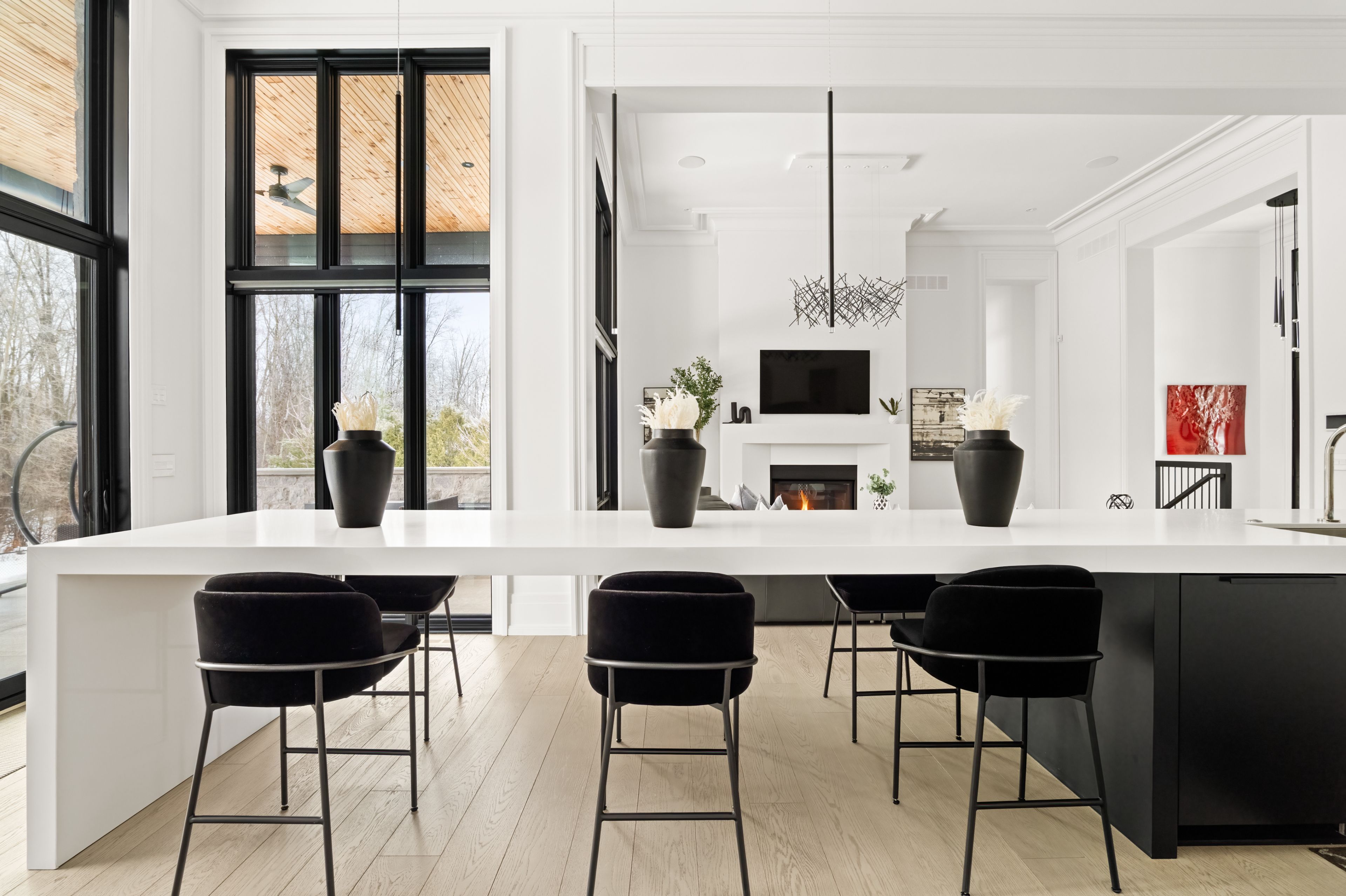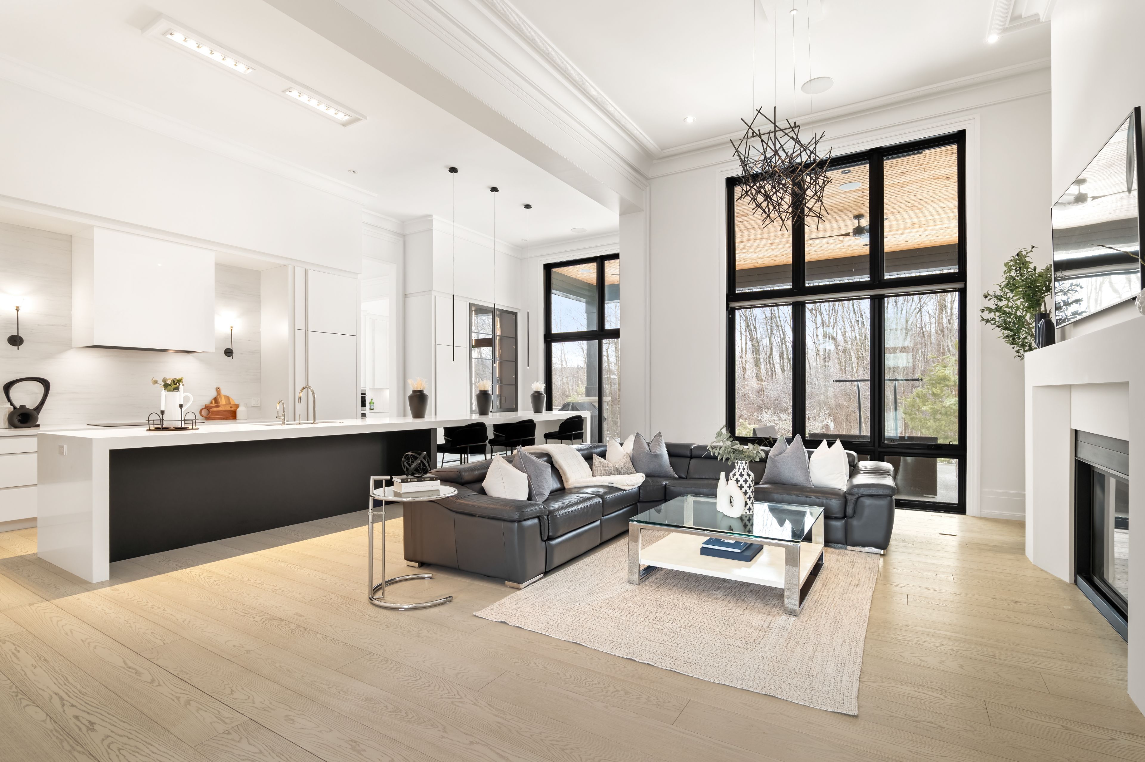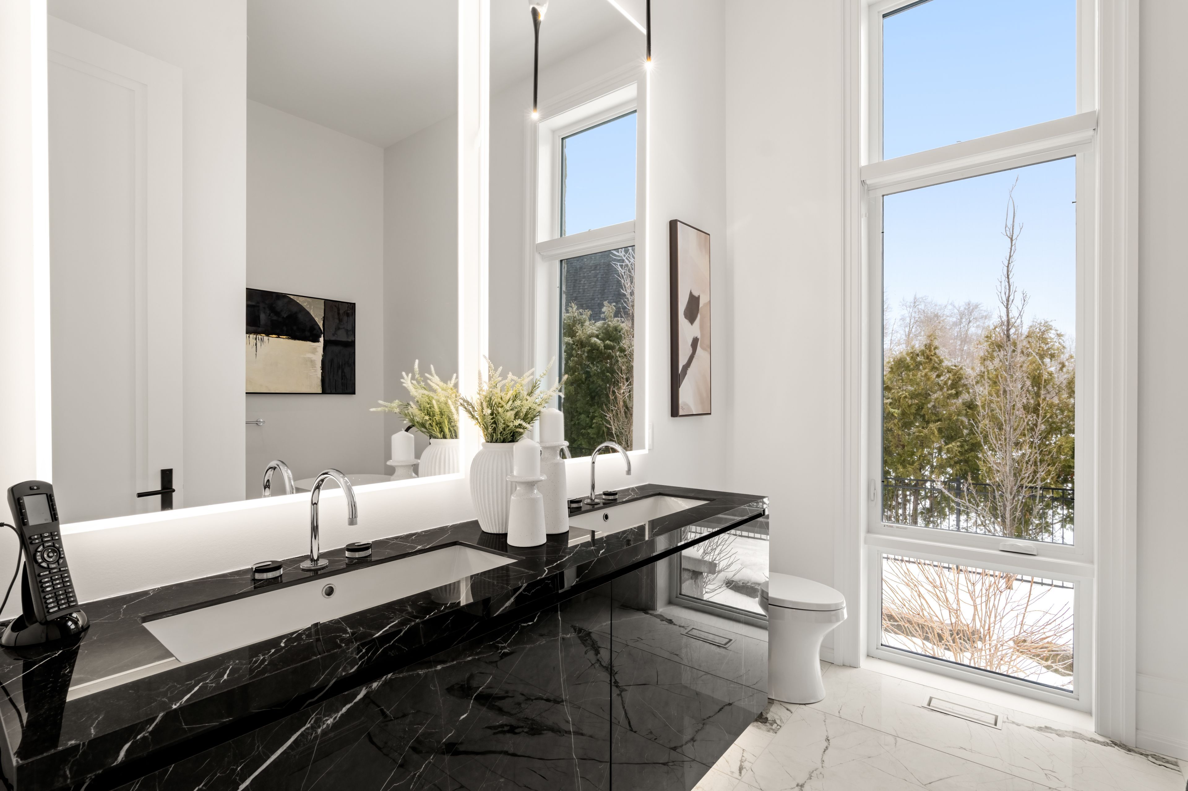 Welcome to life inside heritage lake estates - a private, gated enclave in puslinch known for its mature surroundings and beautiful custom homes. Set on a premium half-acre pie-shaped lot backing onto mature treelines, this custom stone bungalow offers privacy without compromise. With 2,252 square feet on the main floor and soaring 14-foot ceilings, the principal living space is defined by symmetry, scale, and natural light. A custom fireplace anchors the living room, while upgraded crown moulding and floor-to-ceiling windows create a refined yet inviting atmosphere. The kitchen and dining area are gallery-inspired in design, centred around a striking 21-foot stone waterfall island with seating for eight. Integrated cabinetry conceals premium wolf appliances for a seamless aesthetic. Heated floors, custom lighting, and electric blinds reflect the many thoughtful upgrades woven throughout the home. Step outside to a covered back patio complete with built-in heaters and an impressive 350 sq ft gas fire feature, overlooking the fenced yard and tranquil forest backdrop - ideal for elevated, year-round outdoor living. The primary suite is a private retreat, offering 12ft ceilings, floor to ceiling windows, a generous walk-in closet and spa-inspired five-piece ensuite with jet spa shower system. Across from this, the well-appointed laundry room and additional main-floor bedroom, featuring with its own ensuite bath and walk-in closet, complete the main level. The fully finished lower level adds two bedrooms, each accompanied by an ensuite bathroom, a spacious recreation room with custom fireplace, dedicated office space, and a home gym - perfectly suited for growing families or multi-generational living. A functional mudroom with built-in cabinetry offers direct access to the heated three-car garage and walk-down access to the basement. 153 heritage lake drive invites you to embrace a quiet kind of luxury, framed by the serenity of puslinch lake.