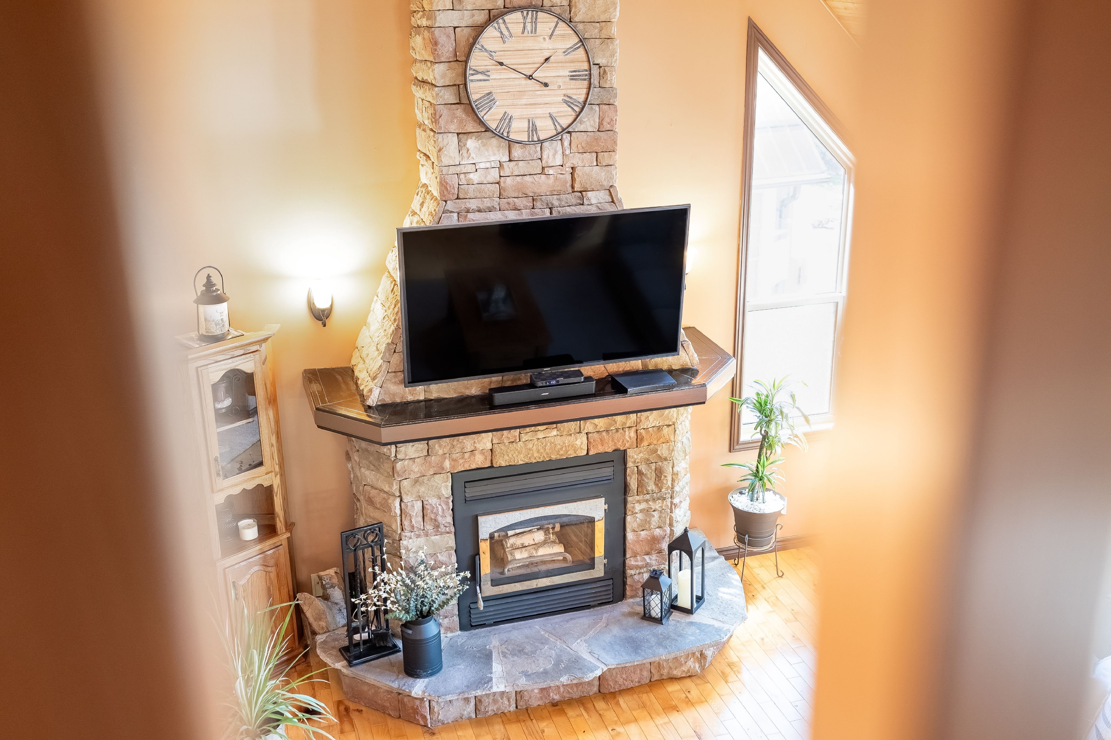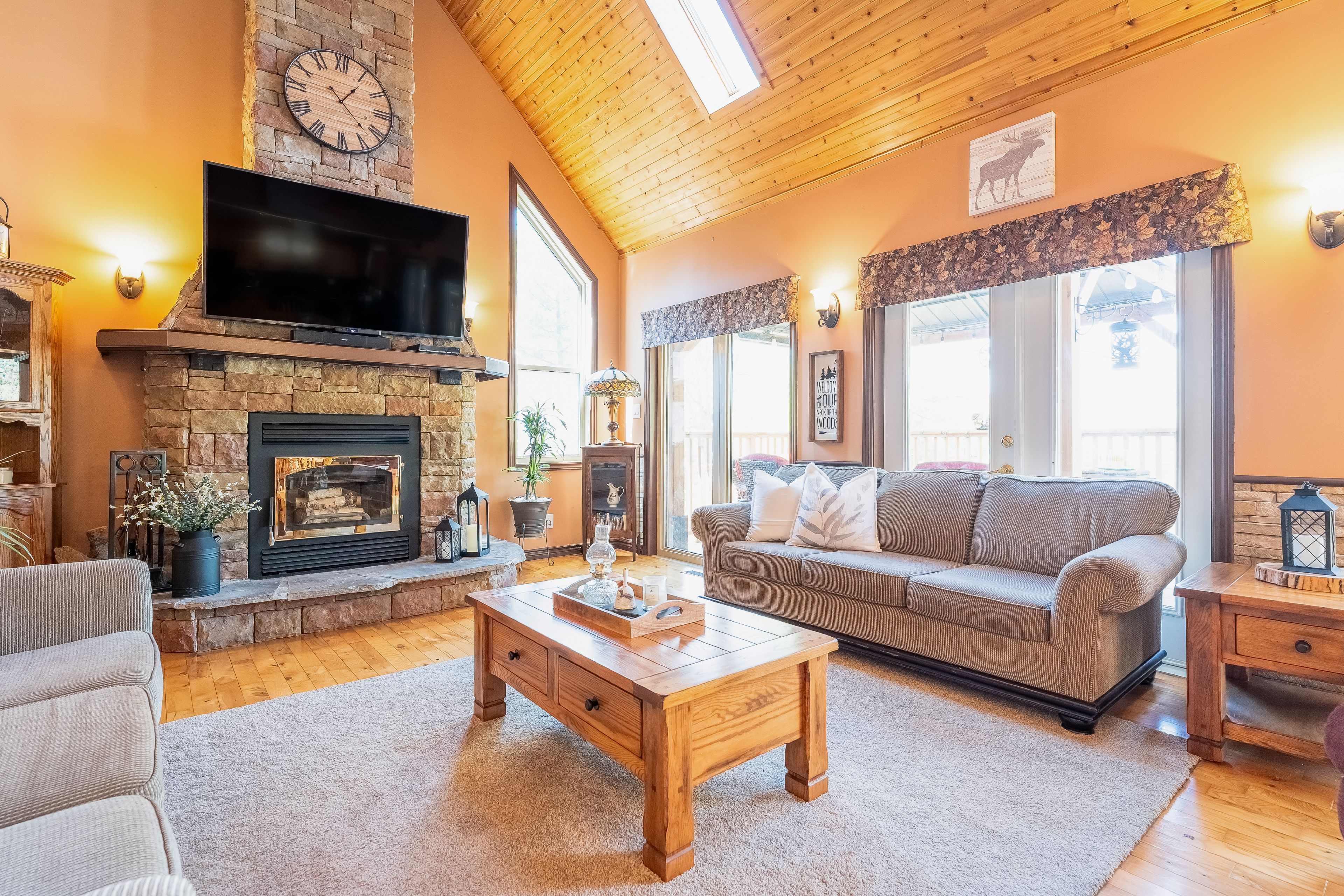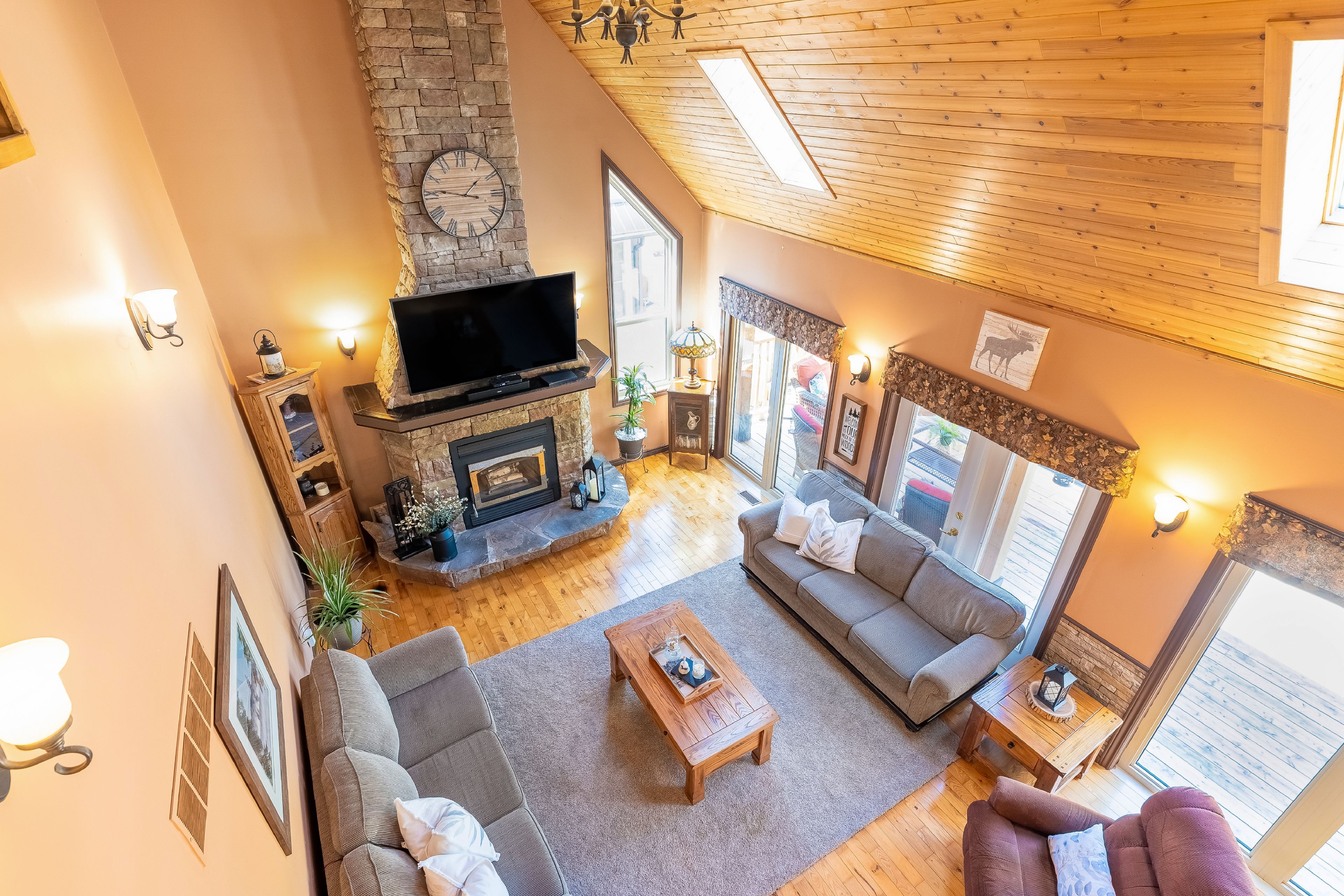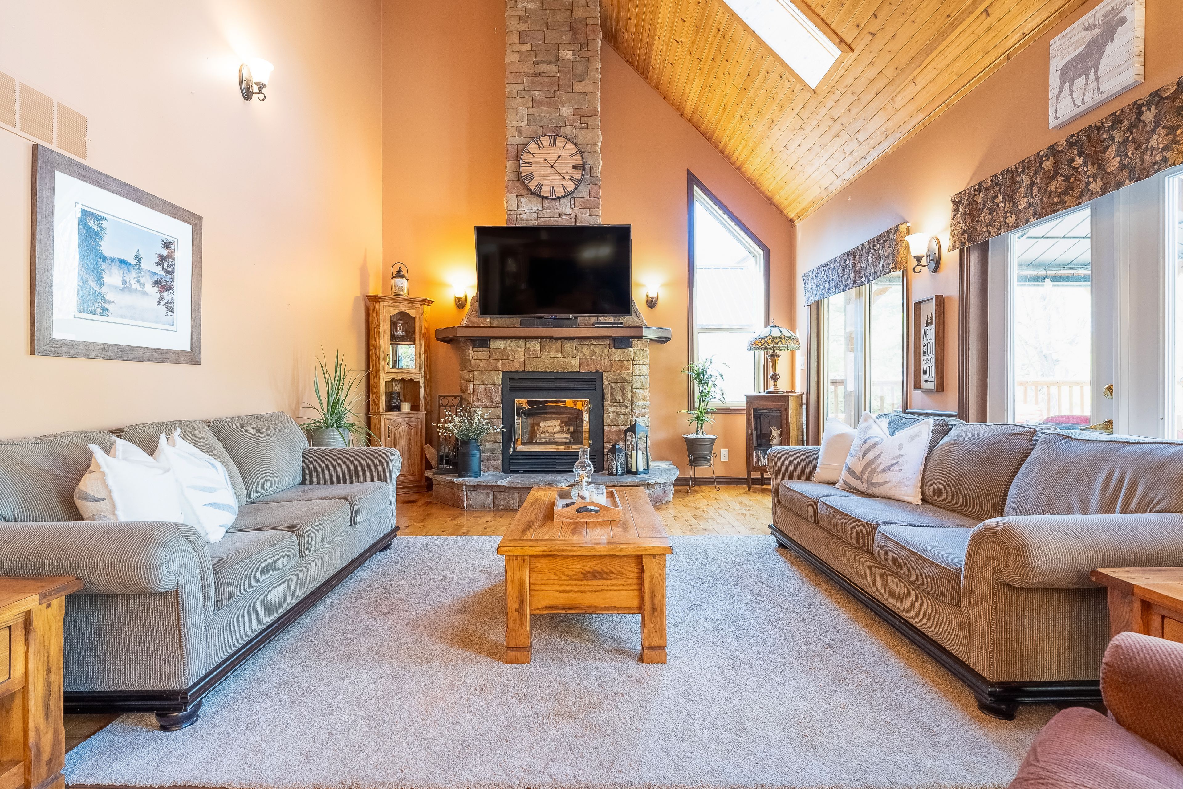 • Bright open-concept main level with vaulted ceilings and floor-to-ceiling fireplace.