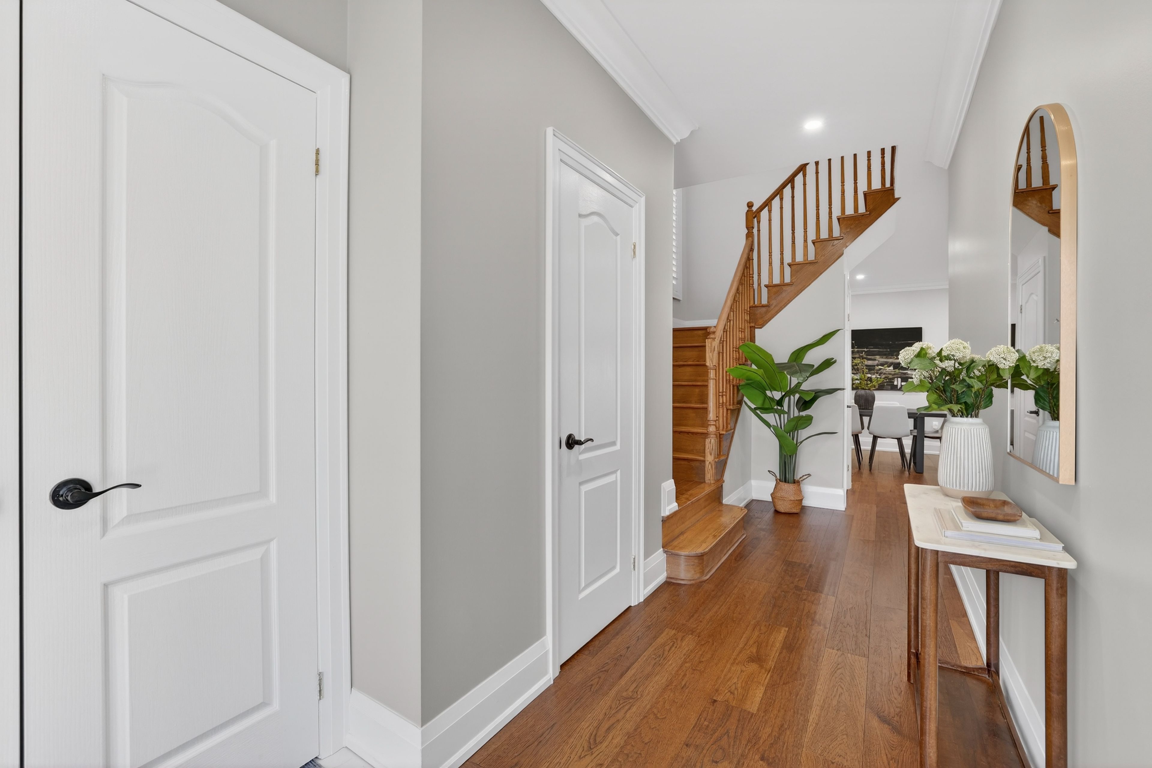 • Expansive main level with nine-foot ceilings and hardwood flooring.