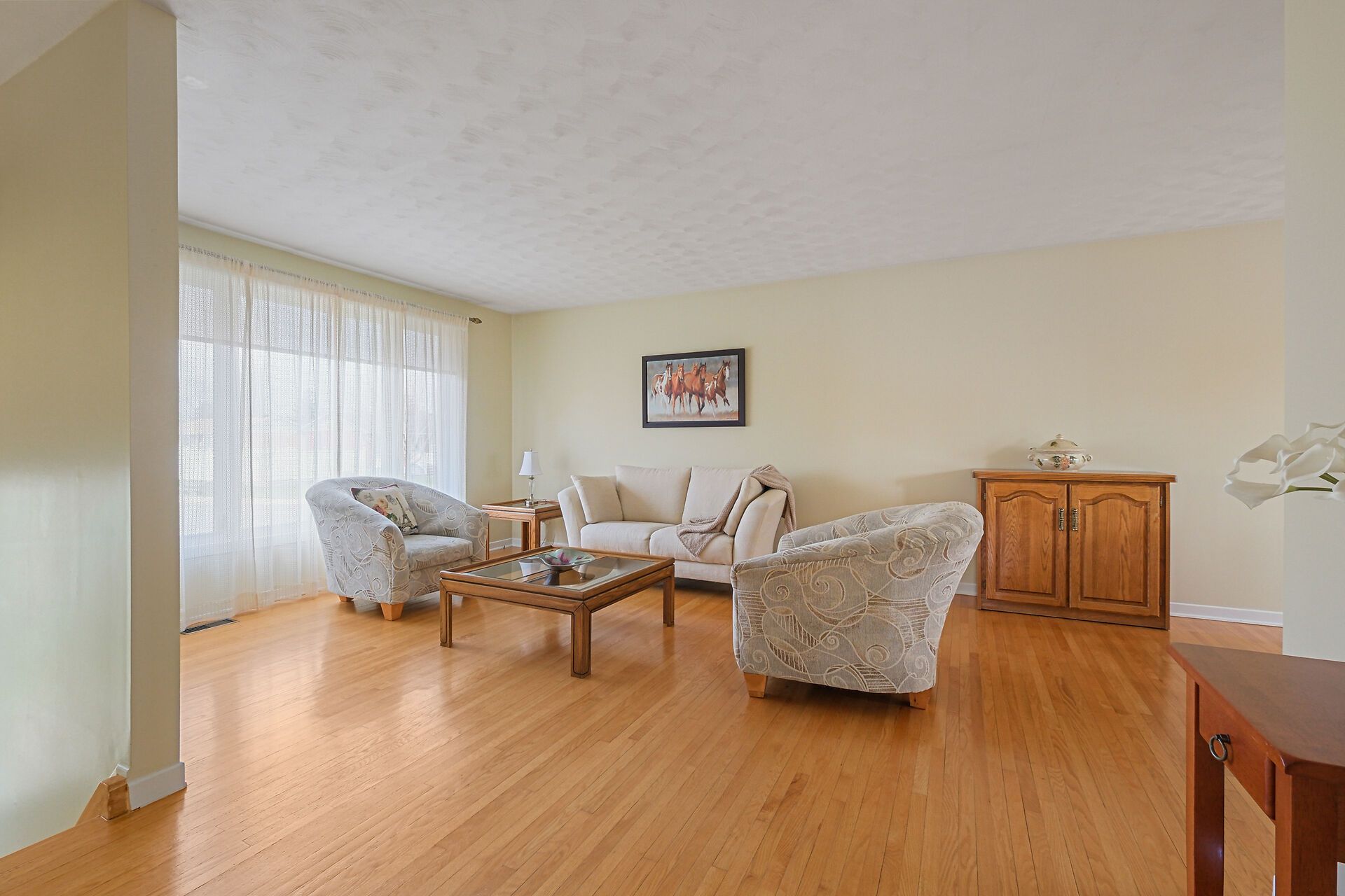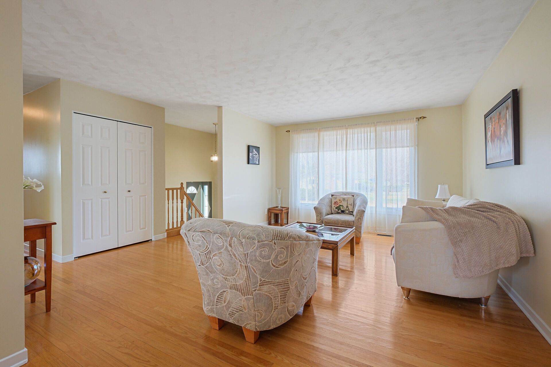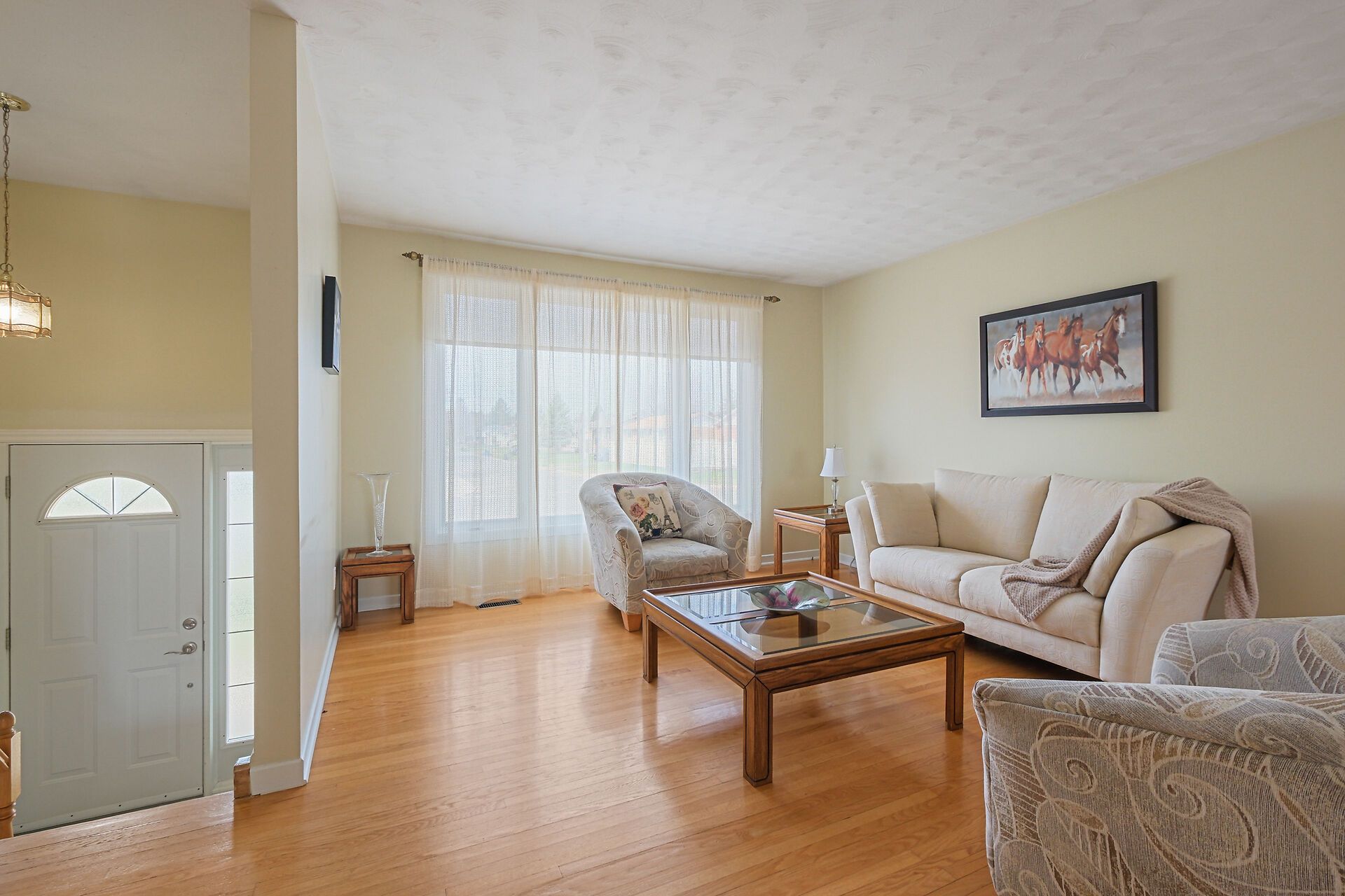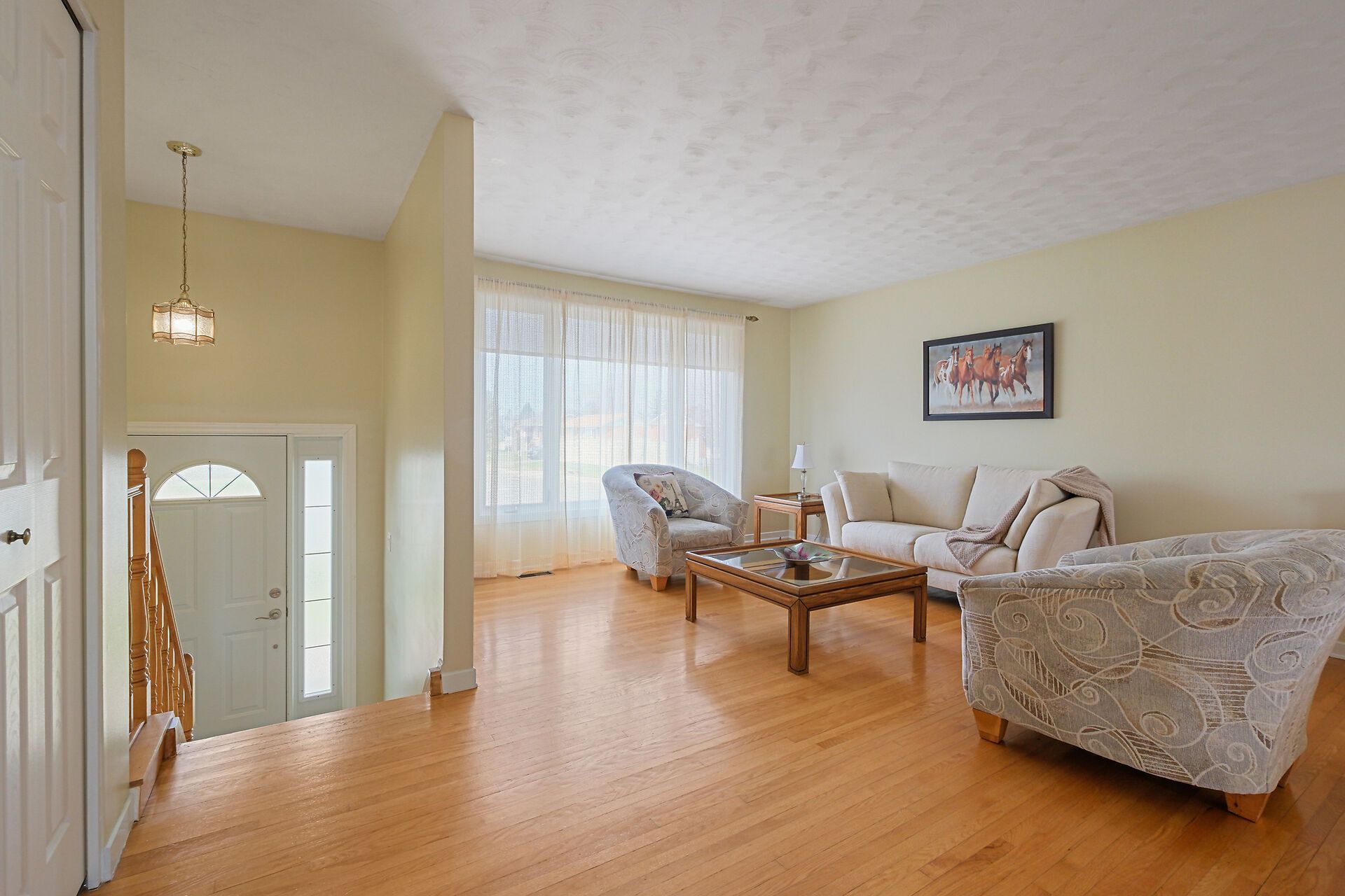 • Spacious living area with large windows and hardwood flooring throughout.