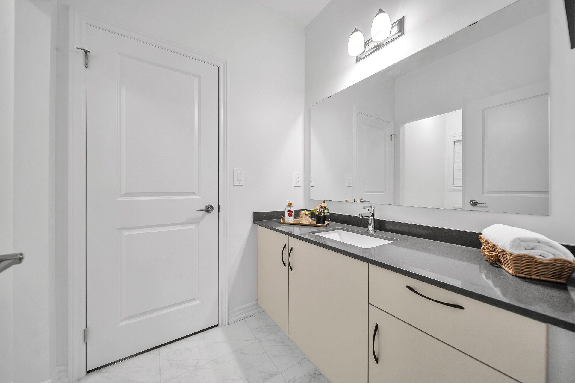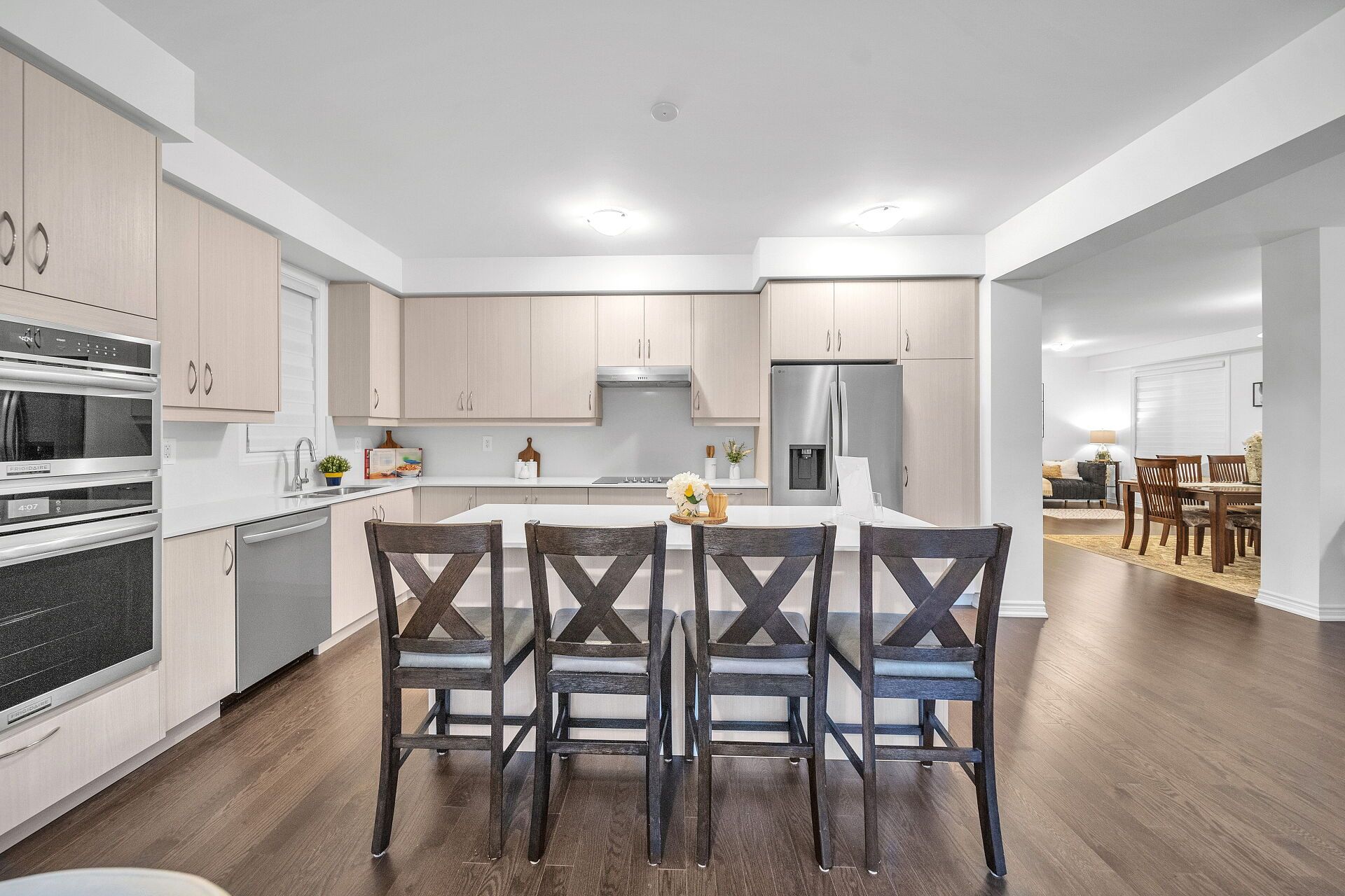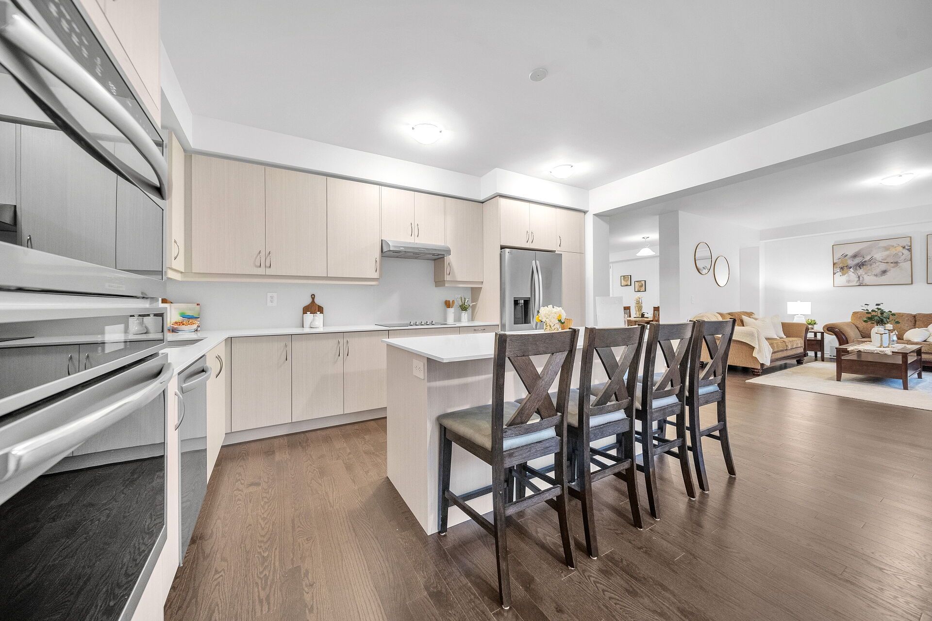• Gourmet kitchen with modern appliances and quartz countertops.