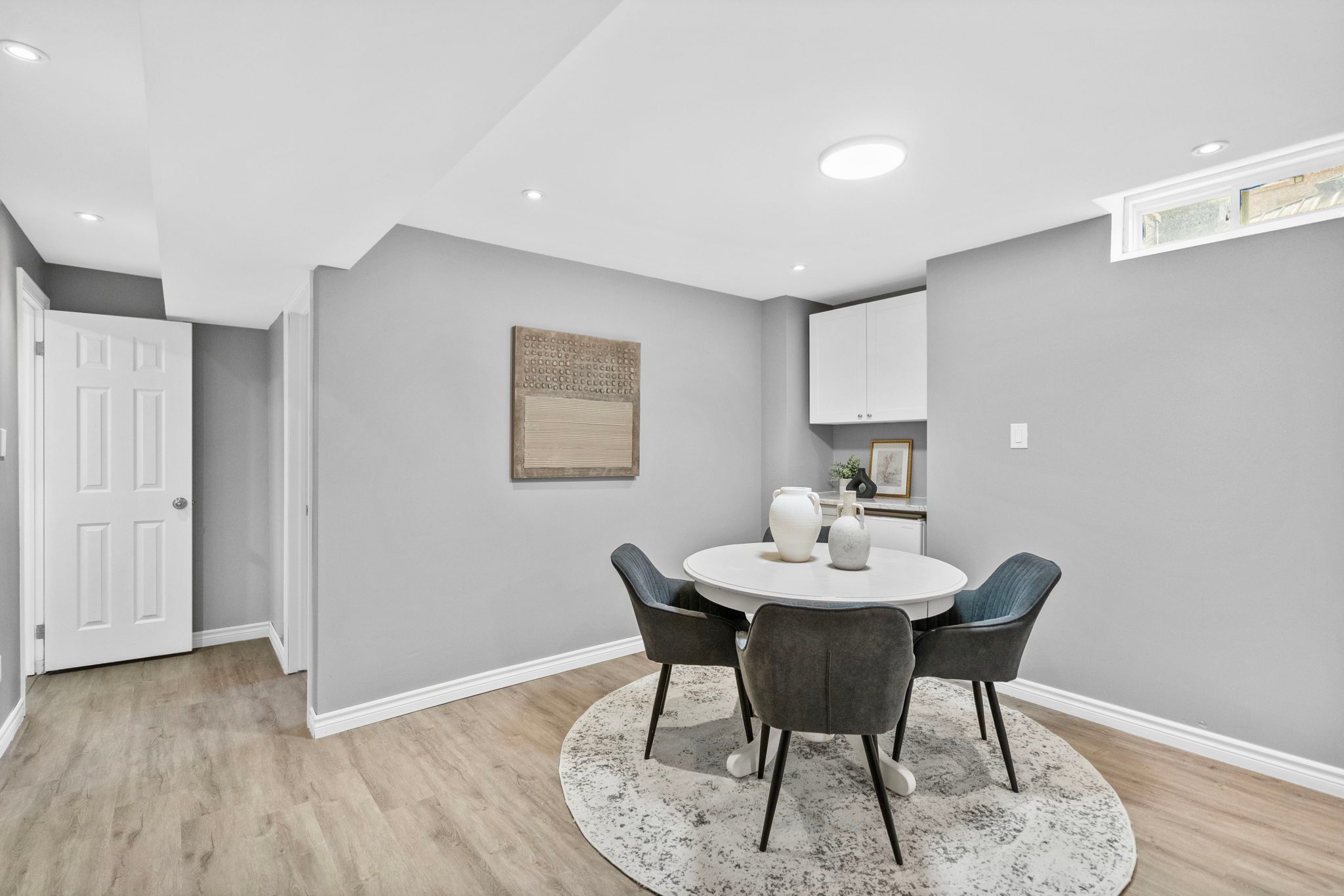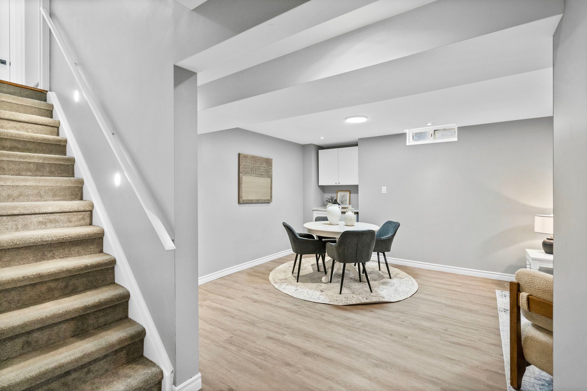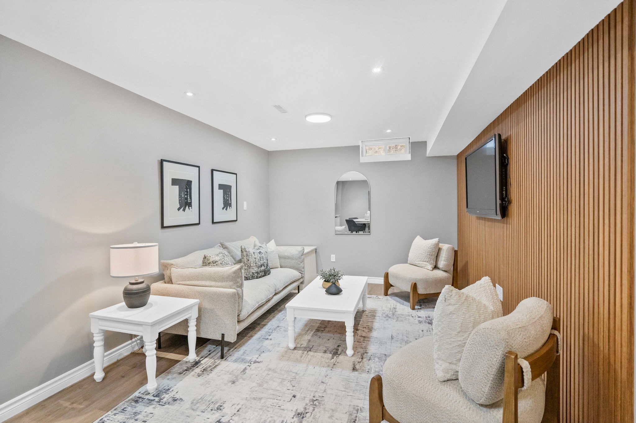 • Finished basement with lounge area, bar fridge, and recreation room.