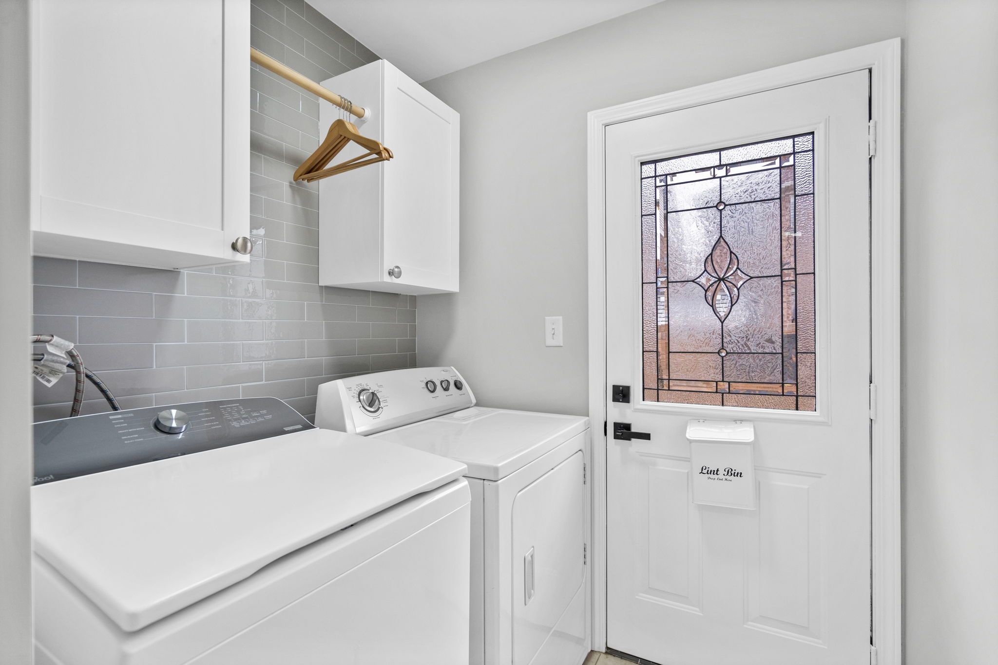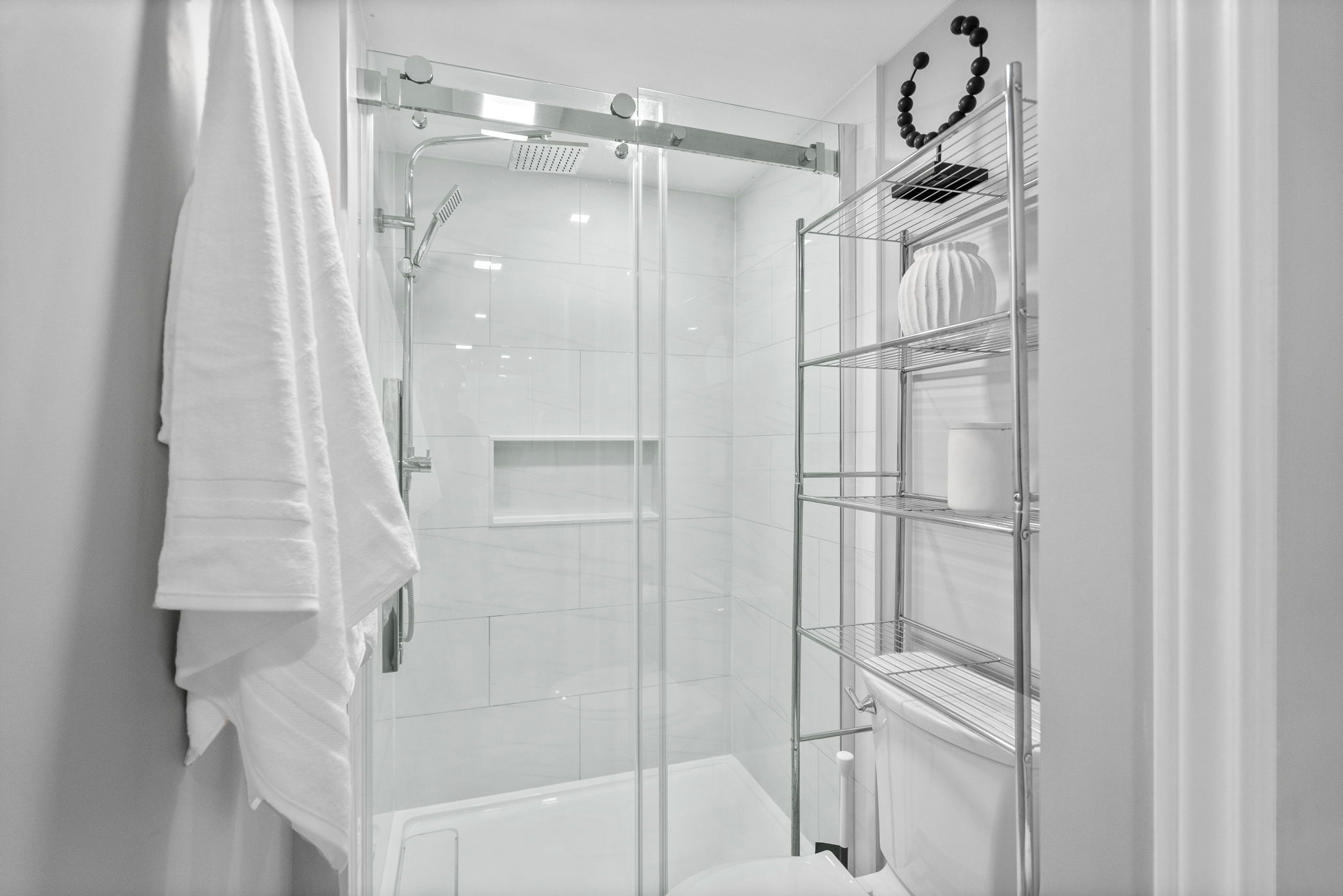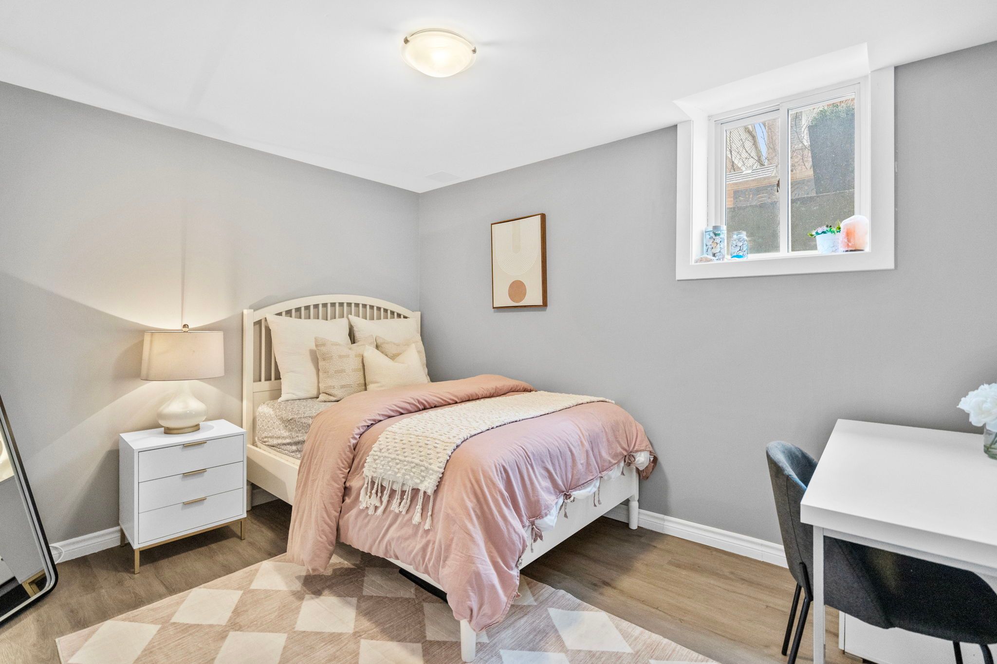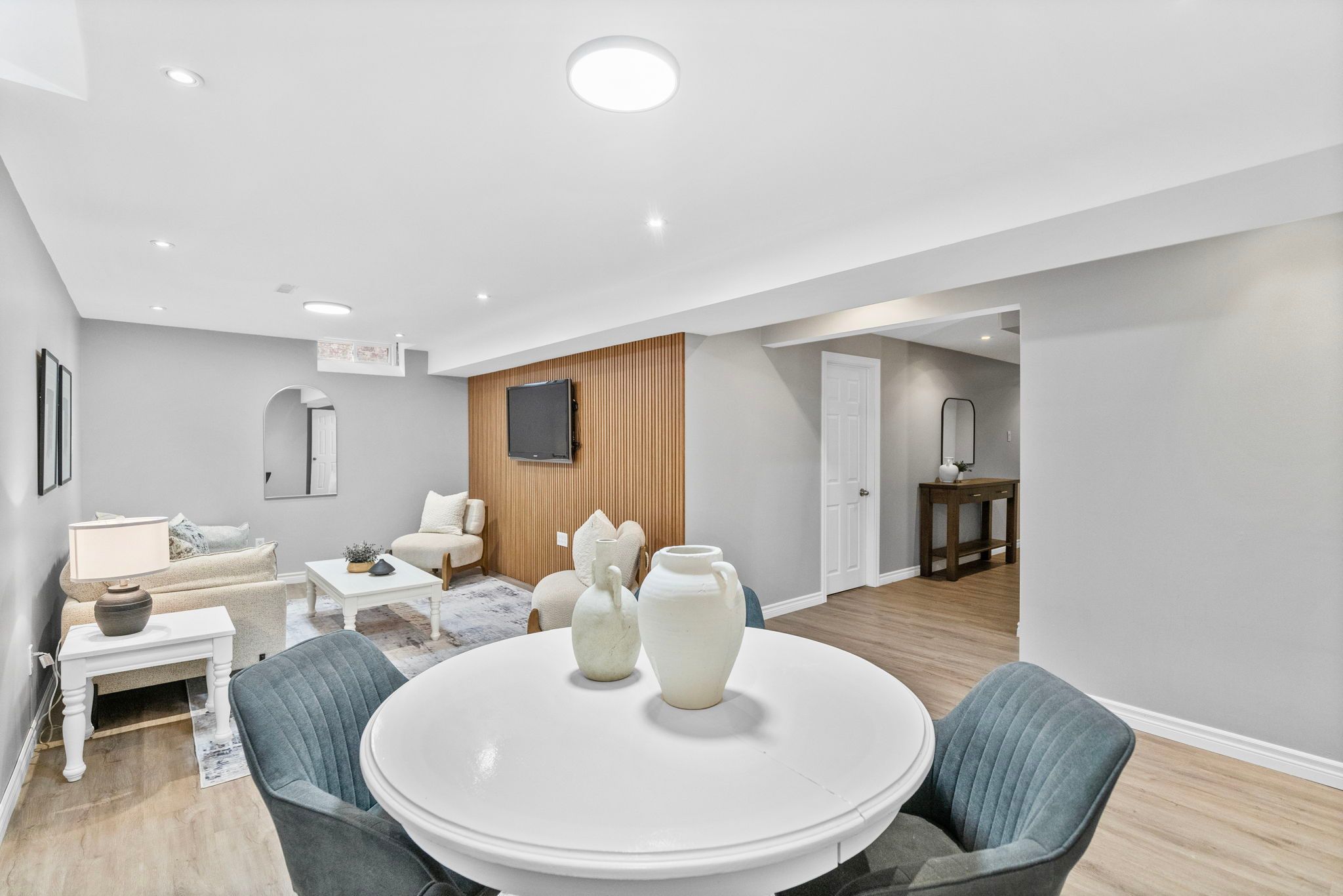 • Finished basement with lounge area, bar fridge, and recreation room.