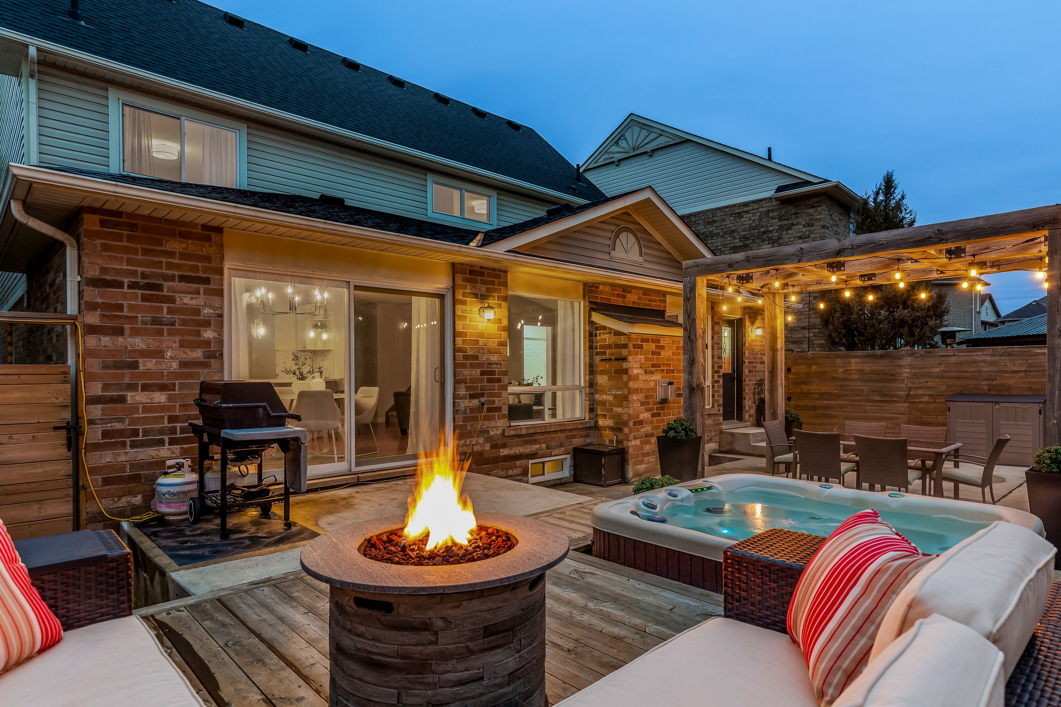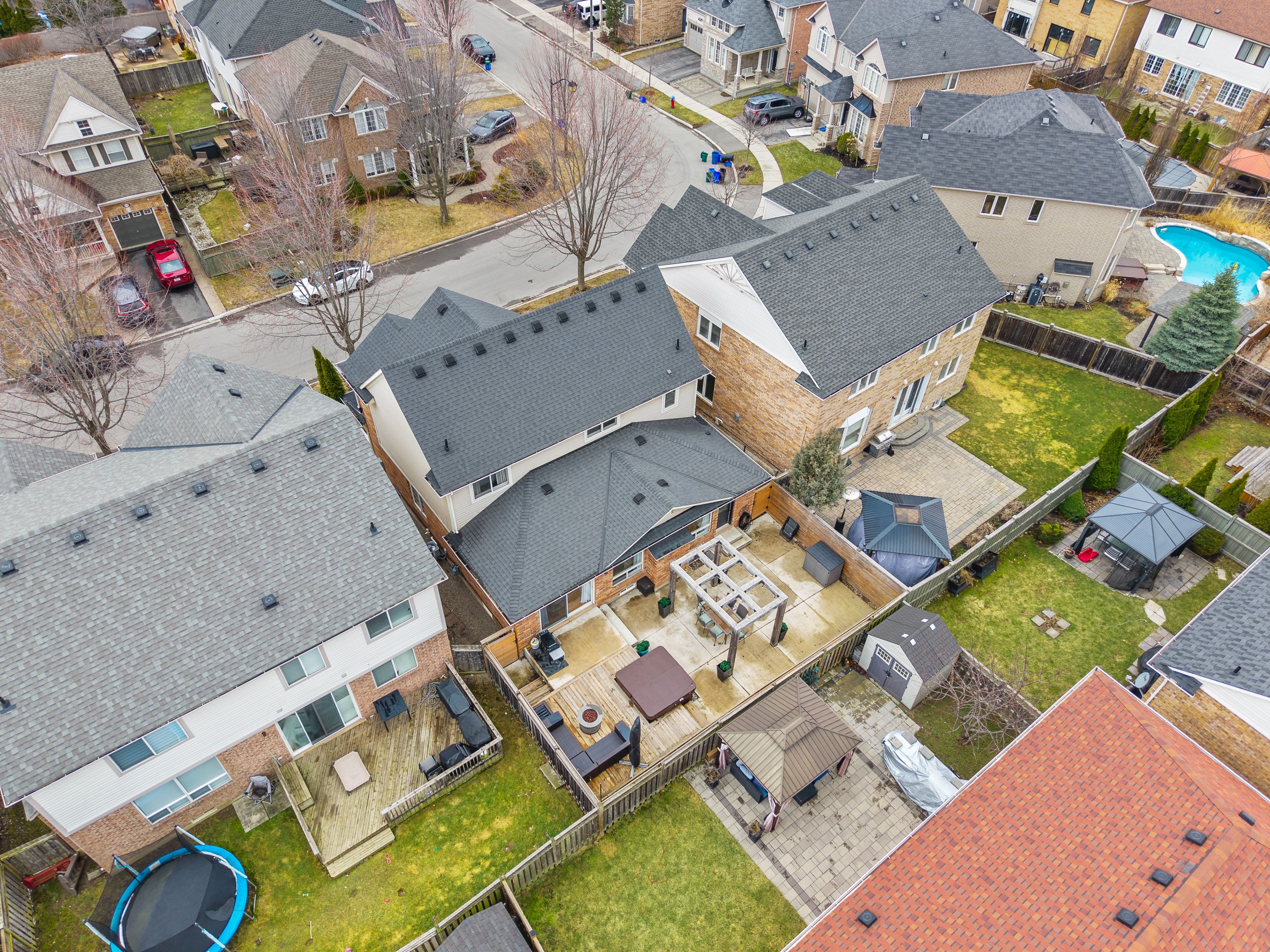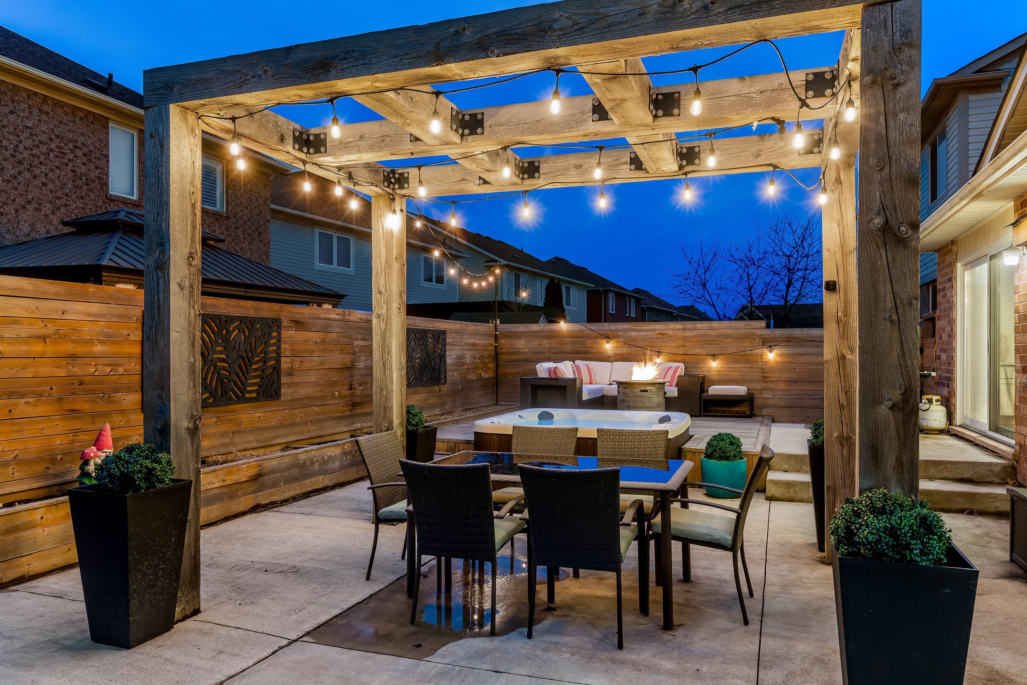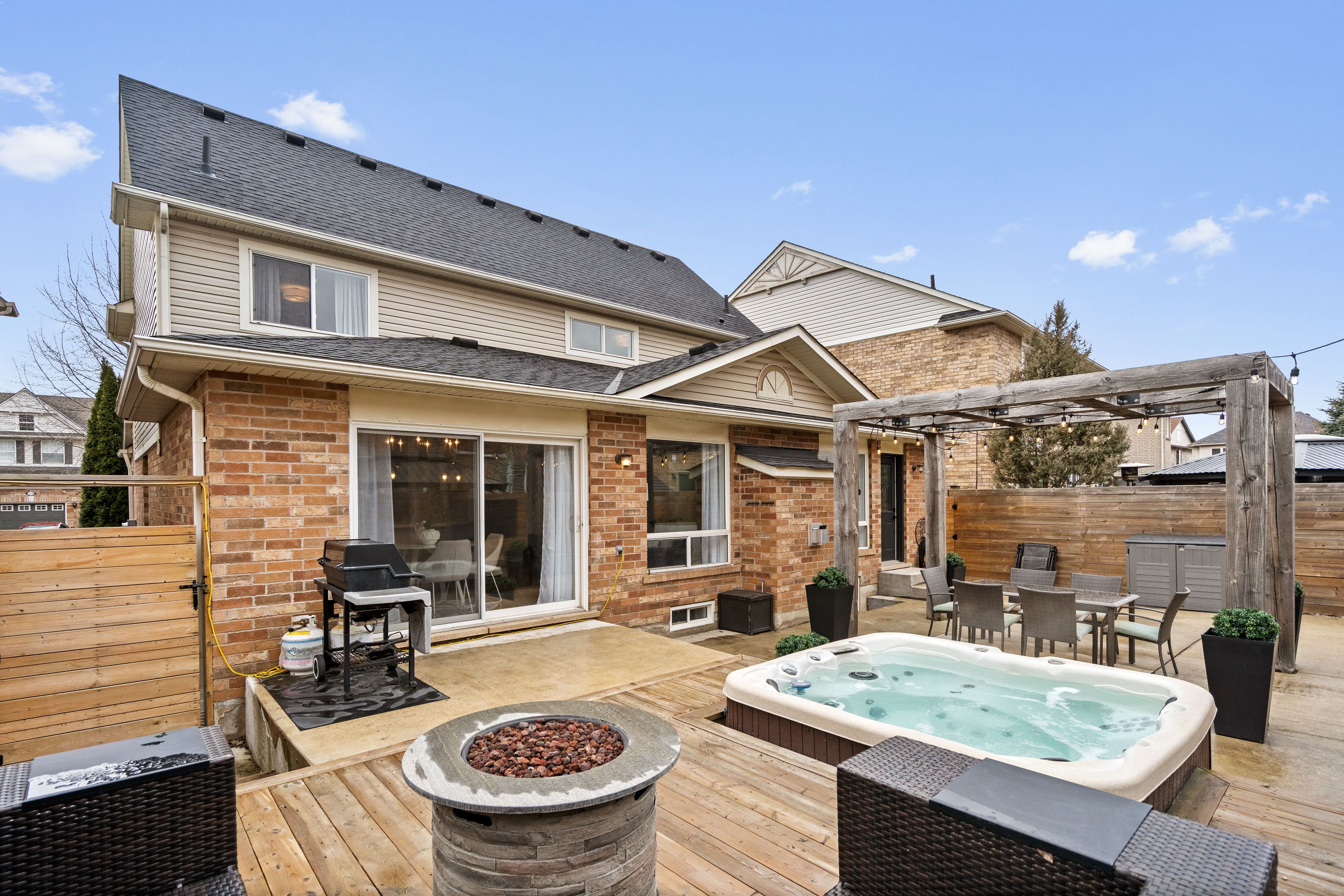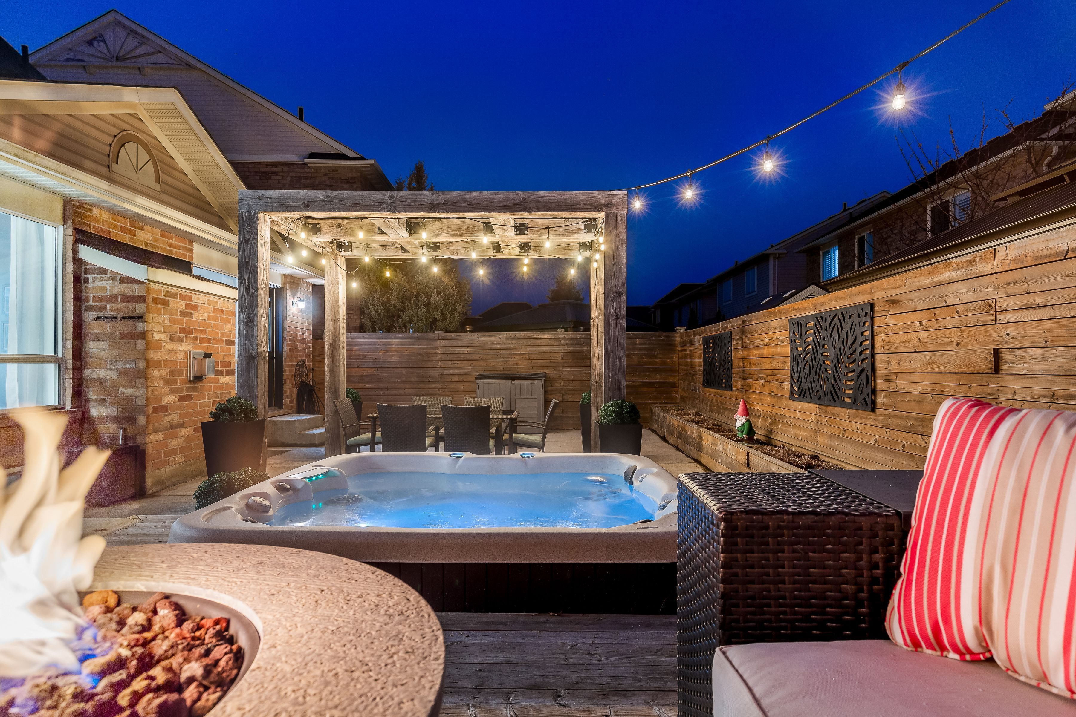 • Backyard features hot tub, custom pergola, and low maintenance design.