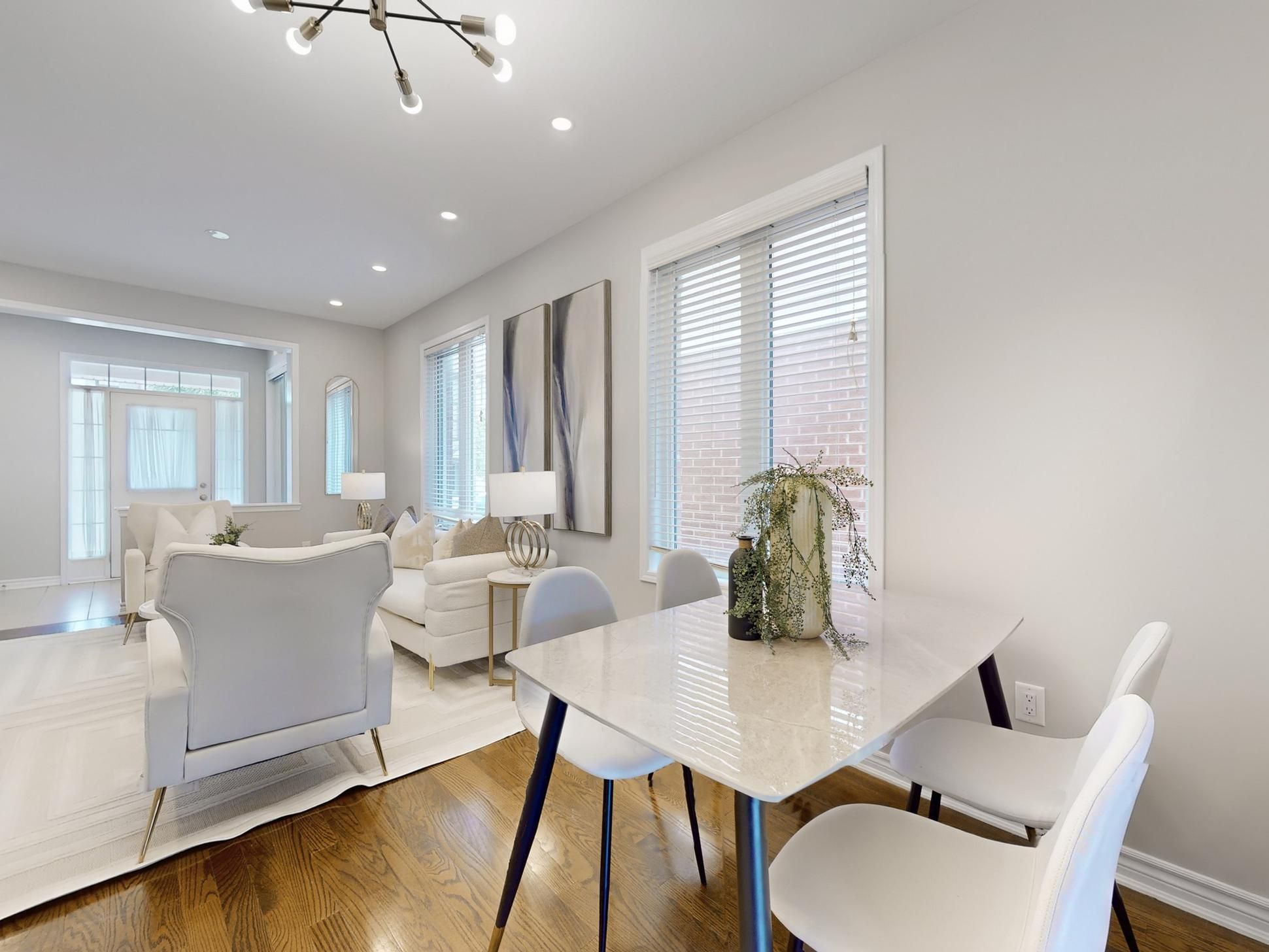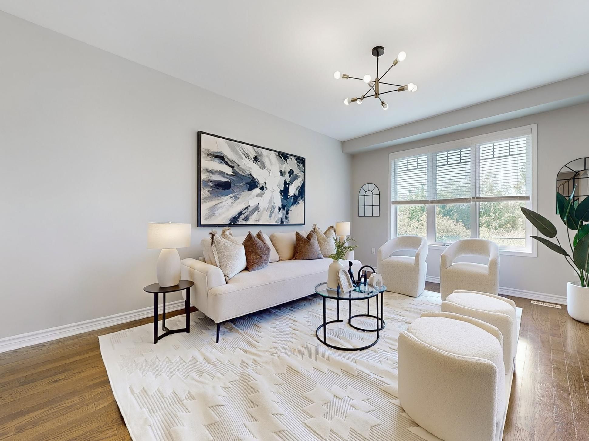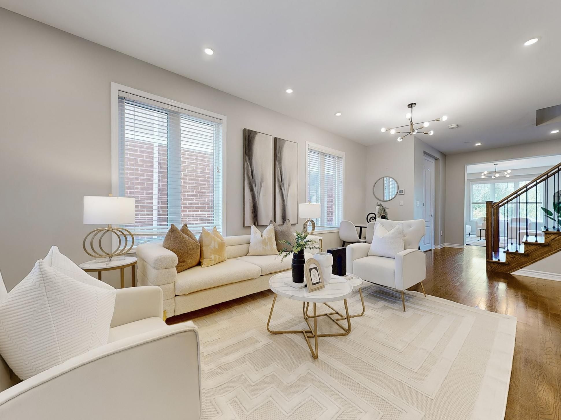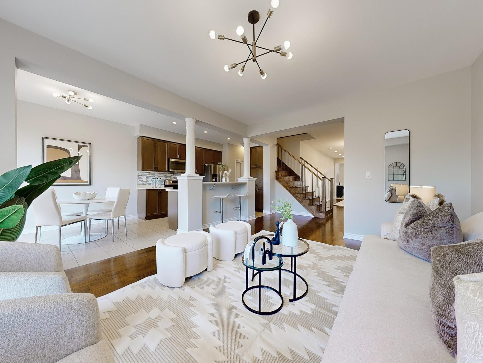 • Open concept living areas with hardwood flooring and high ceilings.