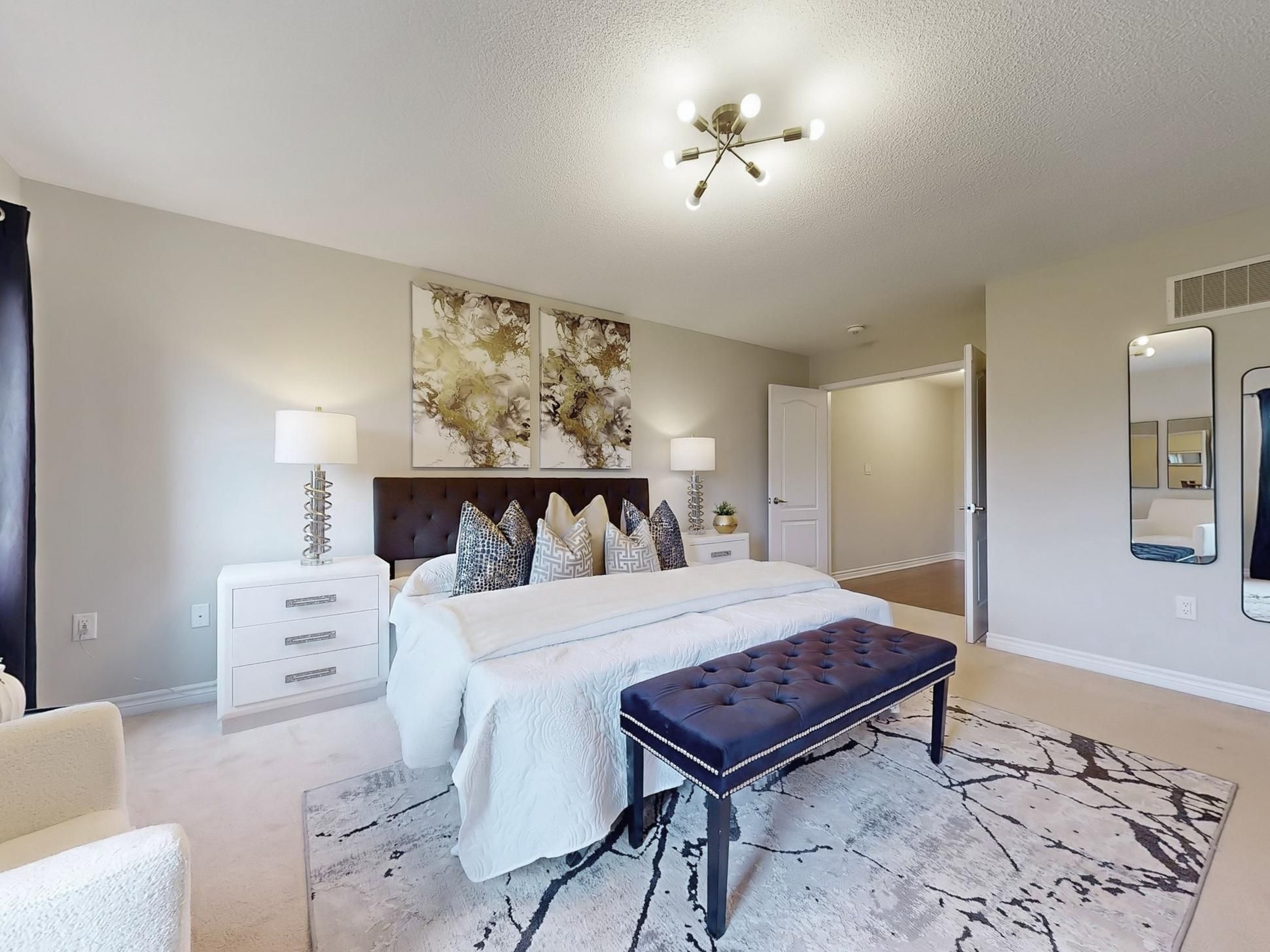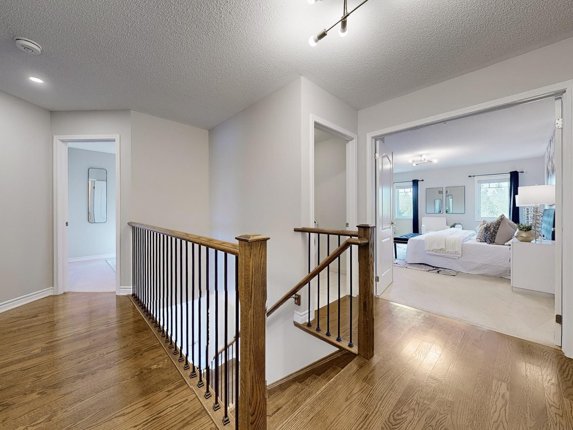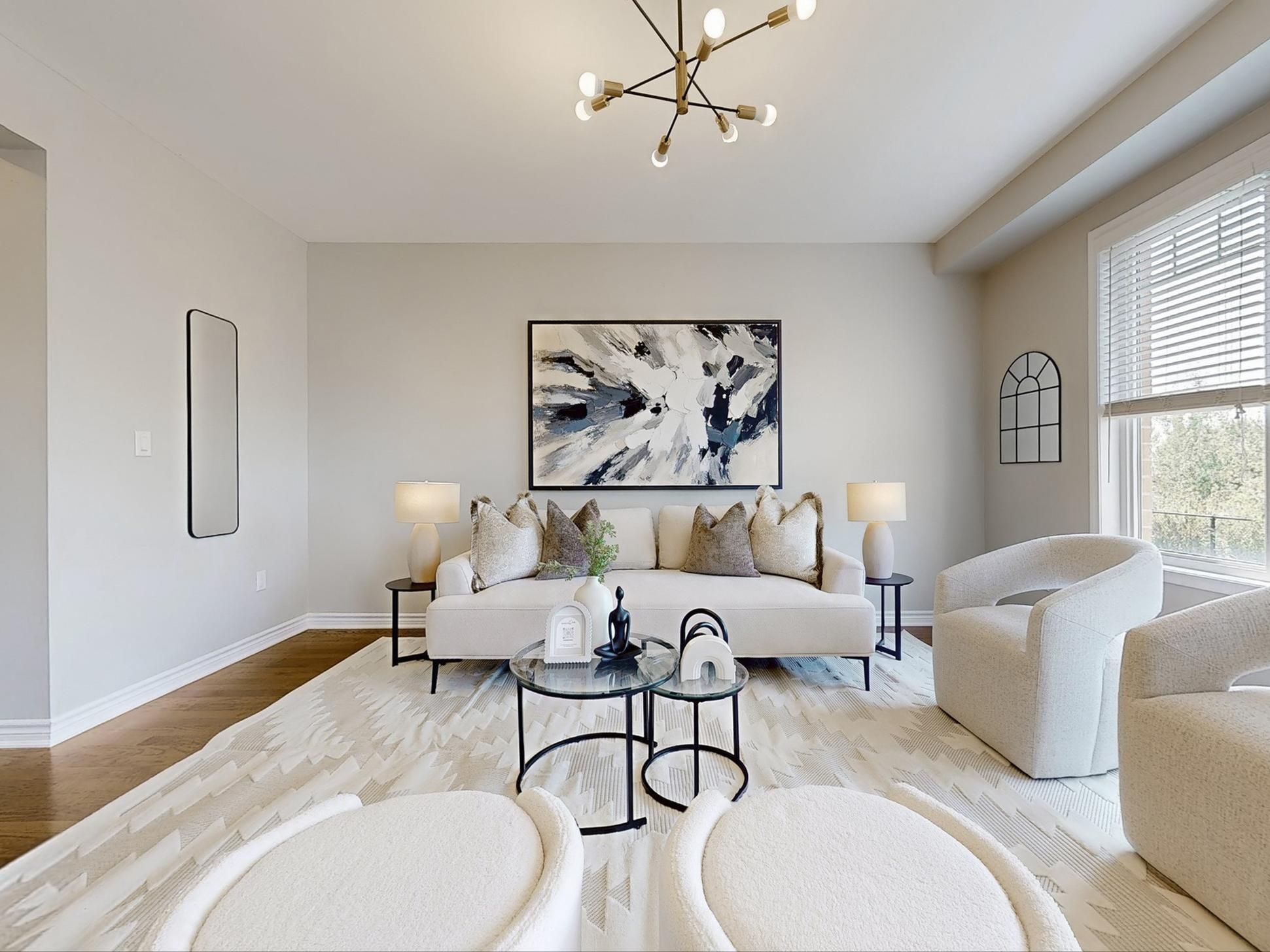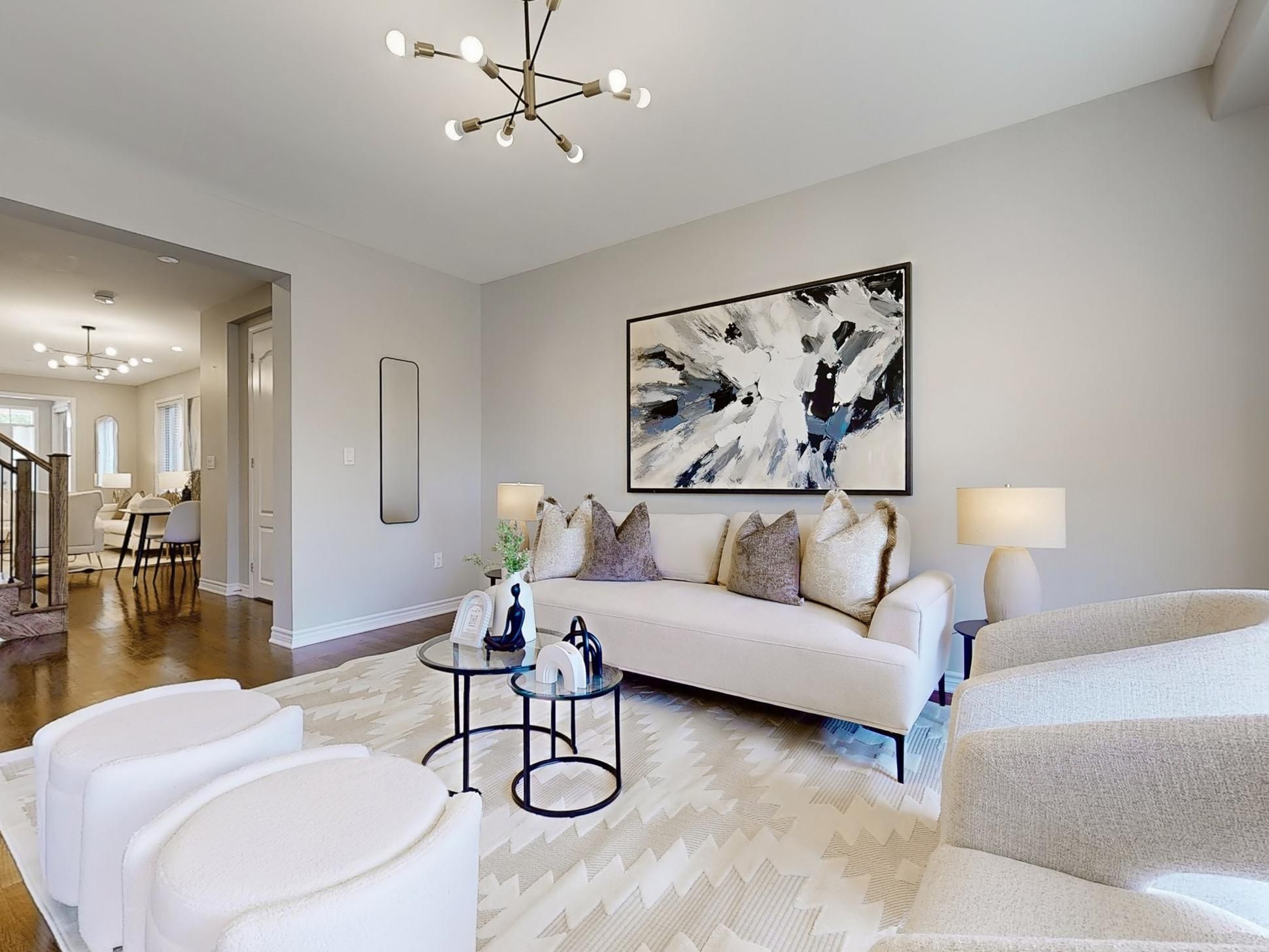 • Open concept living areas with hardwood flooring and high ceilings.