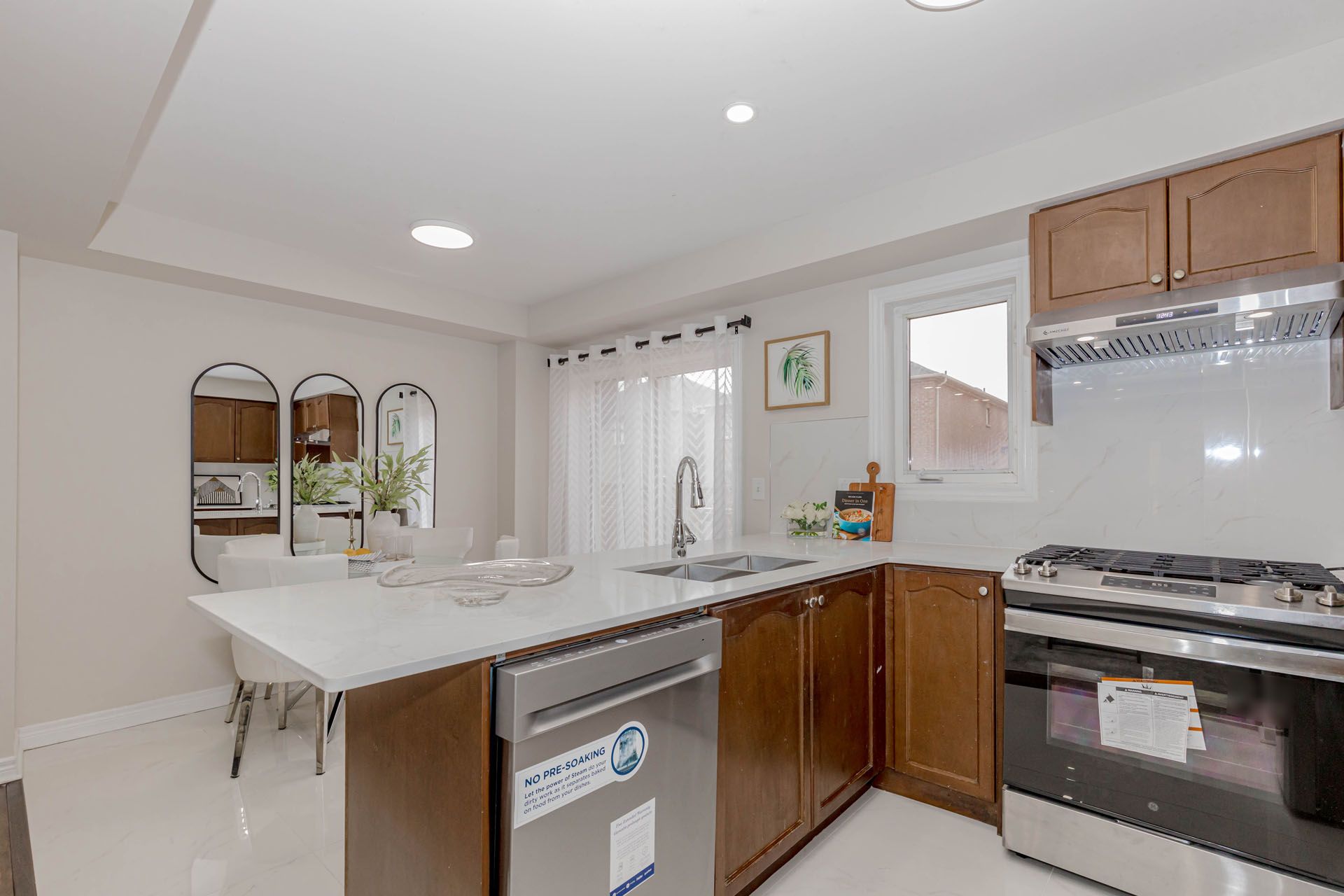 Welcome to this beautifully maintained and upgraded home located in a highly desirable neighborhood of brampton! This bright and spacious 3+1 bedroom, 4 bathroom property features a fully finished legal in-law suite basement, perfect for extended family or additional living space. The home welcomes you with a grand double door entry into a foyer finished with ceramic tiles, leading into a modern open-concept main floor adorned with elegant pot lights and freshly painted throughout. The upgraded kitchen and breakfast area also feature ceramic tile flooring and are equipped with quartz countertops, stylish backsplash, and brand-new gas stove and dishwasher. The remainder of the main floor, along with the upper and basement levels, showcases seamless laminate flooring for a clean and contemporary feel. Step outside to a well-designed backyard featuring a combination of concrete and deck space, ideal for relaxing or entertaining. Convenient access to the backyard directly from the garage adds extra functionality. Includes 3 parking spaces. All measurements are approximate. Situated in a prime location close to schools, parks, public transit, shopping, and major highways, this home offers both comfort and convenience. A fantastic opportunity for tenants seeking a move-in ready home in a family-friendly community!