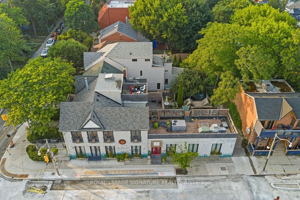 A rare and remarkable opportunity to own a meticulously maintained commercial building in one of toronto's most sought-after neighbourhoods. With 100 feet of prime street frontage along harbord street, this striking corner property commands attention with its exceptional curb appeal and versatile layout. Currently operating as a retail and wellness space, the building is easily adaptable for a variety of uses including a seamless conversion back to its former life as a high-end restaurant. Spanning two light-filled levels plus a finished basement, the space showcases a beautiful blend of architectural character and thoughtful upgrades. The main floor features soaring ceilings, marble accent walls, and wall-to-wall glass doors that flood the interior with natural light. Upstairs, cathedral ceilings, 14-foot french doors with juliet balconies, and a generous rooftop terrace with cn tower views create an inspiring setting for private events, dining, ceremonies, and more. Extensive recent updates include a custom steel front door (2024), outdoor cement work and dormer window replacements (2025), a new hot water tank (2023/24), upgraded roofing and hvac, heated floors, built-in cabinets, a caesar stone reception desk, and a renovated electrical room. Additional highlights include three bathrooms (with rough-ins for three more), built-in industrial fridges, a landscaped side garden, and 16 internal and external security cameras. With stunning built-in planters full of perennial grasses and flowers wrapping the front and side of the building, this property offers unmatched curb appeal and a rare opportunity to own a space that is truly one-of-a-kind. A perfect fit for end users, investors, or visionary entrepreneurs ready to bring their dream business to life.