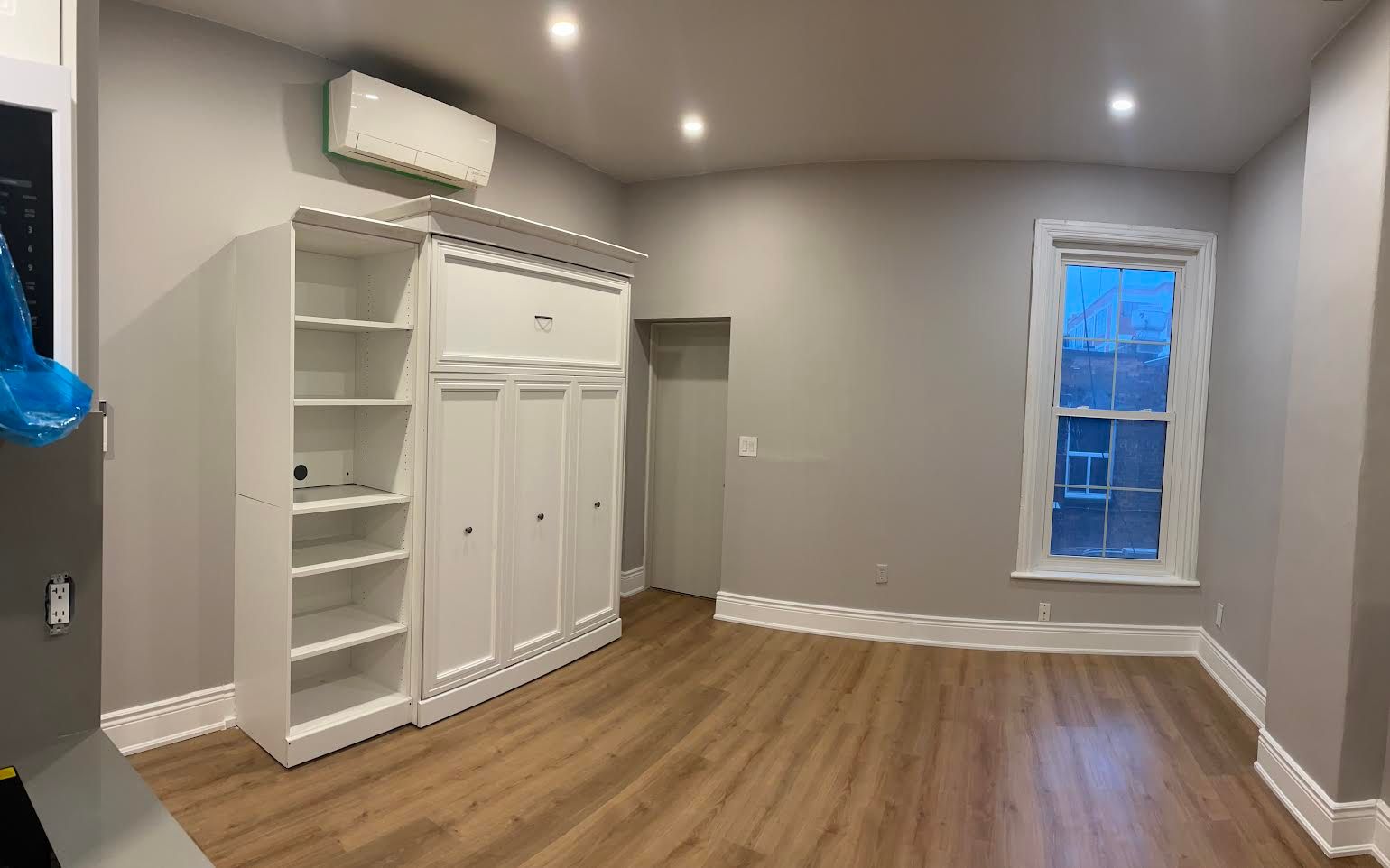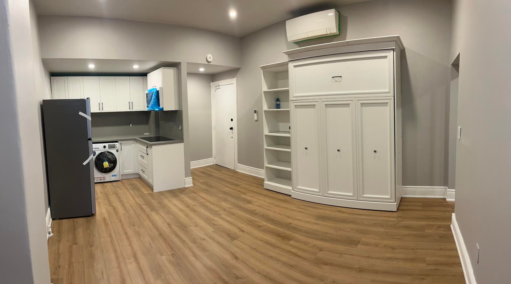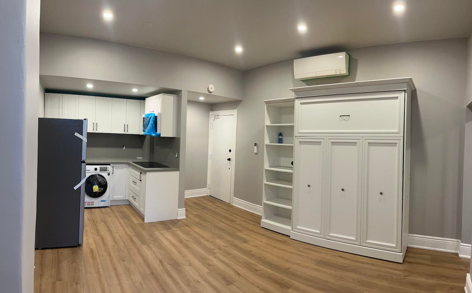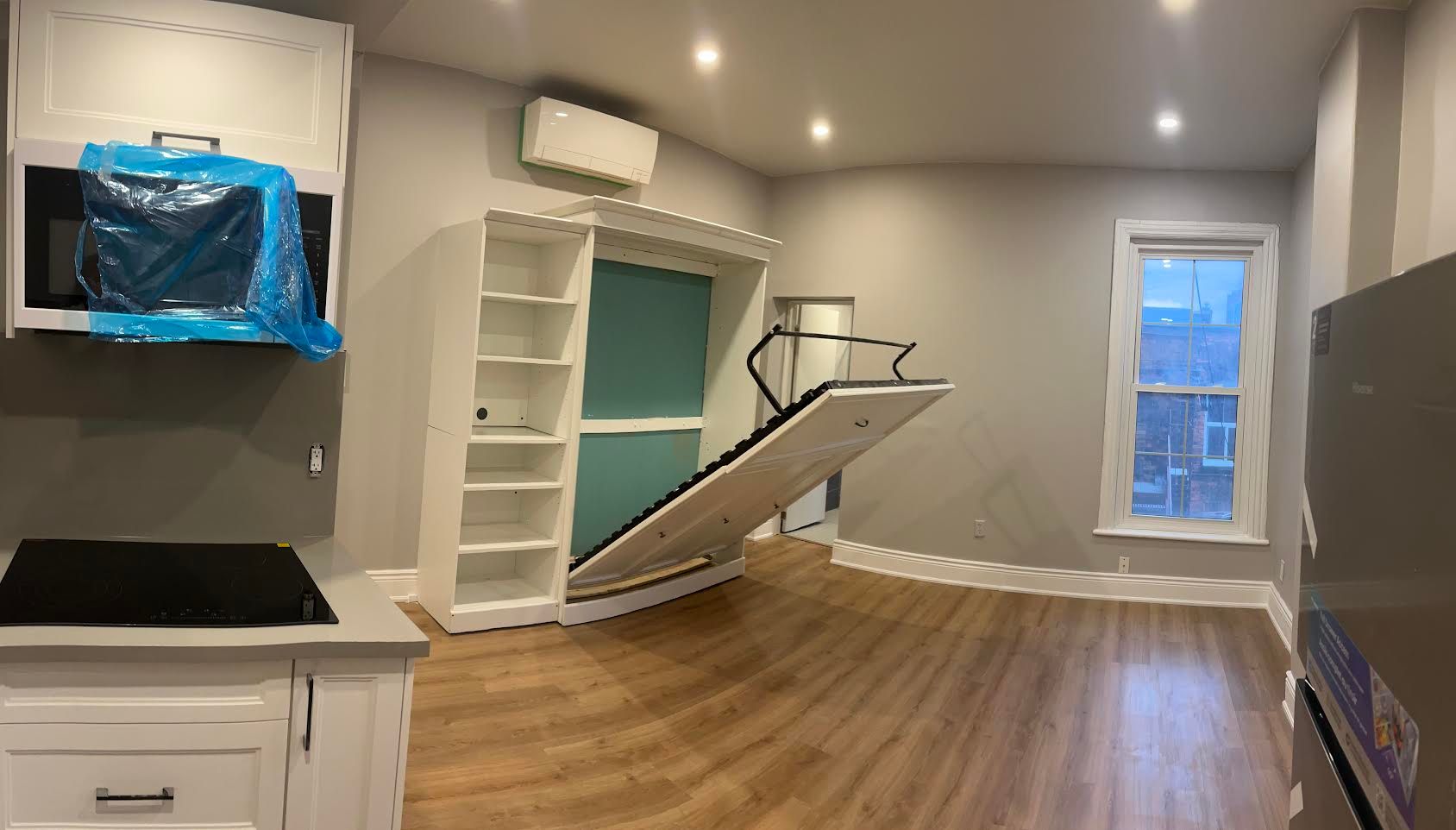 • Open-concept layout with a spacious living room and Murphy bed.