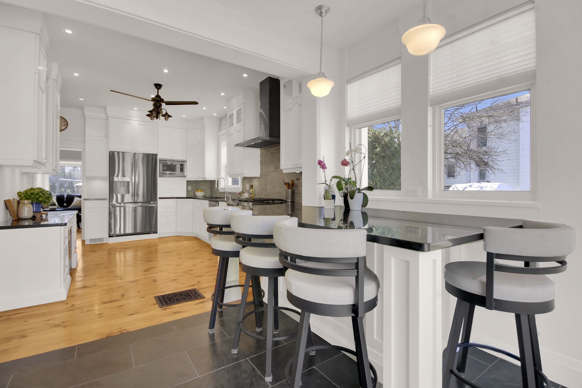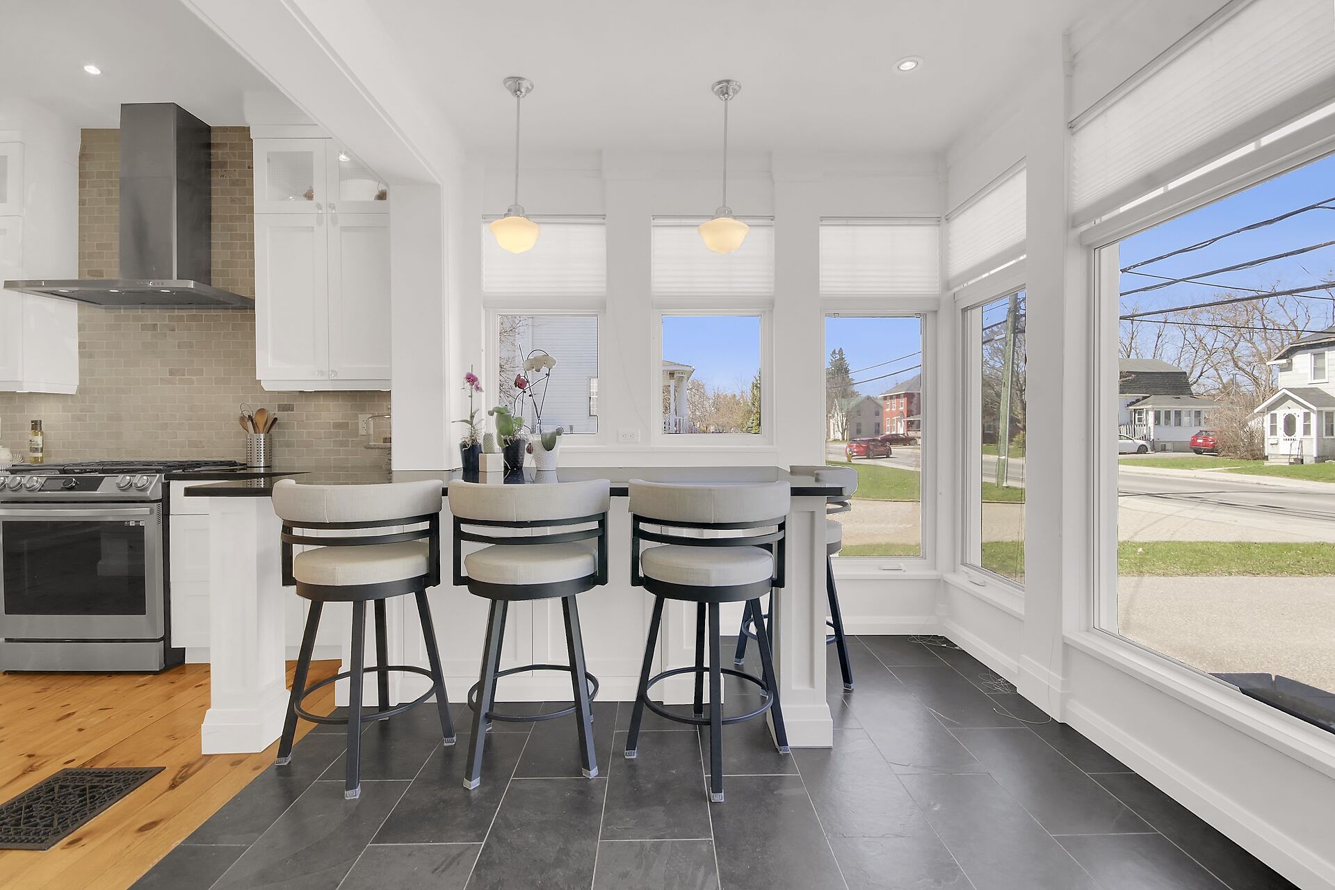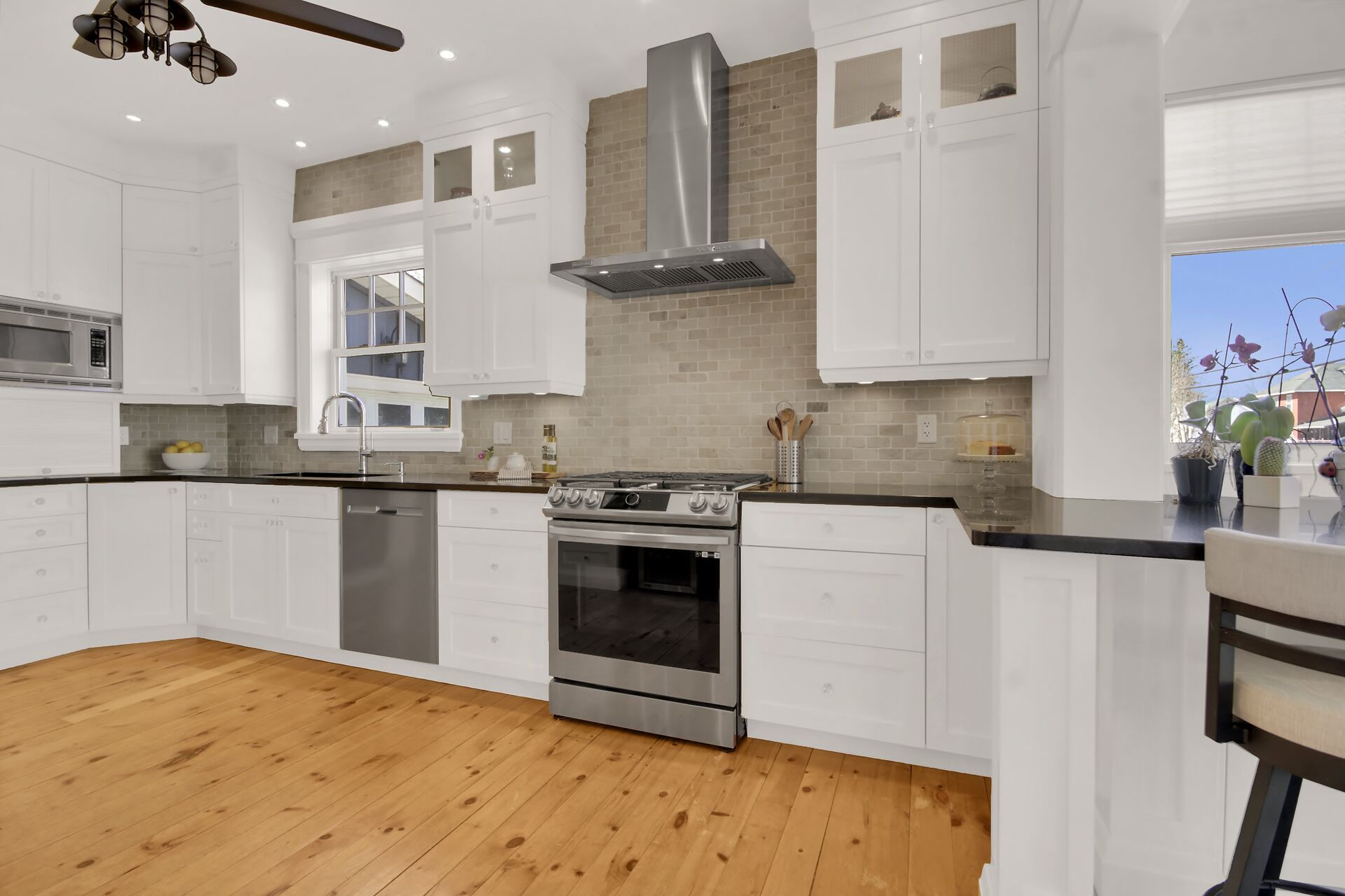 • Chef-style kitchen with quartz countertops and entertaining space.