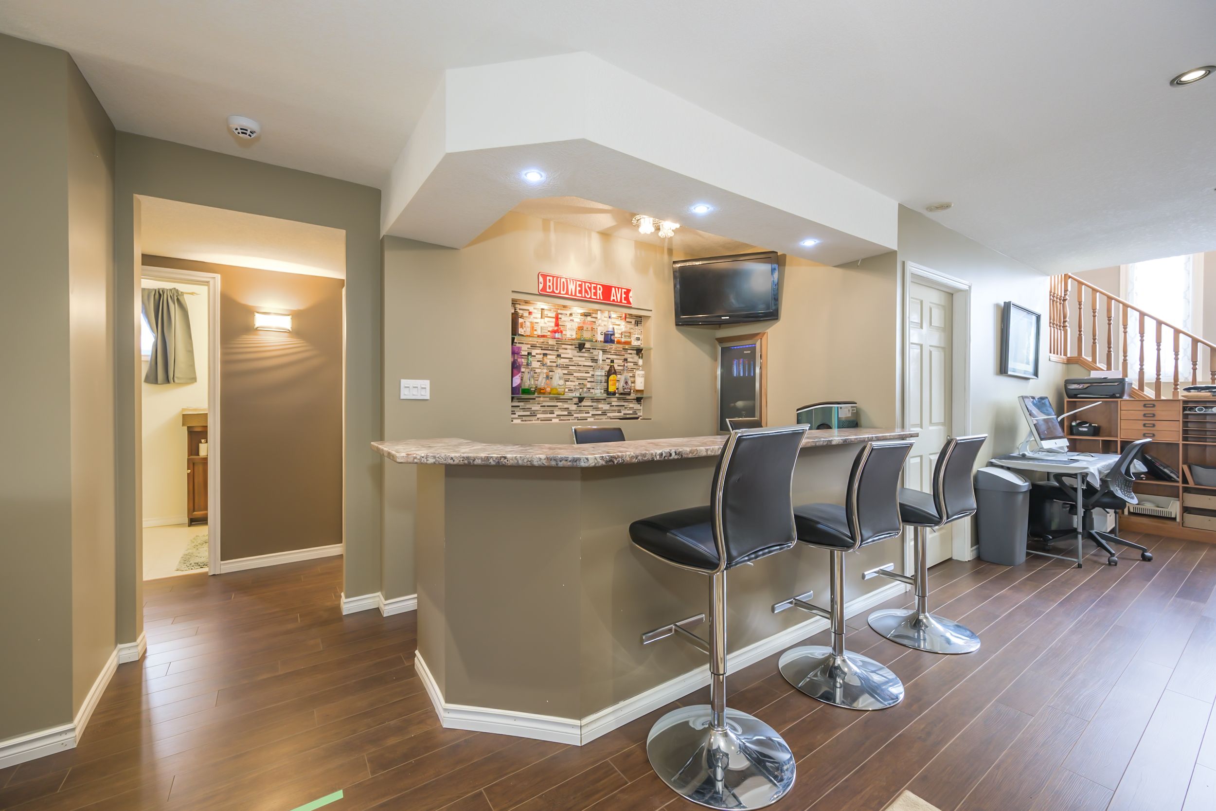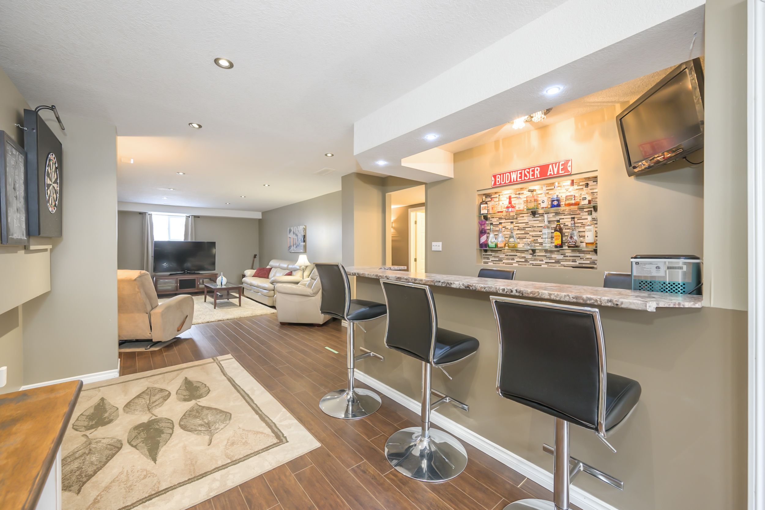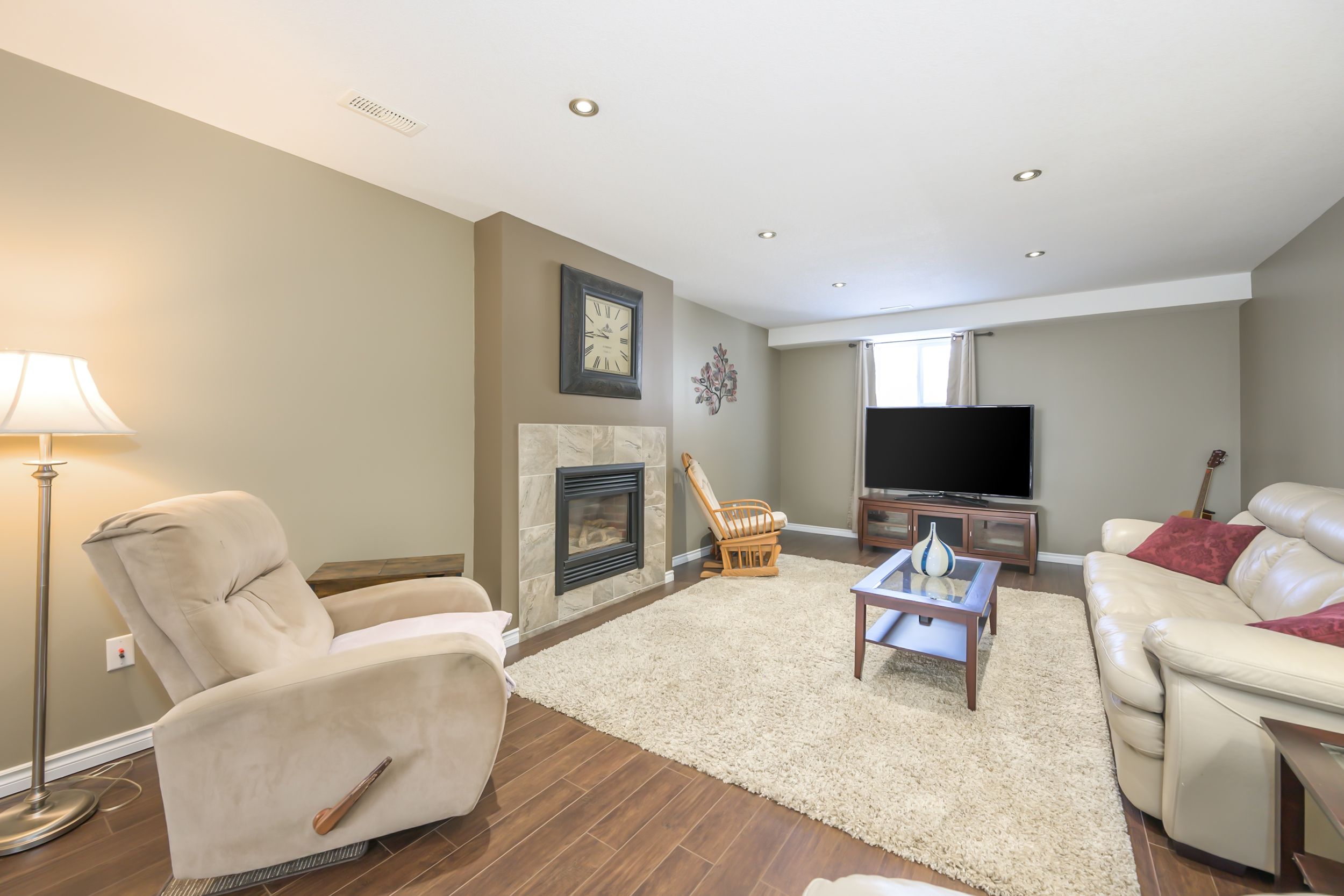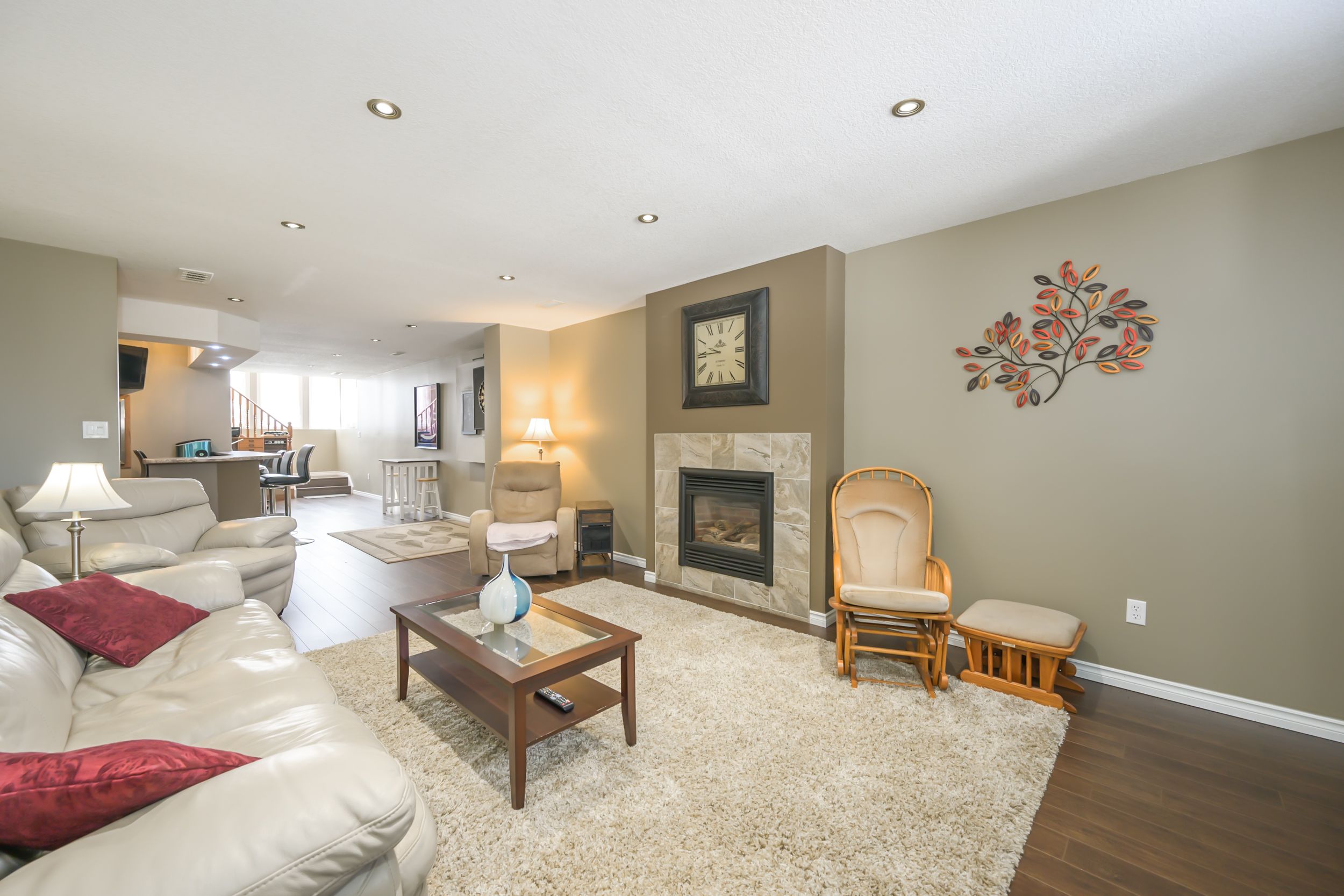 • Lower level great room with gas fireplace and built-in bar.