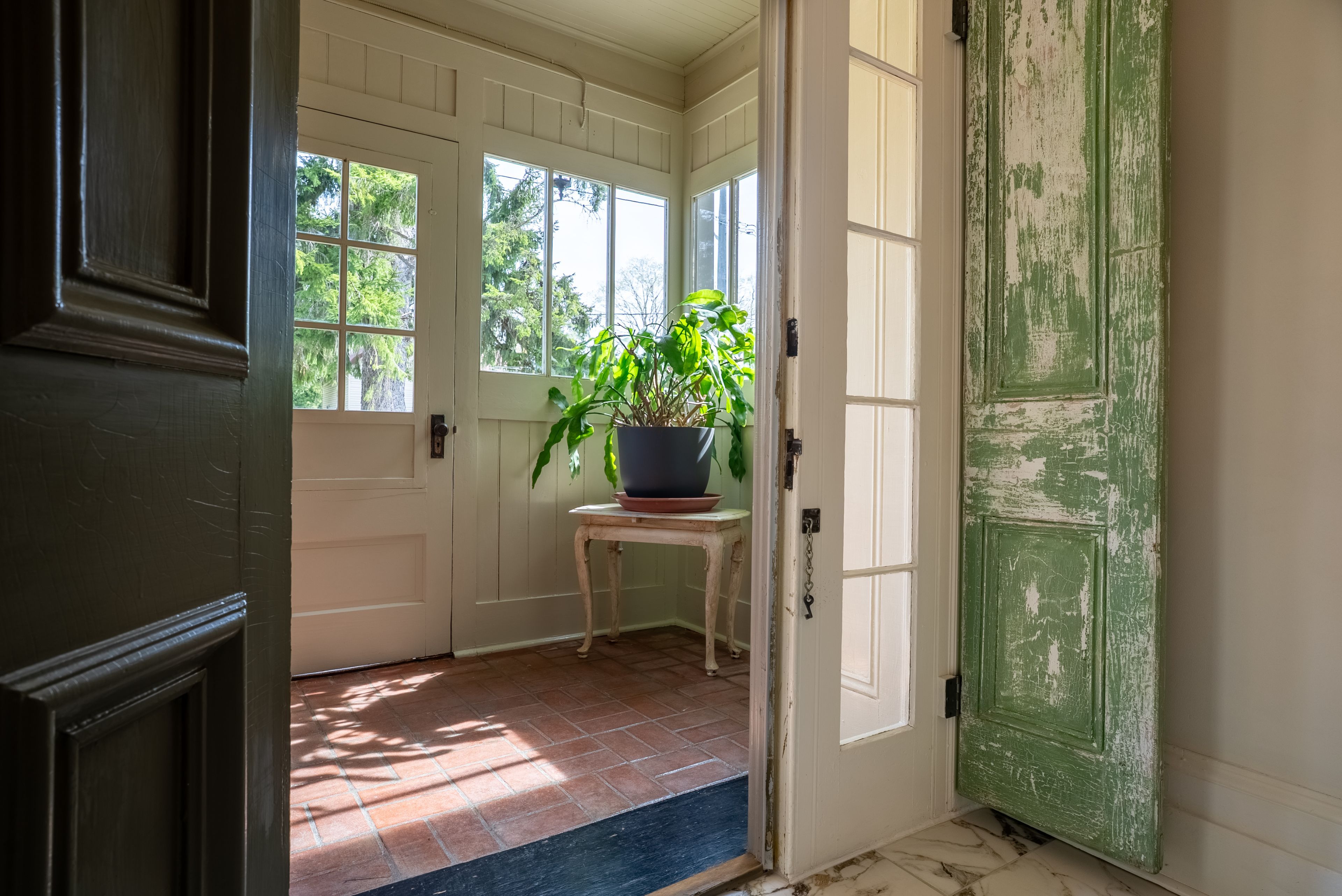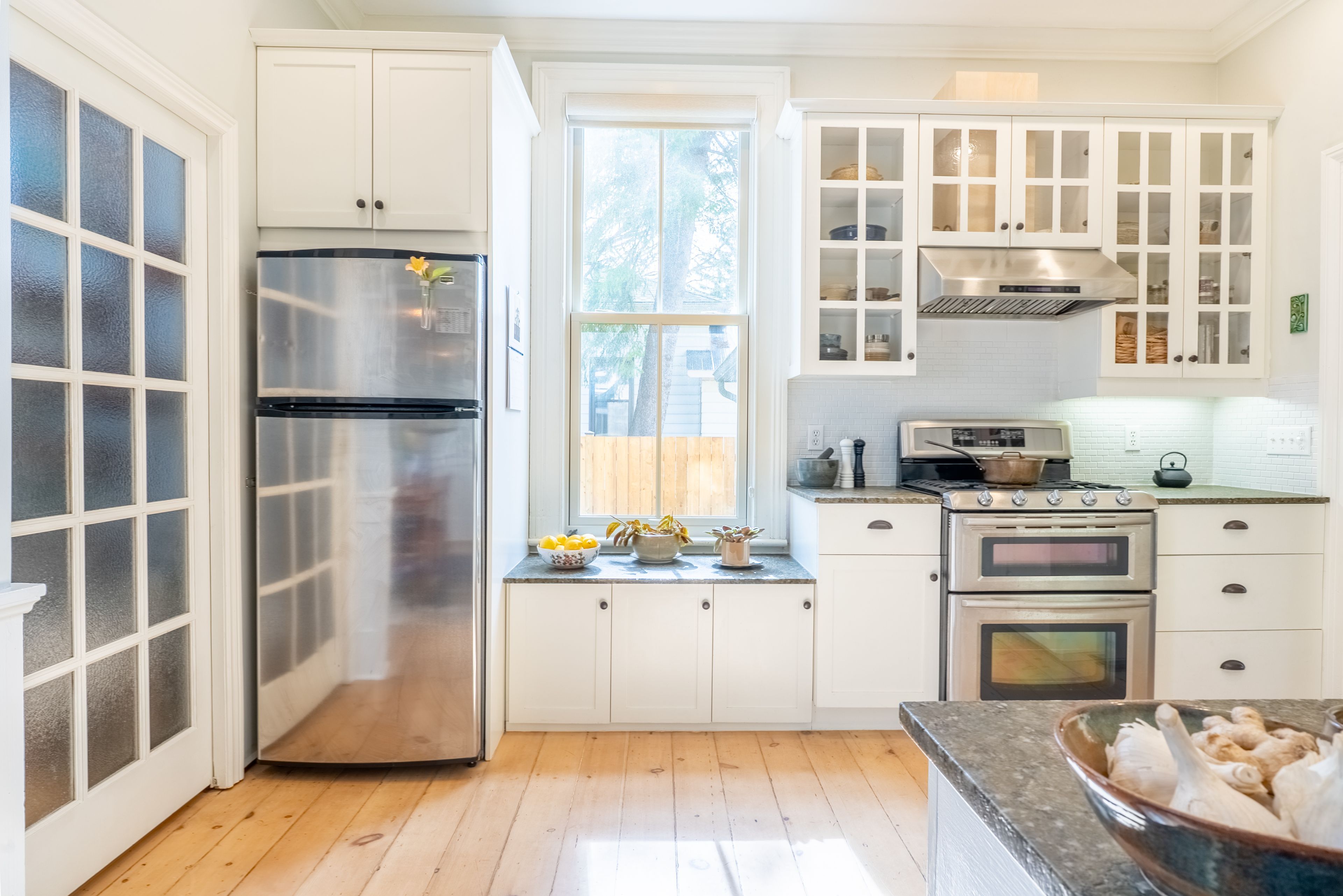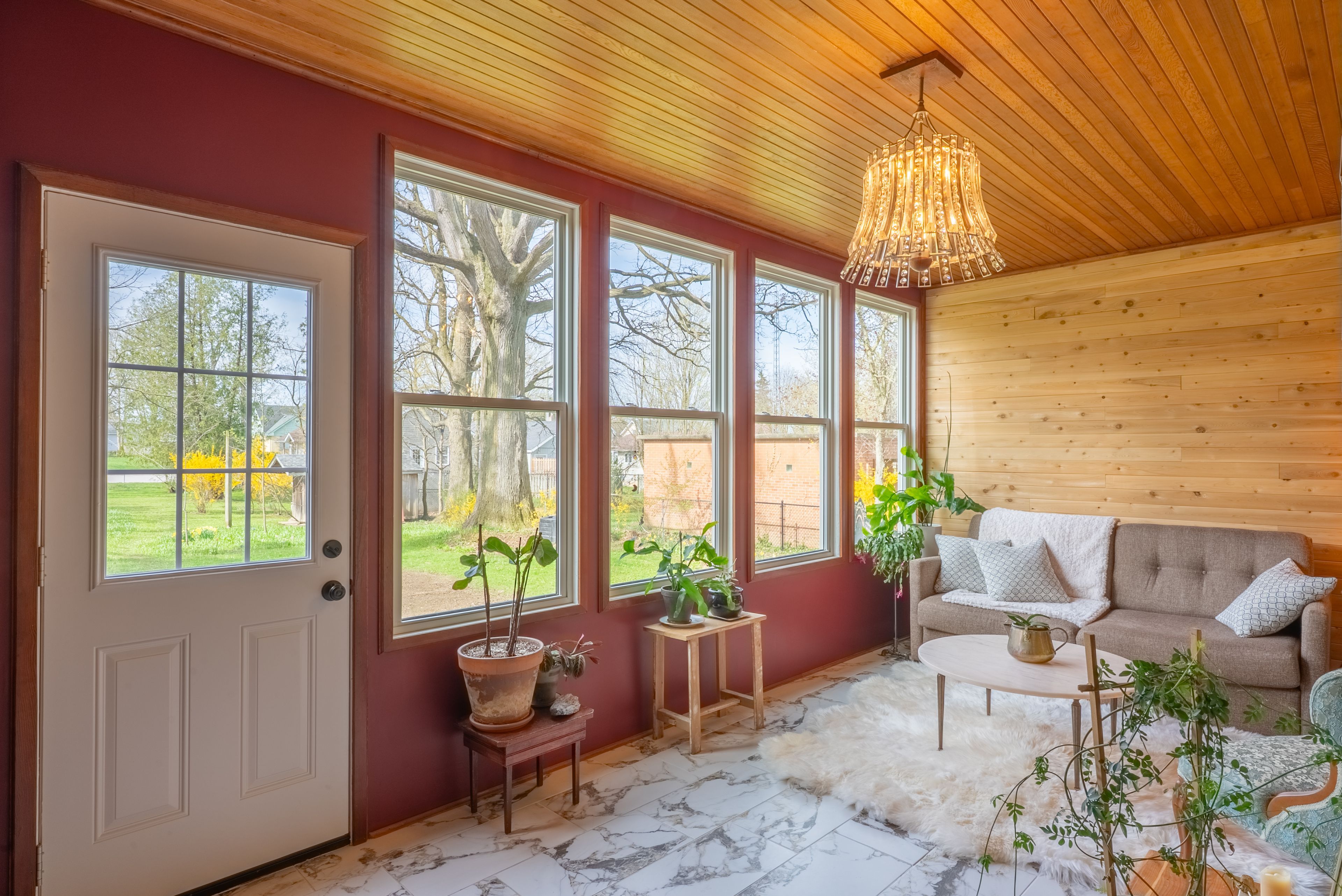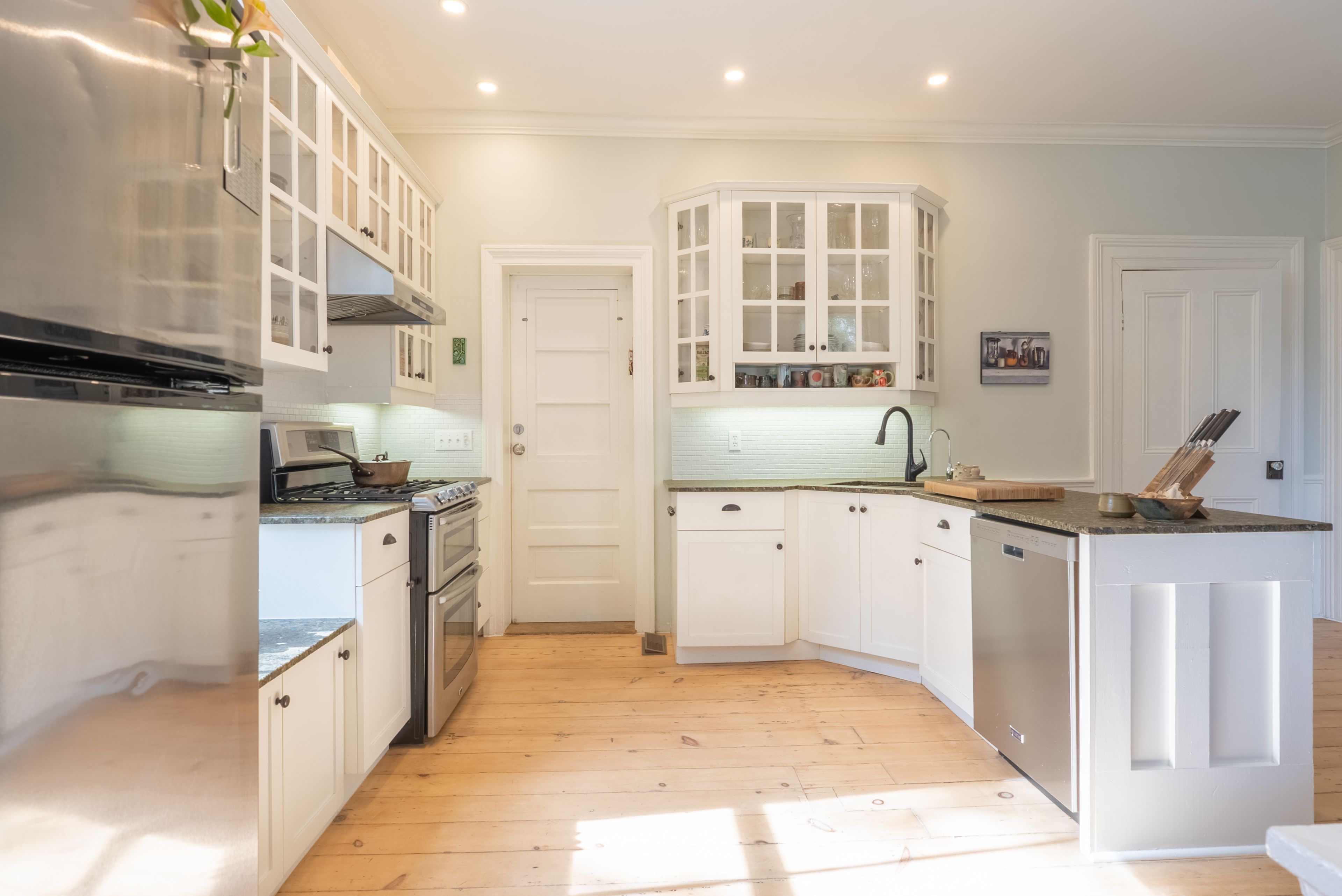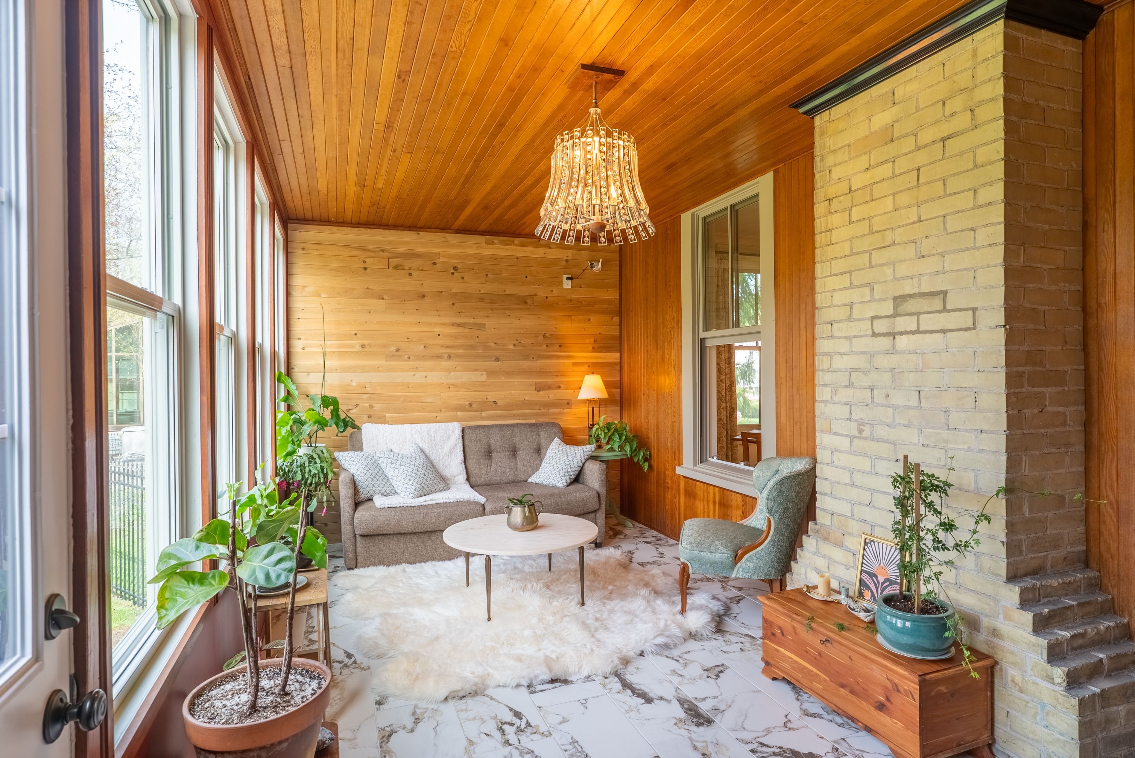 • Updated sunroom and spacious kitchen with modern appliances and quartz countertops.