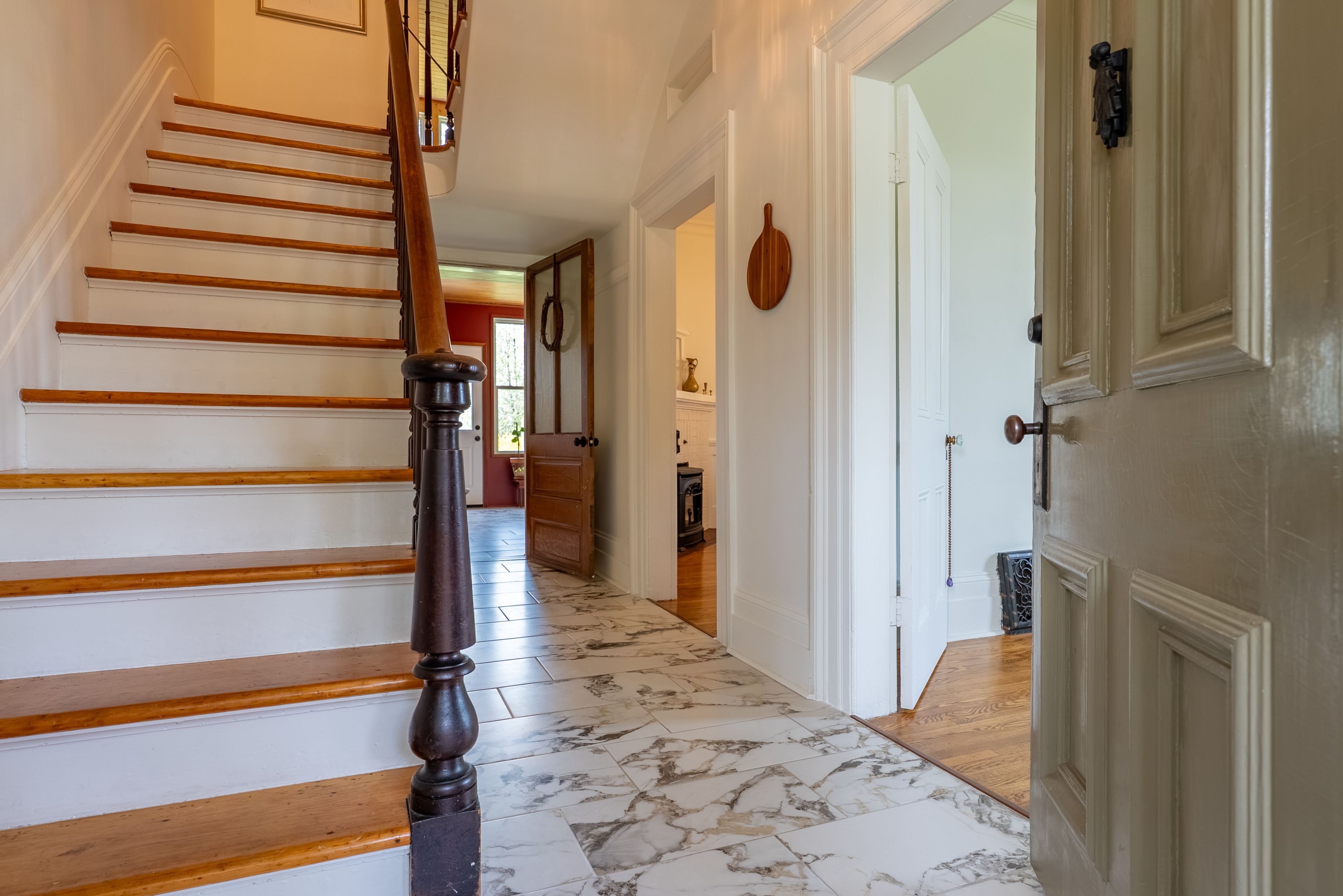 • Striking original curving walnut staircase and high ceilings throughout.