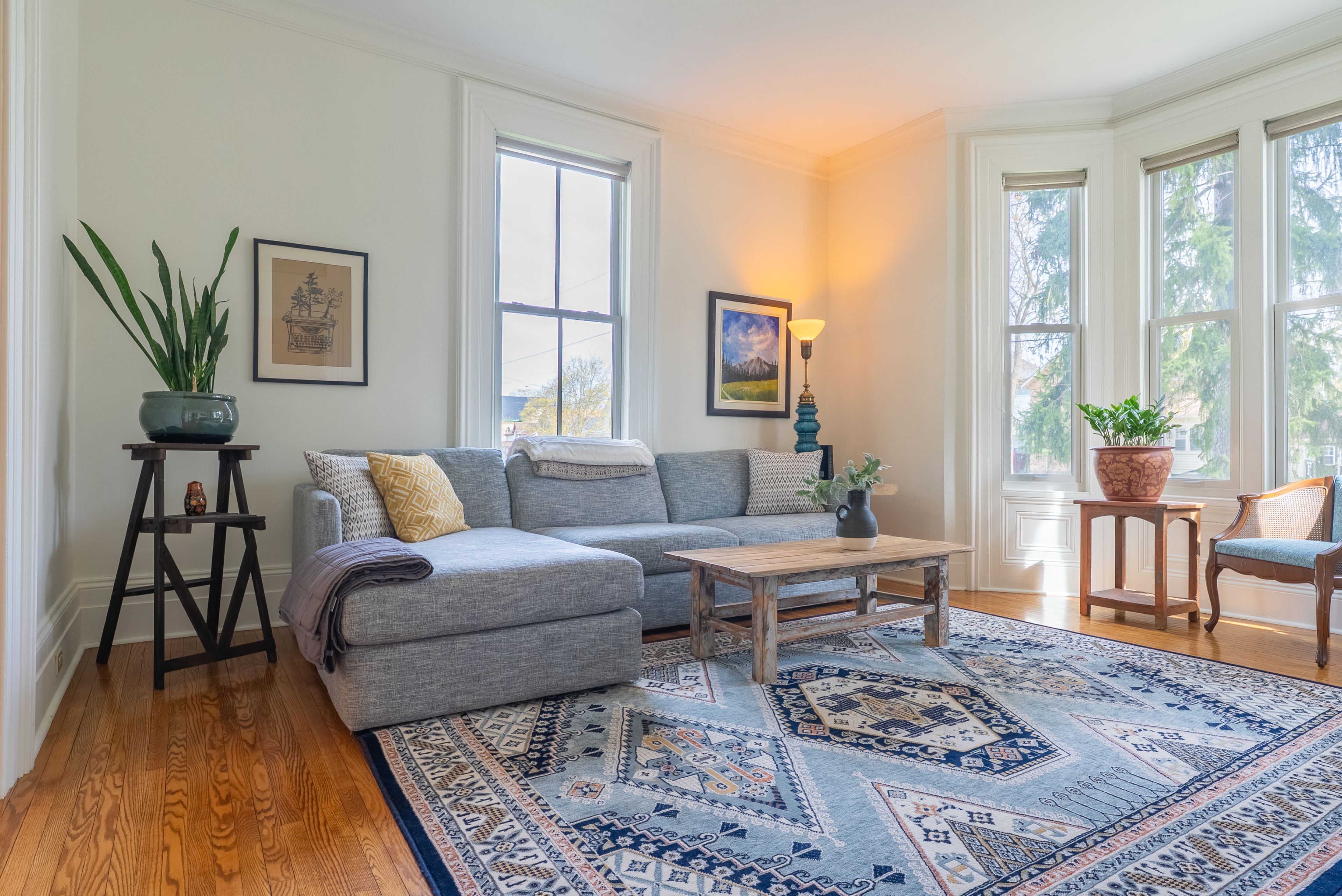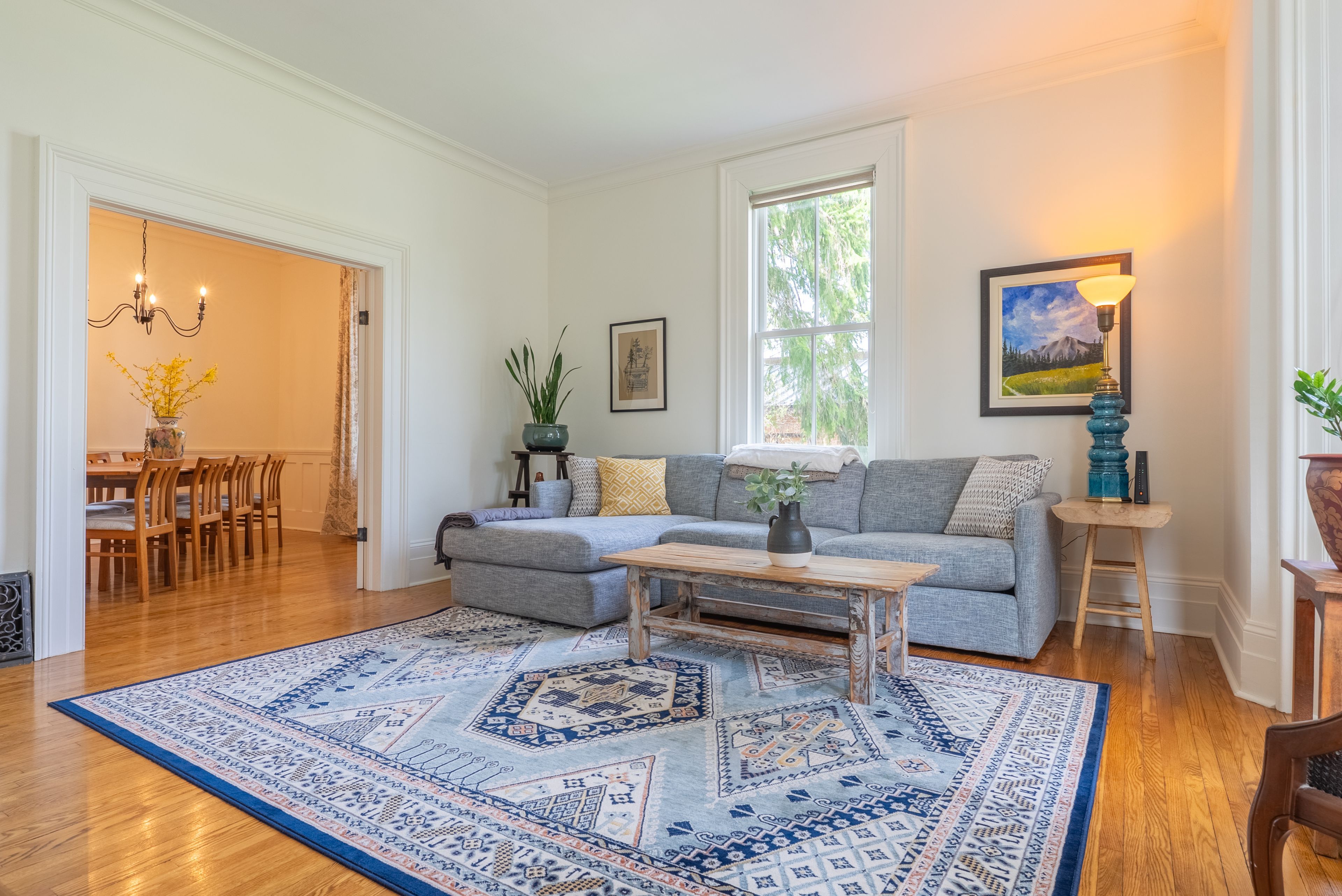 • Private backyard with gardens, landscaping, and a special oak tree.