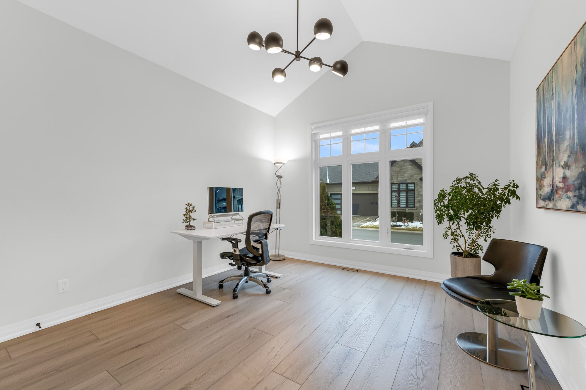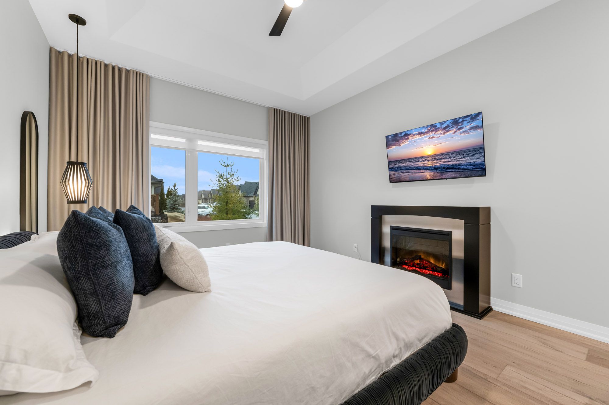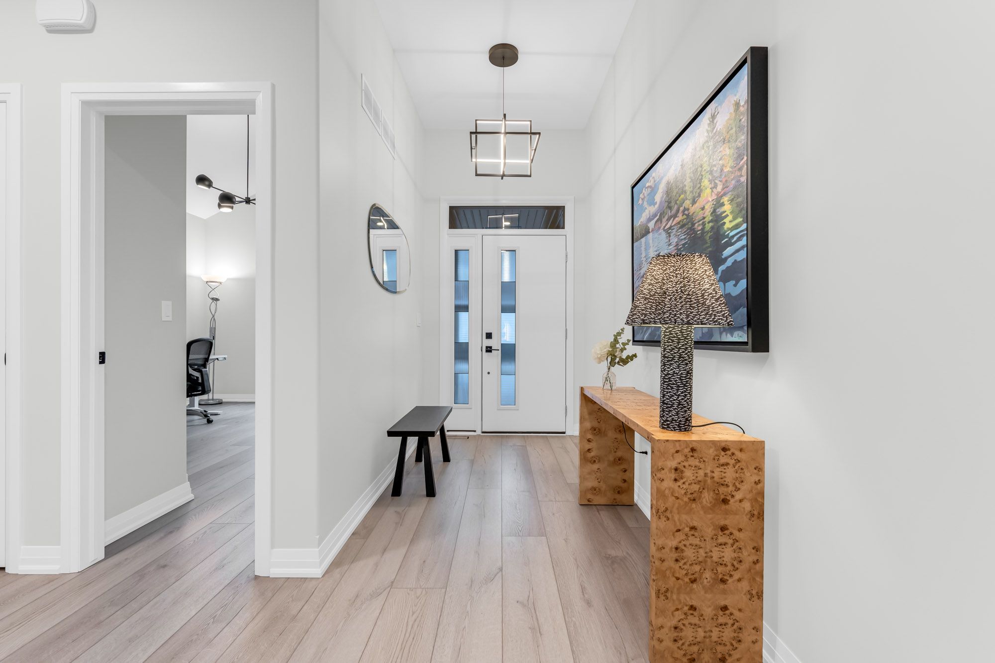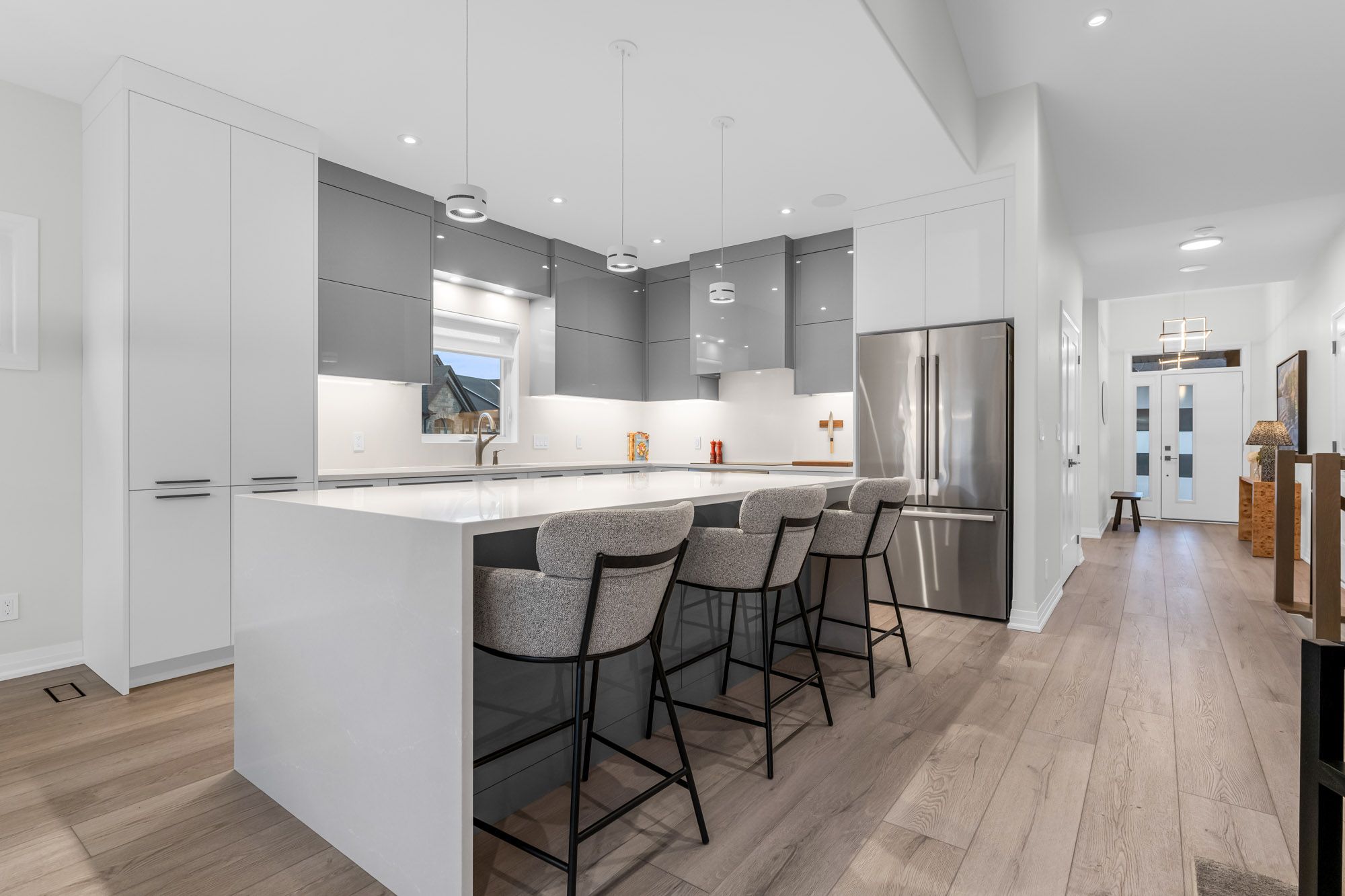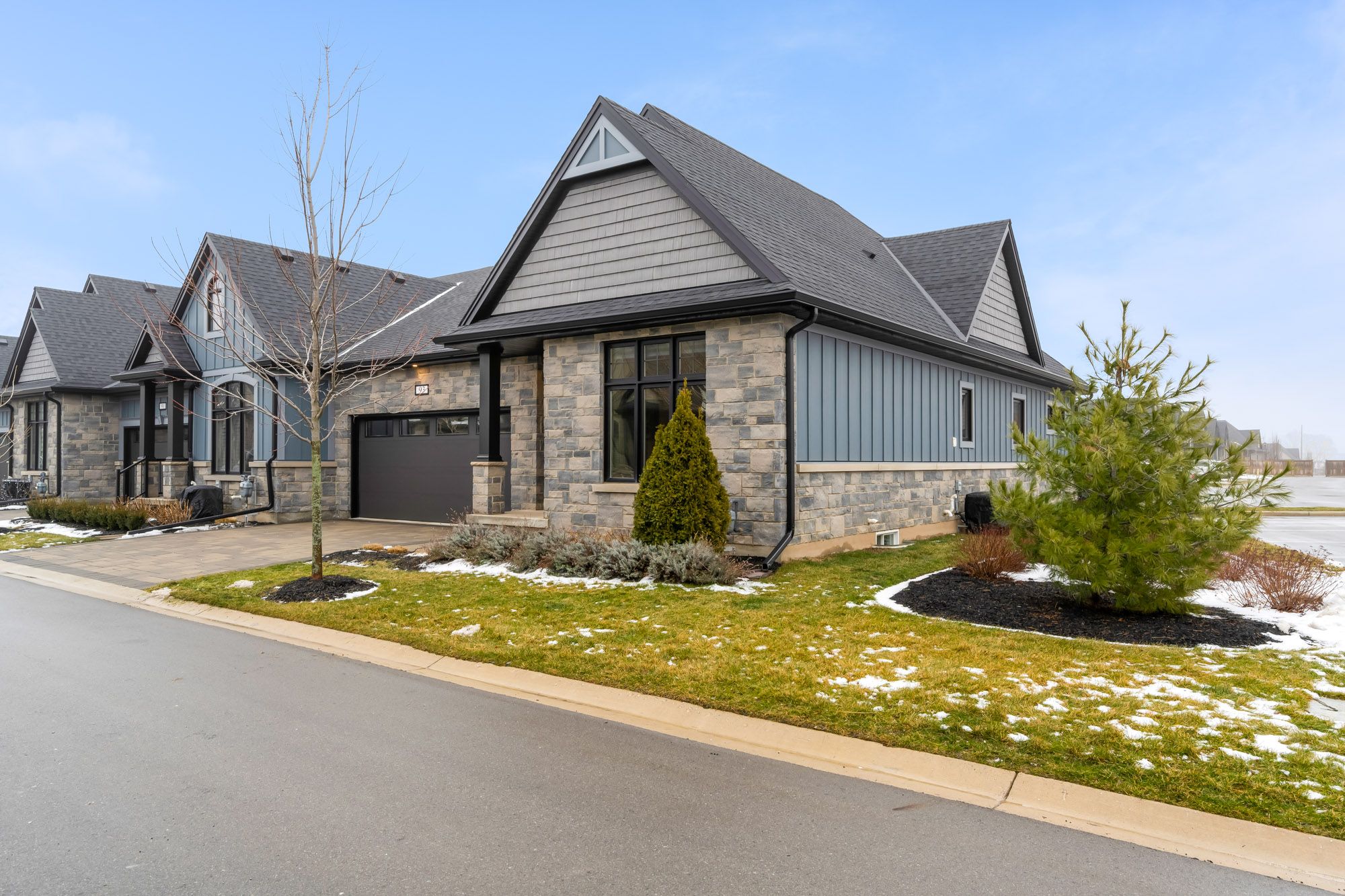 Nestled in the heart of lavender fields, a grey forest community, this rare end-unit bungalow is the largest model in the neighbourhood, offering 1,508 sq ft on the main level plus approximately 850 sq ft of builder-finished lower-level living area. From the moment you enter, the sense of space is unmistakable. Ten-foot ceilings enhance the entry and both bedrooms, while the living room showcases a dramatic 12-ft ceiling. More than $200,000 in carefully curated upgrades elevate this home well beyond builder standards. The custom kitchen is a true showpiece, featuring premium cabinetry and hardware, silestone quartz countertops/backsplash, smart storage solution including a pantry/spice drawer, and impressive 9-ft waterfall island with storage on both sides. High-end appliances include bosch induction cooktop, wall oven and fridge and a fisher and paykel integrated double-drawer dishwasher. The serene primary retreat offers a walk-in closet, designer pendant lighting, floor to-ceiling custom drapery, and a four-piece ensuite with double vanity and glass-enclosed shower. The lower level includes open spindle staircase, spacious recreation room, third bedroom, three-piece upgraded bath, and generous storage area. Outdoor living is equally impressive with a private oversized composite deck and interlocking stone patio surrounded by greenery. The upgraded garage features an epoxy floor by garage kings, ev-charger outlet and insulated attic. Additional upgrades include smooth ceilings, upgraded trim and rounded drywall, integrated in-ceiling speaker system, designer lighting, premium plumbing fixtures, flow-through humidifier, whole-home water purification, extra-wide plank flooring, 3m privacy window tint, and much more. Low maintenance fee covers water, professional management, landscaping, and snow removal, delivering true turnkey living in one of fonthill's most prestigious, architecturally controlled communities. Video & virtual tour available.