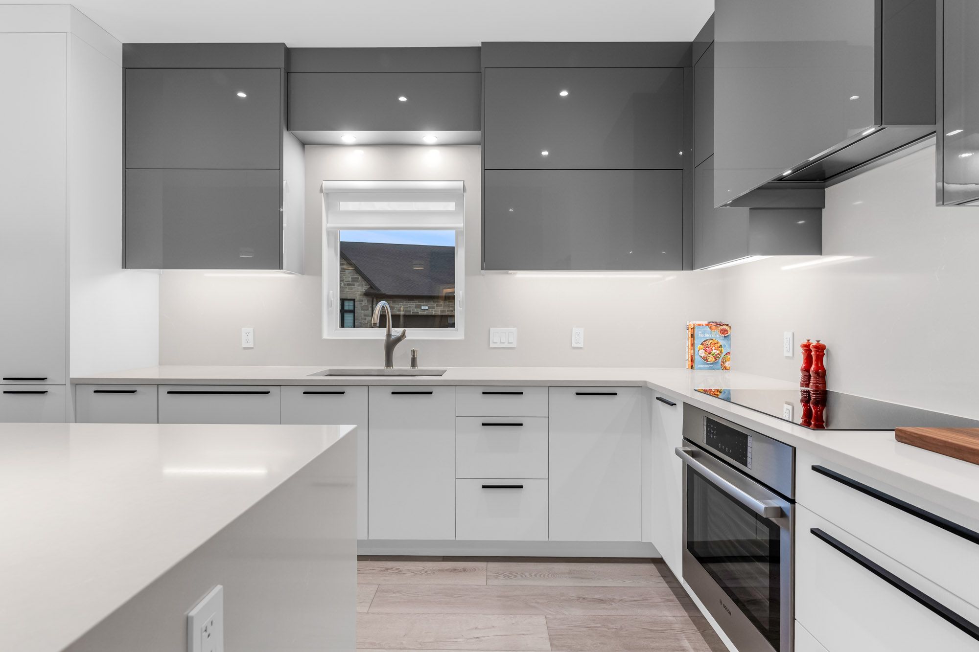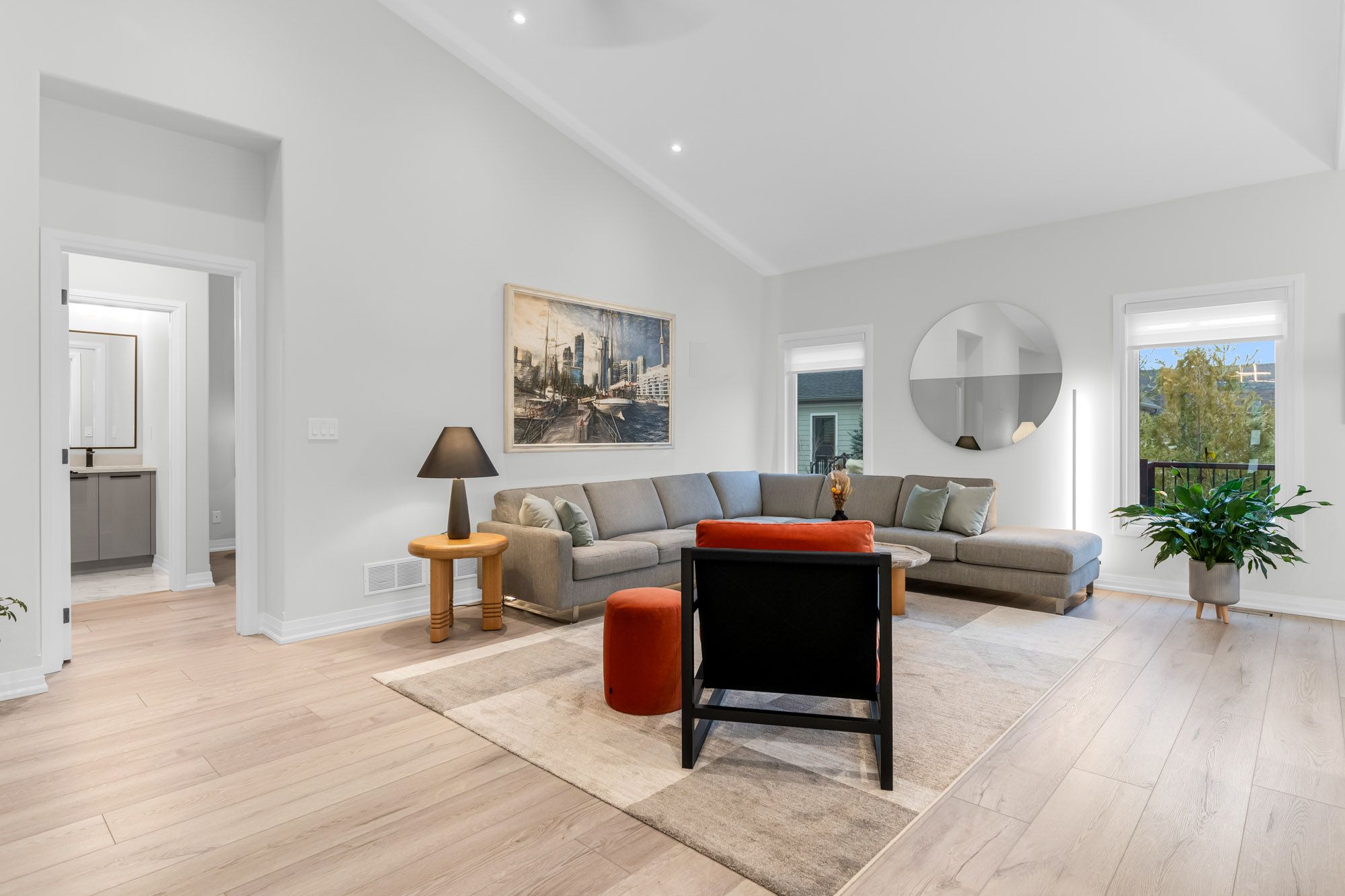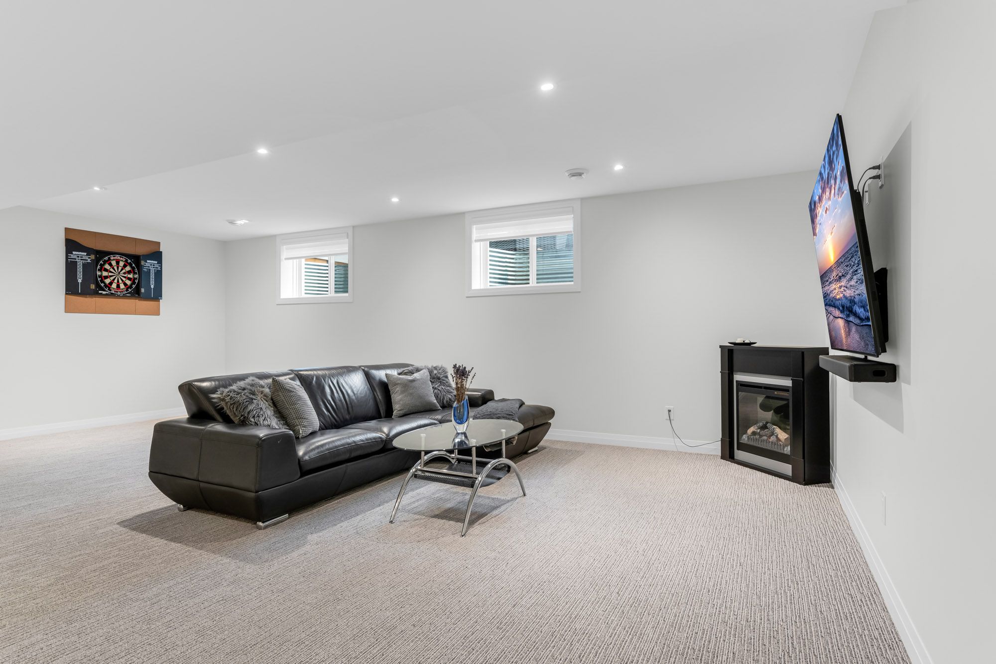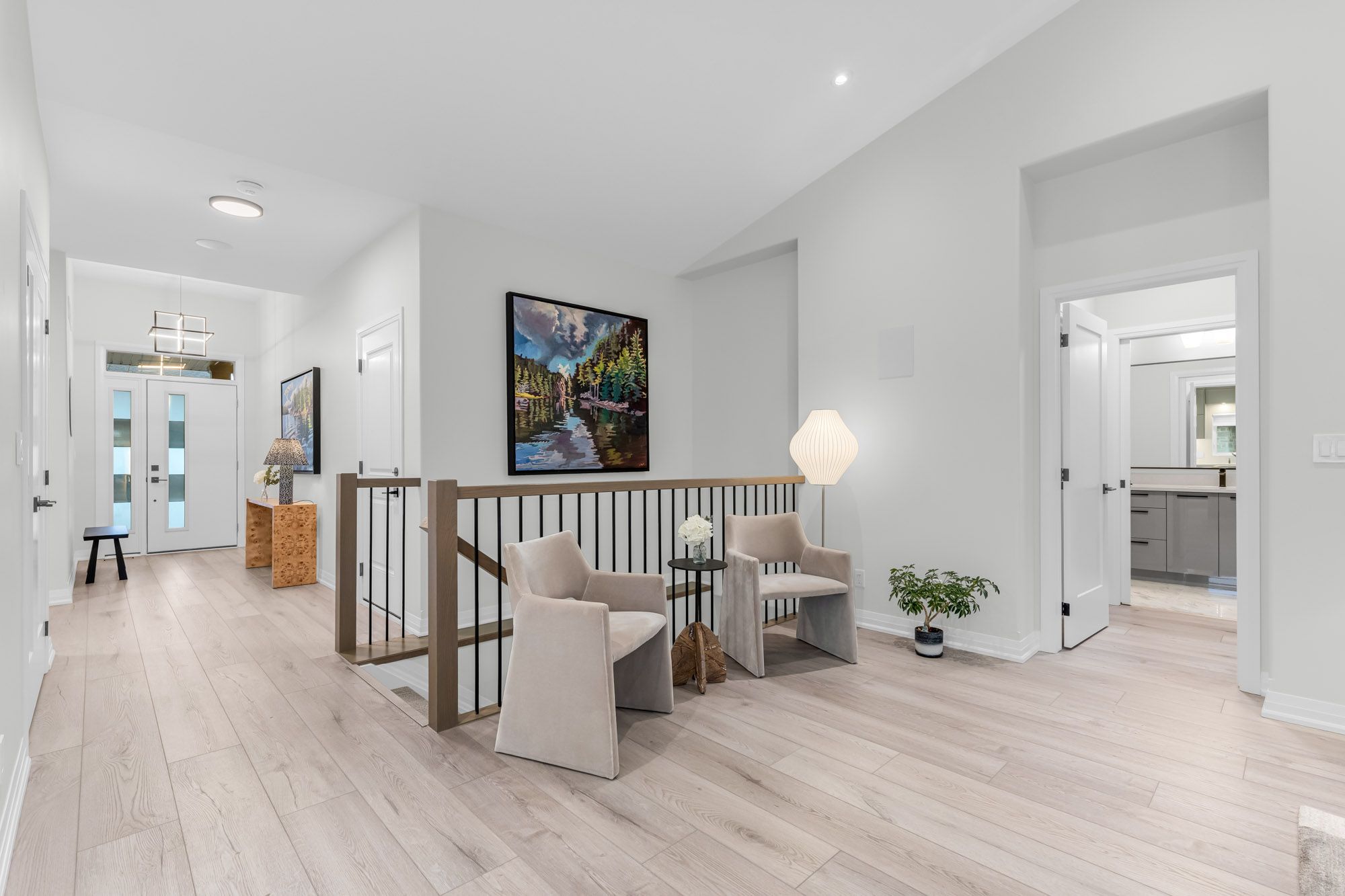 Nestled in the heart of lavender fields, a grey forest community, this rare end-unit bungalow is the largest model in the neighbourhood, offering 1,508 sq ft on the main level plus approximately 850 sq ft of builder-finished lower-level living area. From the moment you enter, the sense of space is unmistakable. Ten-foot ceilings enhance the entry and both bedrooms, while the living room showcases a dramatic 12-ft ceiling. More than $200,000 in carefully curated upgrades elevate this home well beyond builder standards. The custom kitchen is a true showpiece, featuring premium cabinetry and hardware, silestone quartz countertops/backsplash, smart storage solution including a pantry/spice drawer, and impressive 9-ft waterfall island with storage on both sides. High-end appliances include bosch induction cooktop, wall oven and fridge and a fisher and paykel integrated double-drawer dishwasher. The serene primary retreat offers a walk-in closet, designer pendant lighting, floor to-ceiling custom drapery, and a four-piece ensuite with double vanity and glass-enclosed shower. The lower level includes open spindle staircase, spacious recreation room, third bedroom, three-piece upgraded bath, and generous storage area. Outdoor living is equally impressive with a private oversized composite deck and interlocking stone patio surrounded by greenery. The upgraded garage features an epoxy floor by garage kings, ev-charger outlet and insulated attic. Additional upgrades include smooth ceilings, upgraded trim and rounded drywall, integrated in-ceiling speaker system, designer lighting, premium plumbing fixtures, flow-through humidifier, whole-home water purification, extra-wide plank flooring, 3m privacy window tint, and much more. Low maintenance fee covers water, professional management, landscaping, and snow removal, delivering true turnkey living in one of fonthill's most prestigious, architecturally controlled communities. Video & virtual tour available.