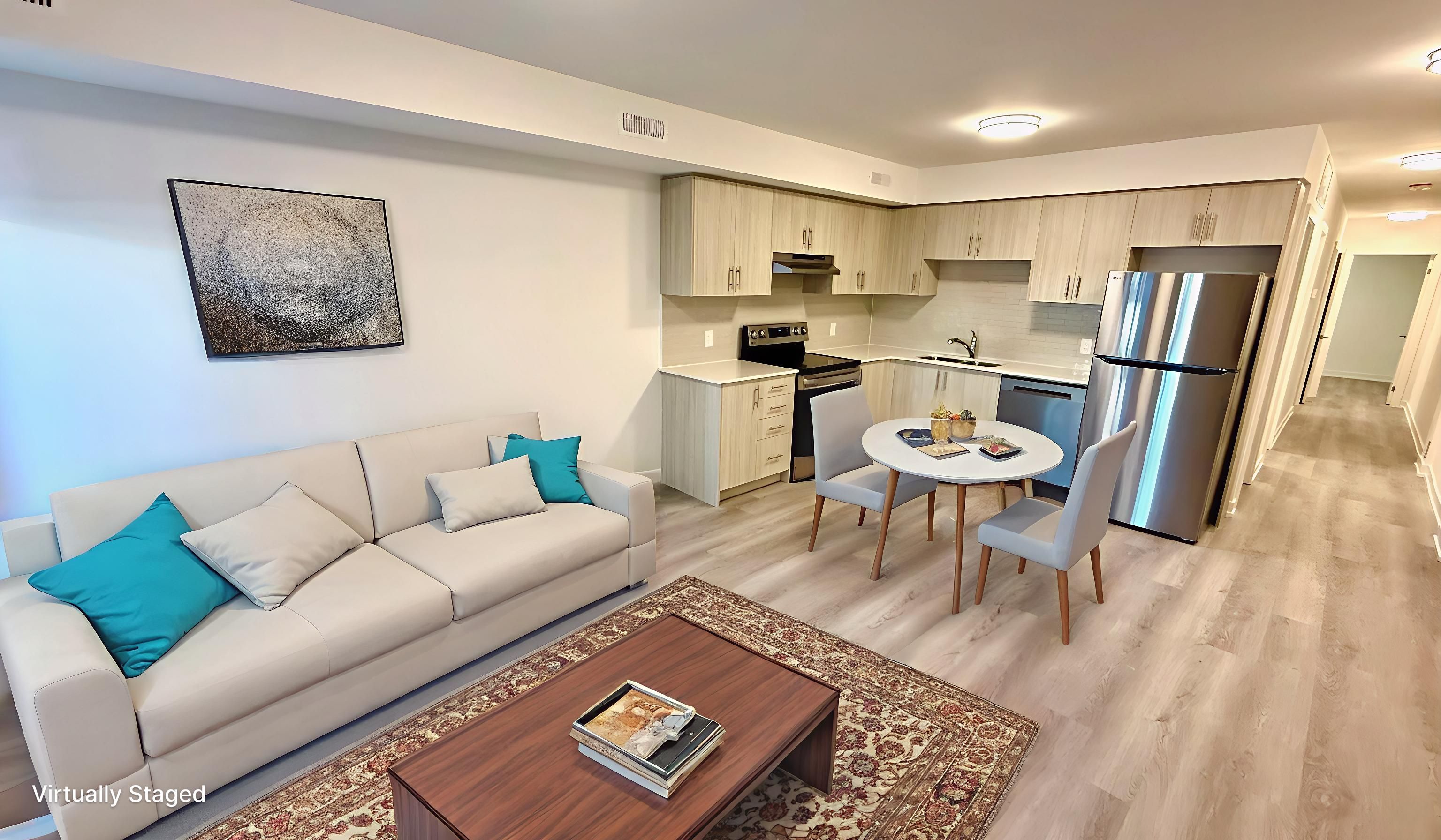 • Bright open-concept living space with modern design and stainless steel appliances.