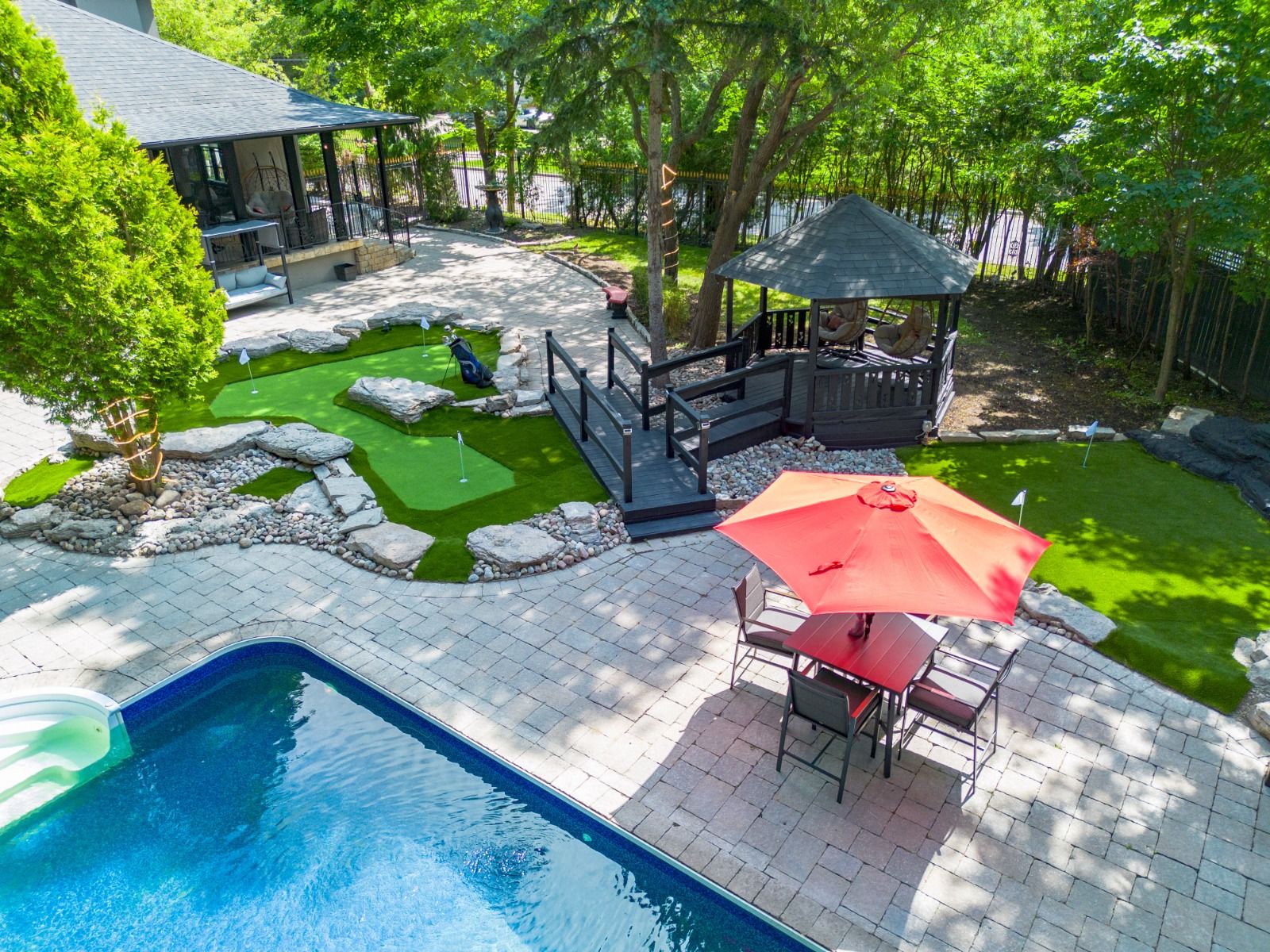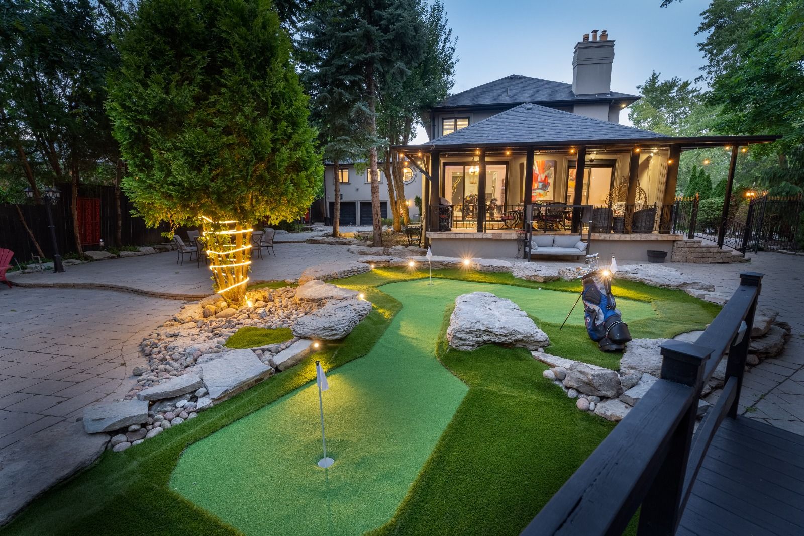 • Resort-like backyard featuring in-ground pool, fountains, and mini-golf course.