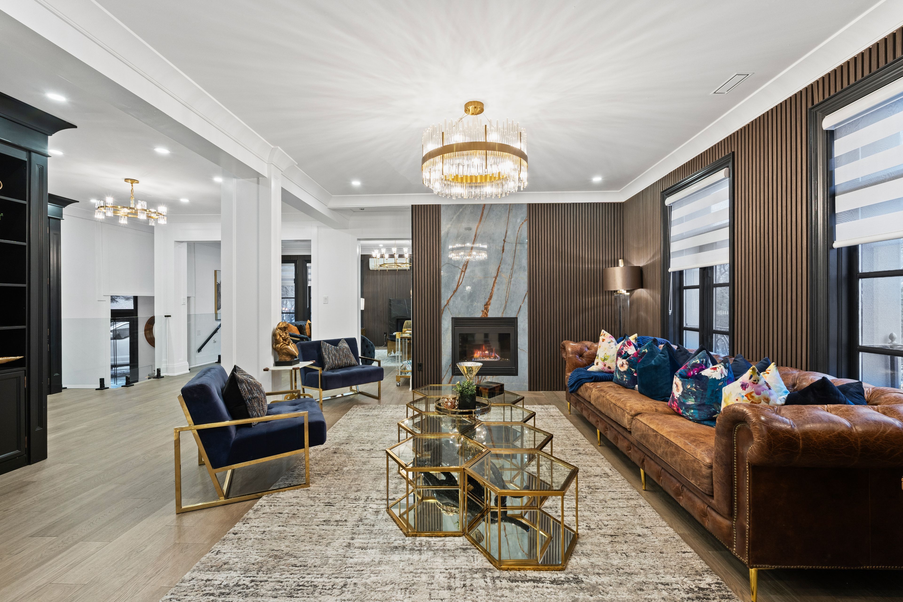 • Chef's kitchen equipped with large island, modern appliances, and stone counters.