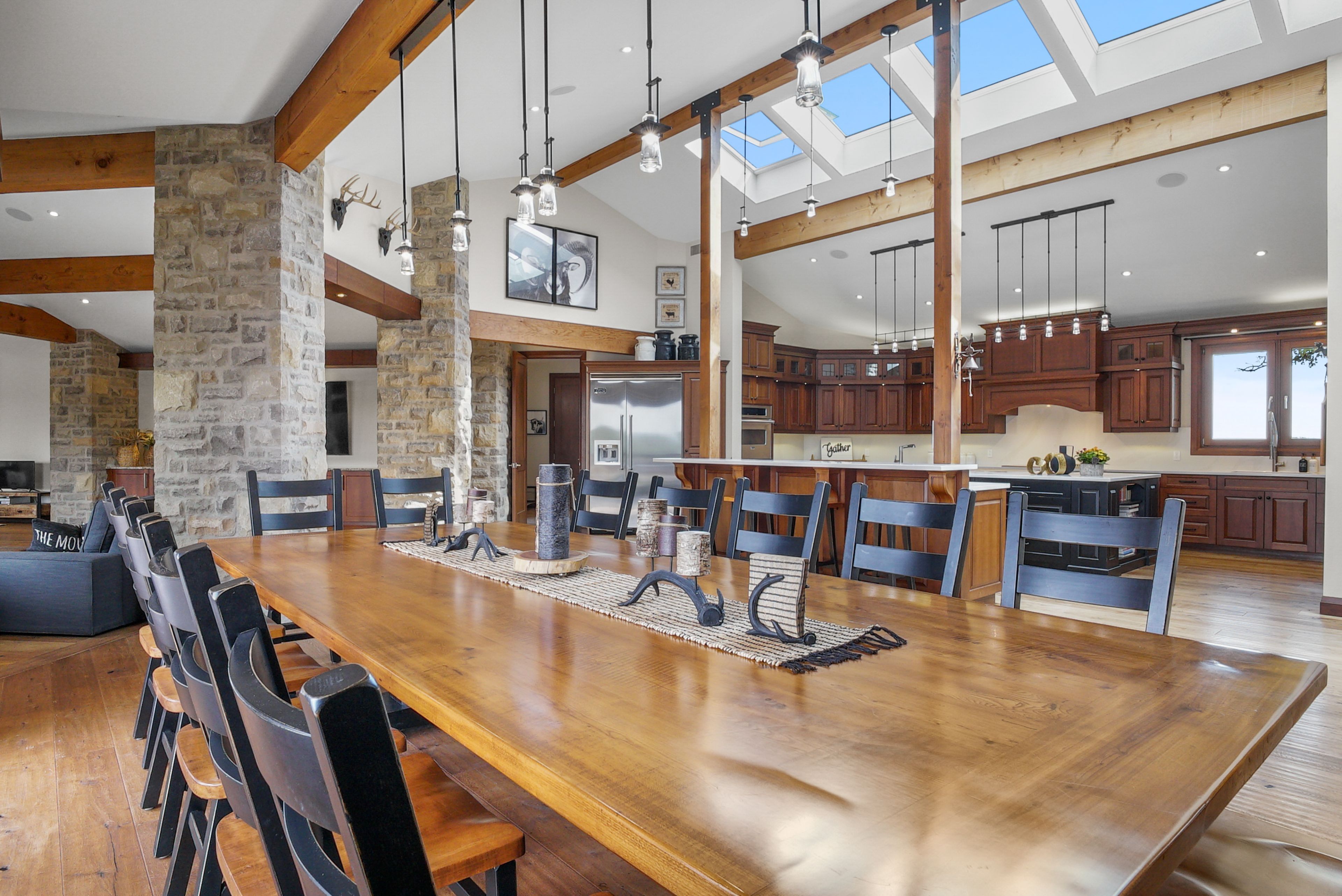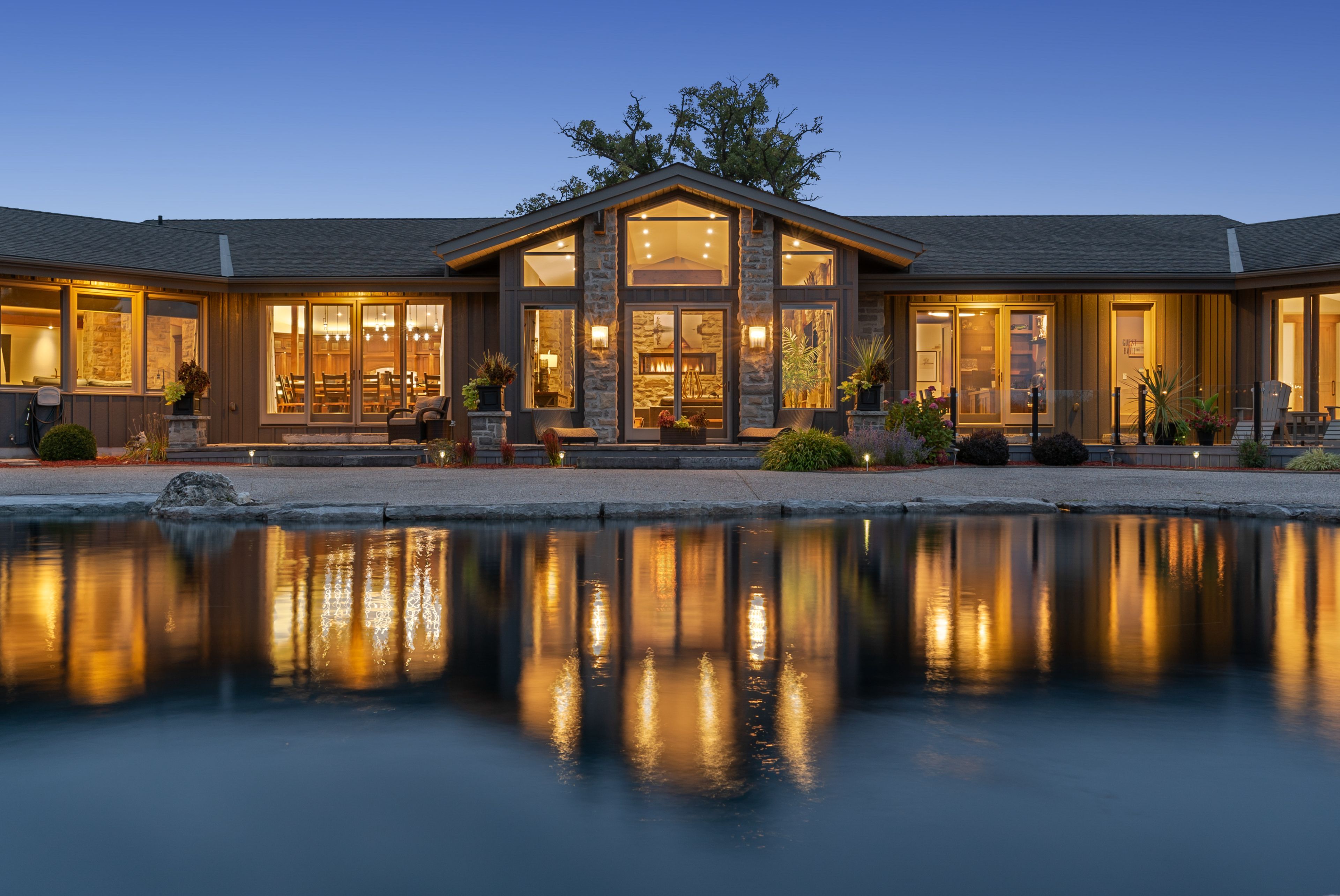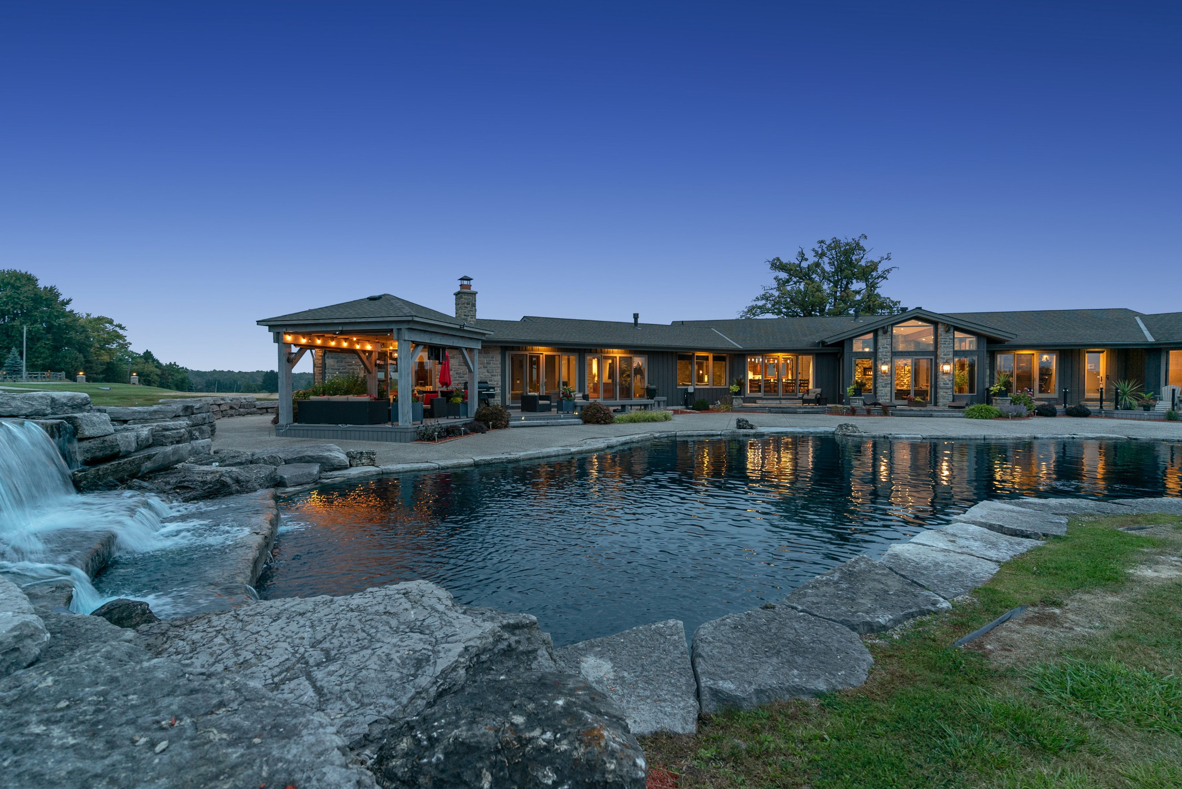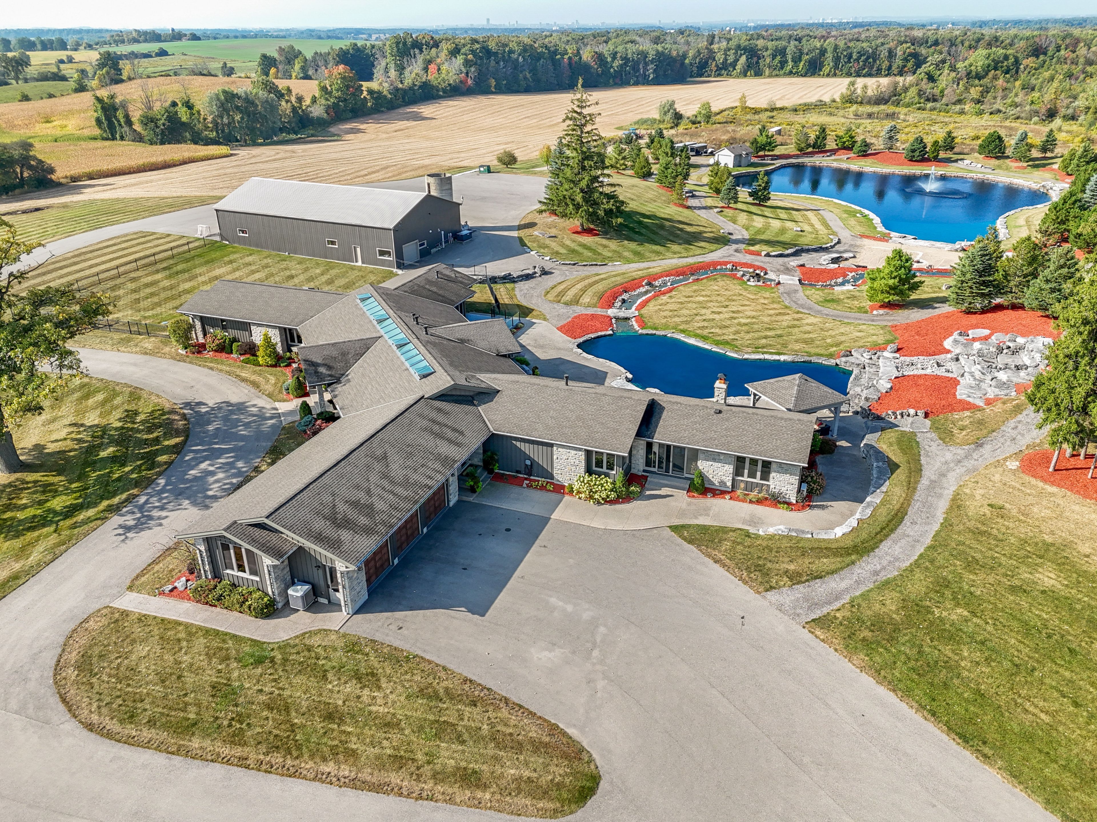 Set on over 120 acres of stunning countryside, this exceptional estate offers a rare combination of privacy, recreation, and luxury living, just minutes from cambridge, guelph, and kitchener-waterloo. The property is designed for year-round enjoyment, featuring two incredible ponds -one a swim pond perfect for cooling off on warm summer days, and the other a stocked fishing pond with a sandy beach and waterfall, creating a truly resort-like setting at home. Scenic trails wind throughout the property, offering endless opportunities to explore, relax, and enjoy the peaceful natural surroundings. The property also includes a heated 4,000 sq. Ft. Detached building with in-floor heating, offering incredible versatility for a workshop, car collection, equipment storage, hobby space, or recreational use. The custom-built stone bungalow offers an impressive 10,454 sq. Ft. Of finished living space, including 6,505 sq. Ft. On the main floor and a fully finished 3,949 sq. Ft. Lower level. Inside, soaring ceilings, skylights, and hand-chipped stone accents create a warm and inviting atmosphere, while natural wood details add character throughout. At the heart of the home is a spectacular gourmet kitchen featuring viking professional appliances, silestone quartz countertops, striking douglas fir beams, and dual islands designed for gathering and entertaining. The spacious dining area seats 14 and overlooks the picturesque ponds and surrounding landscape. An indoor grilling area with heated floors makes entertaining effortless in every season. The primary suite is a private retreat with direct access to the swim pond and a spa-like ensuite complete with a jacuzzi tub beside a cozy gas fireplace. The fully finished lower level is designed for relaxation and entertaining, offering a spacious recreation area, full bar, billiards space, wine cellar, and a private cinema room. A truly one-of-a-kind property where luxury living meets the beauty of nature.