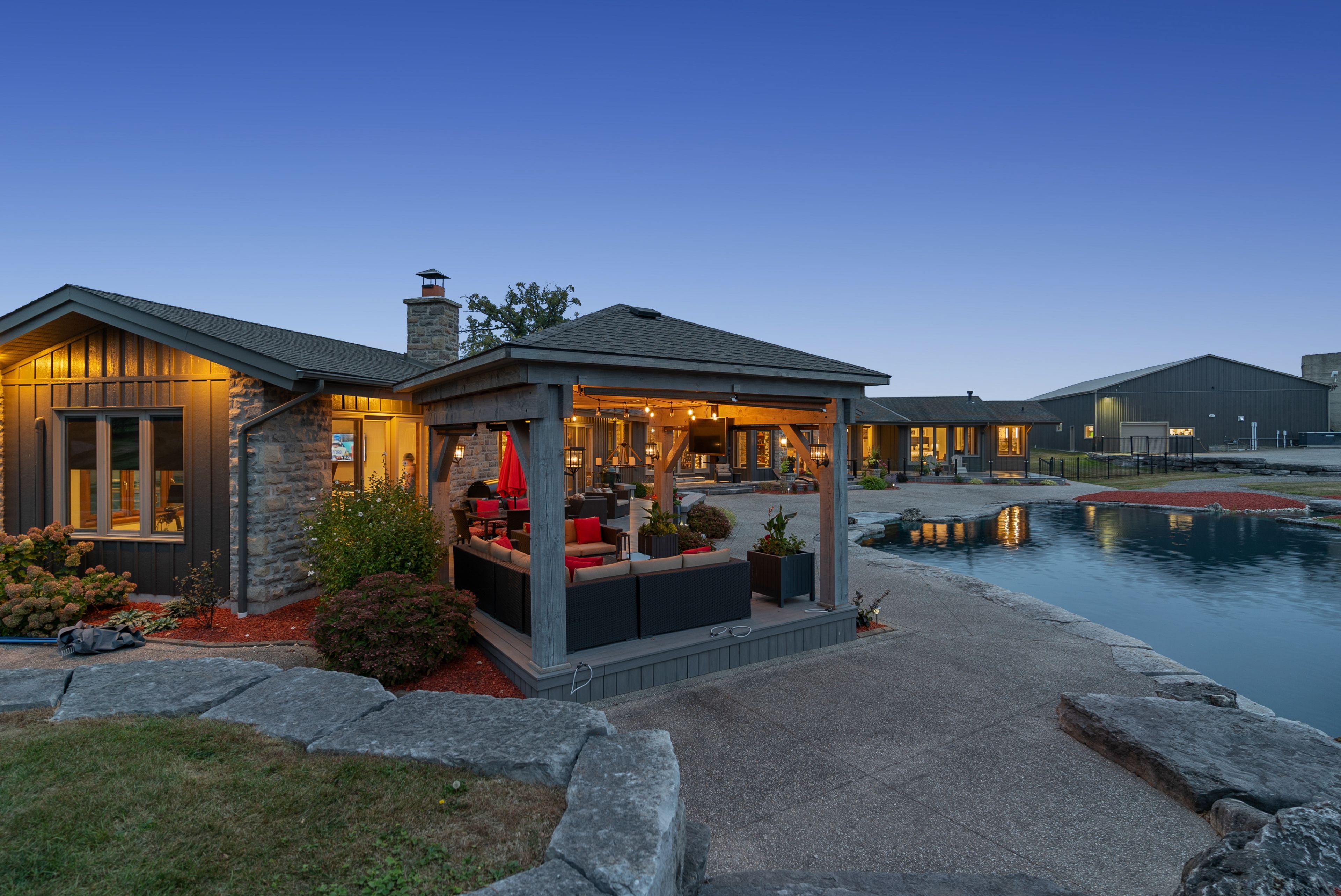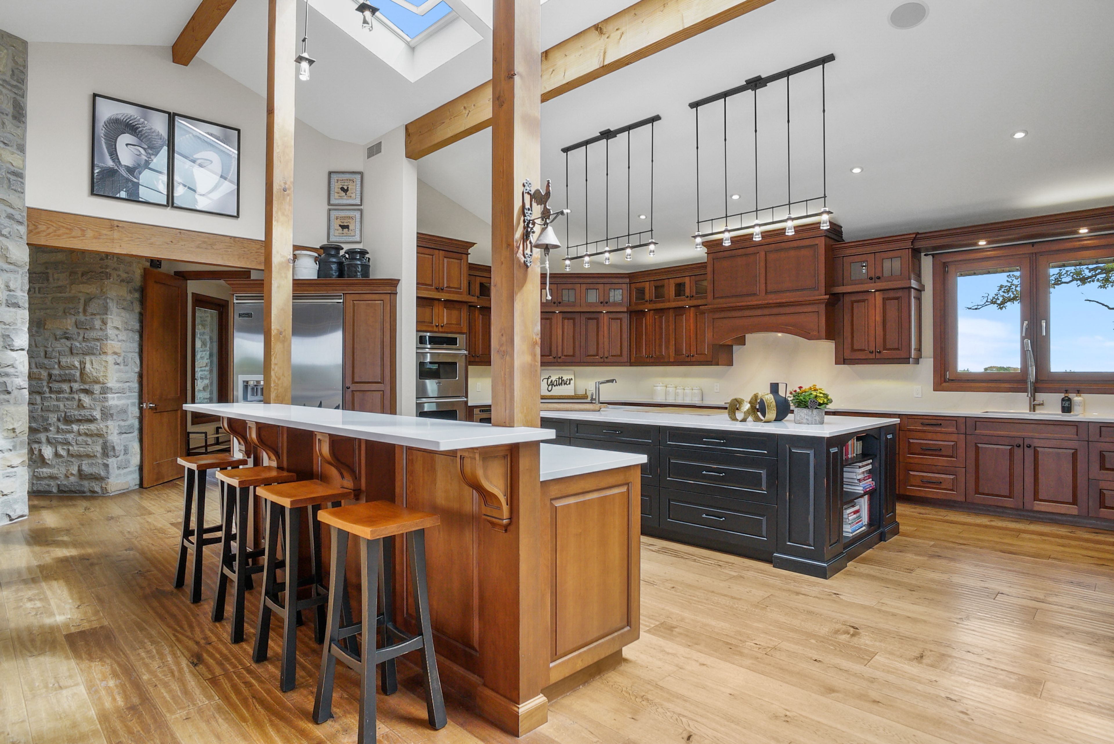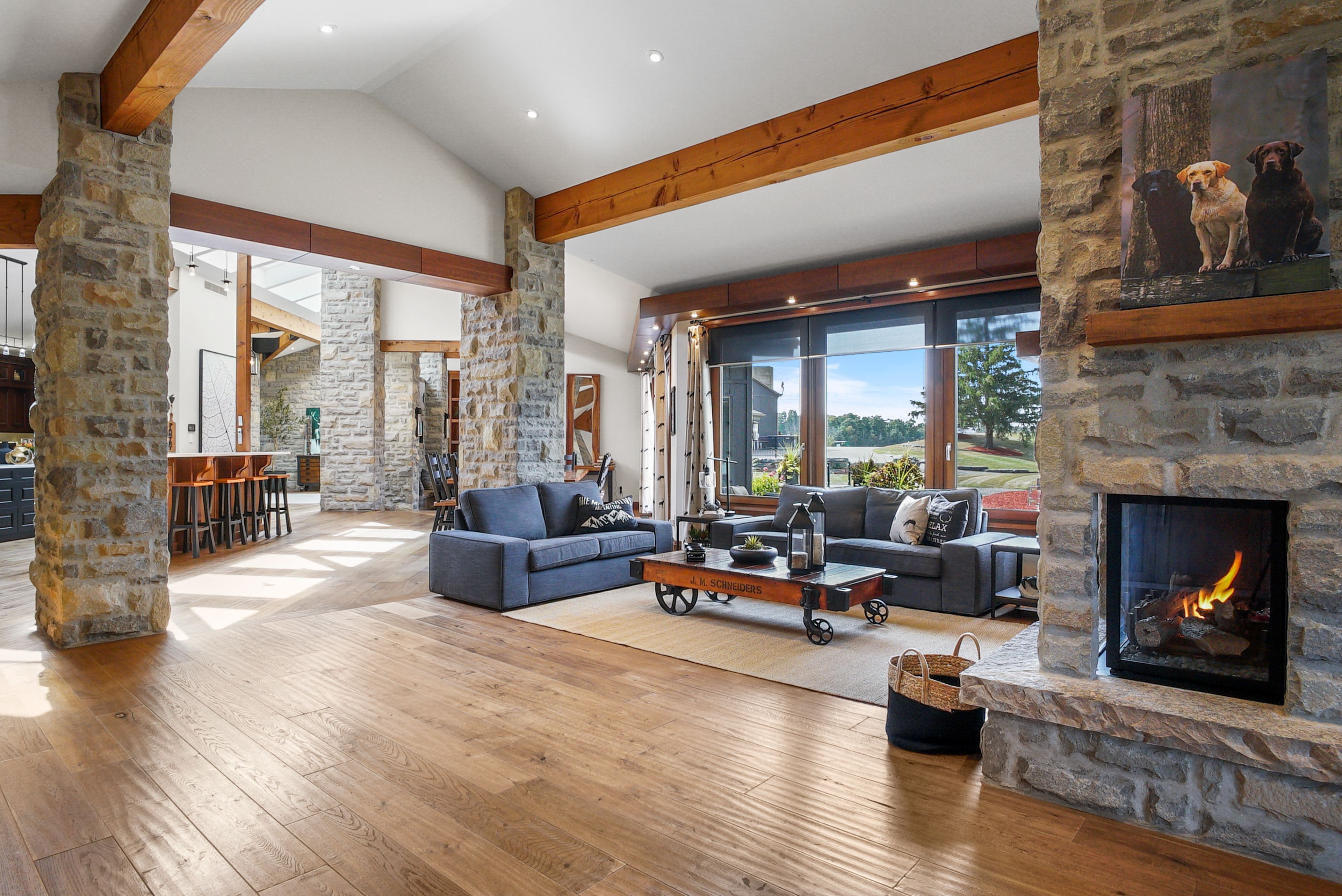 Set on over 120 acres of stunning countryside, this exceptional estate offers a rare combination of privacy, recreation, and luxury living, just minutes from cambridge, guelph, and kitchener-waterloo. The property is designed for year-round enjoyment, featuring two incredible ponds -one a swim pond perfect for cooling off on warm summer days, and the other a stocked fishing pond with a sandy beach and waterfall, creating a truly resort-like setting at home. Scenic trails wind throughout the property, offering endless opportunities to explore, relax, and enjoy the peaceful natural surroundings. The property also includes a heated 4,000 sq. Ft. Detached building with in-floor heating, offering incredible versatility for a workshop, car collection, equipment storage, hobby space, or recreational use. The custom-built stone bungalow offers an impressive 10,454 sq. Ft. Of finished living space, including 6,505 sq. Ft. On the main floor and a fully finished 3,949 sq. Ft. Lower level. Inside, soaring ceilings, skylights, and hand-chipped stone accents create a warm and inviting atmosphere, while natural wood details add character throughout. At the heart of the home is a spectacular gourmet kitchen featuring viking professional appliances, silestone quartz countertops, striking douglas fir beams, and dual islands designed for gathering and entertaining. The spacious dining area seats 14 and overlooks the picturesque ponds and surrounding landscape. An indoor grilling area with heated floors makes entertaining effortless in every season. The primary suite is a private retreat with direct access to the swim pond and a spa-like ensuite complete with a jacuzzi tub beside a cozy gas fireplace. The fully finished lower level is designed for relaxation and entertaining, offering a spacious recreation area, full bar, billiards space, wine cellar, and a private cinema room. A truly one-of-a-kind property where luxury living meets the beauty of nature.